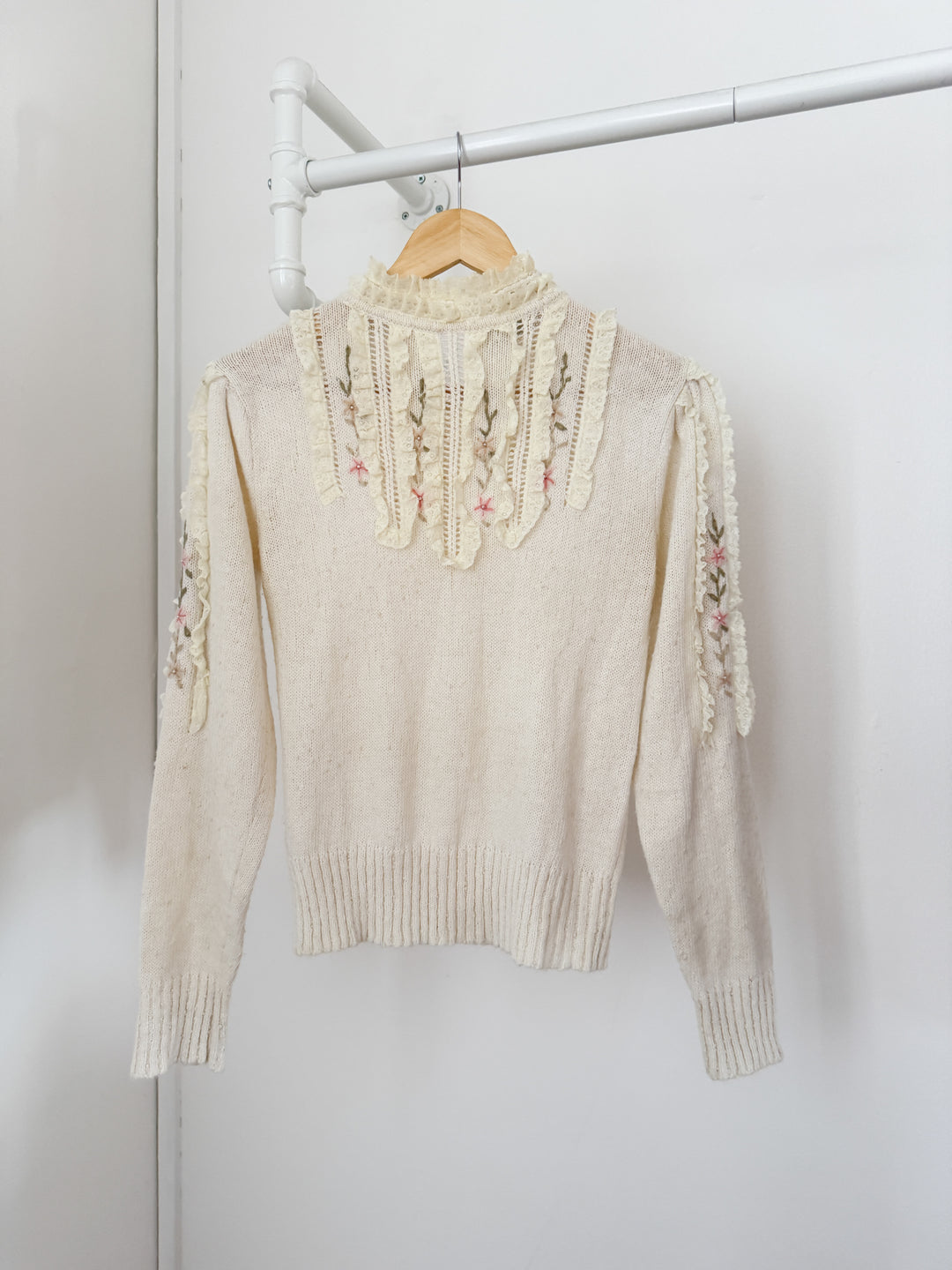 Beautiful Rare 1970s Puff Sleeve Lace Trimmed Embroidered Floral Sweater