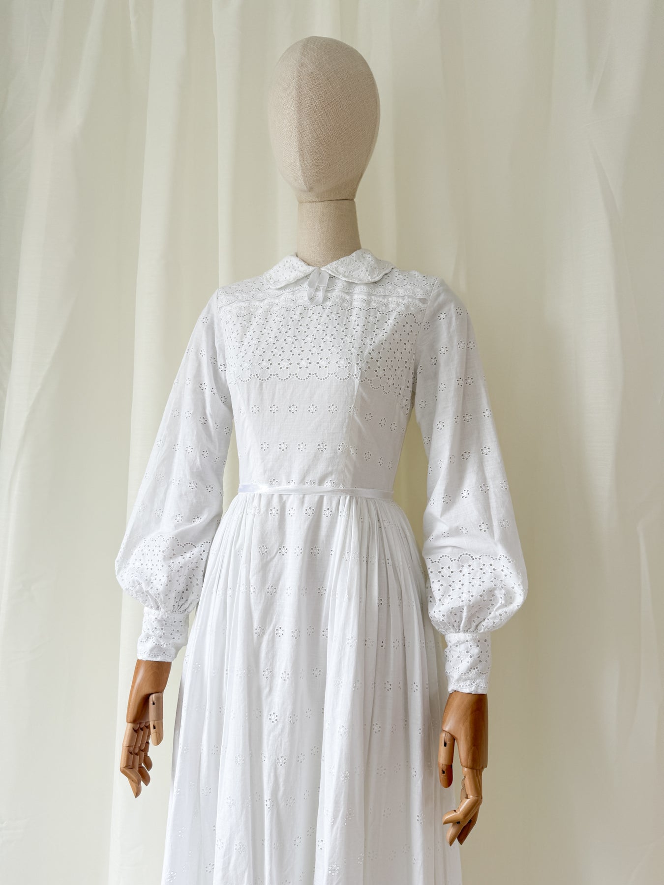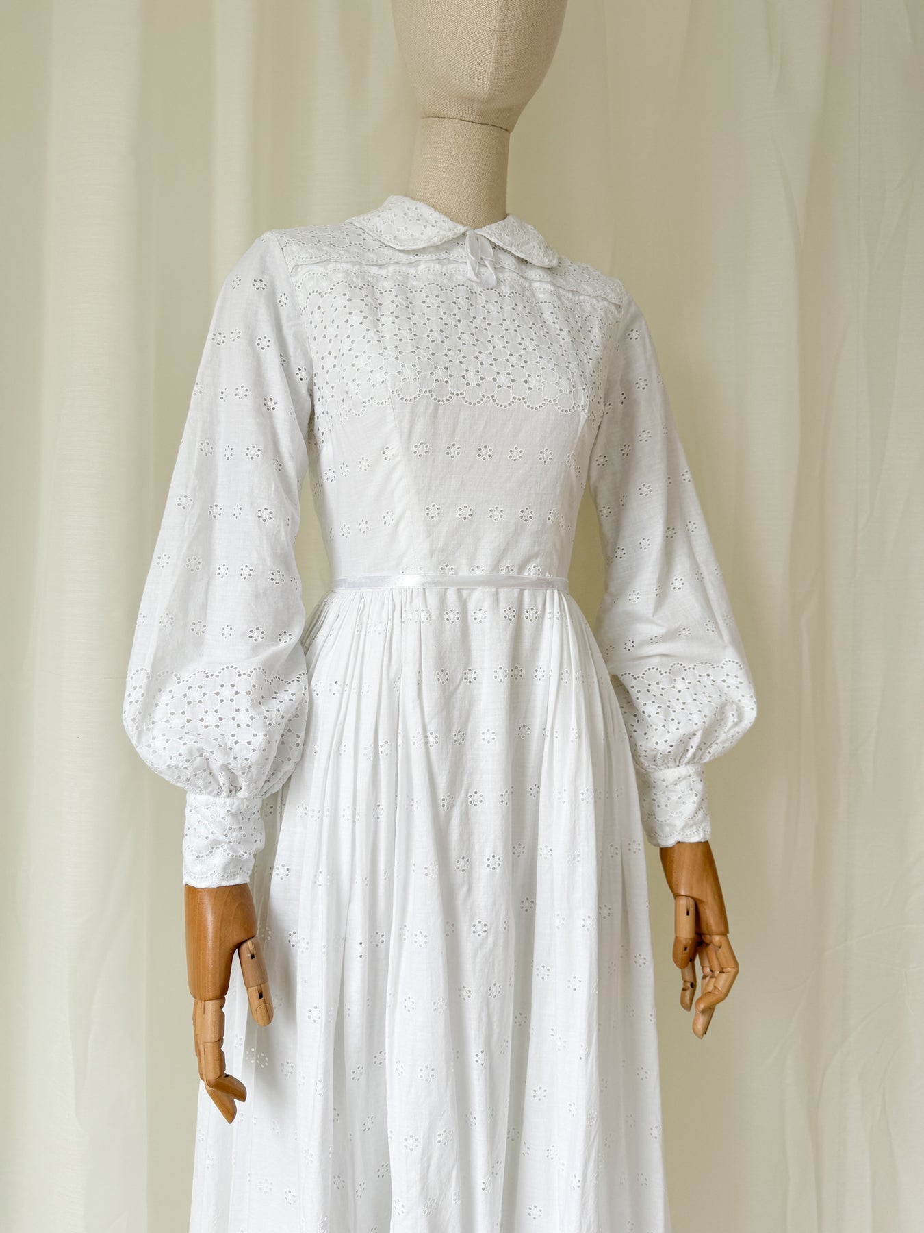 This heavenly 1970s heavy broderie anglaise cotton girl is simply adorable, with a sweet peter pan collar, voluminuous cuffed sleeves and a beautiful full skirt. Her fabric is just divine and so detailed, and her waist is trimmed with the sweetest ribbons. When worn she will be simply the cutest.