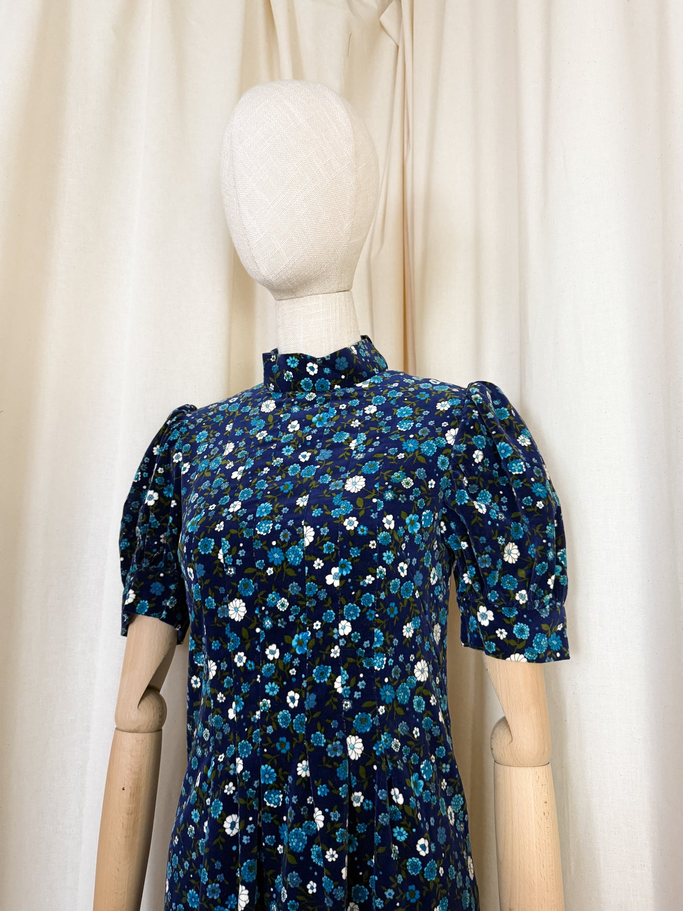 An extraordinary 1960s velvet maxi dress in a beautiful floral print, crafted from sumptuous cotton velvet. Statement puff sleeves and a refined high collar define the silhouette, and she is one of those adorable pieces to cherish forever.