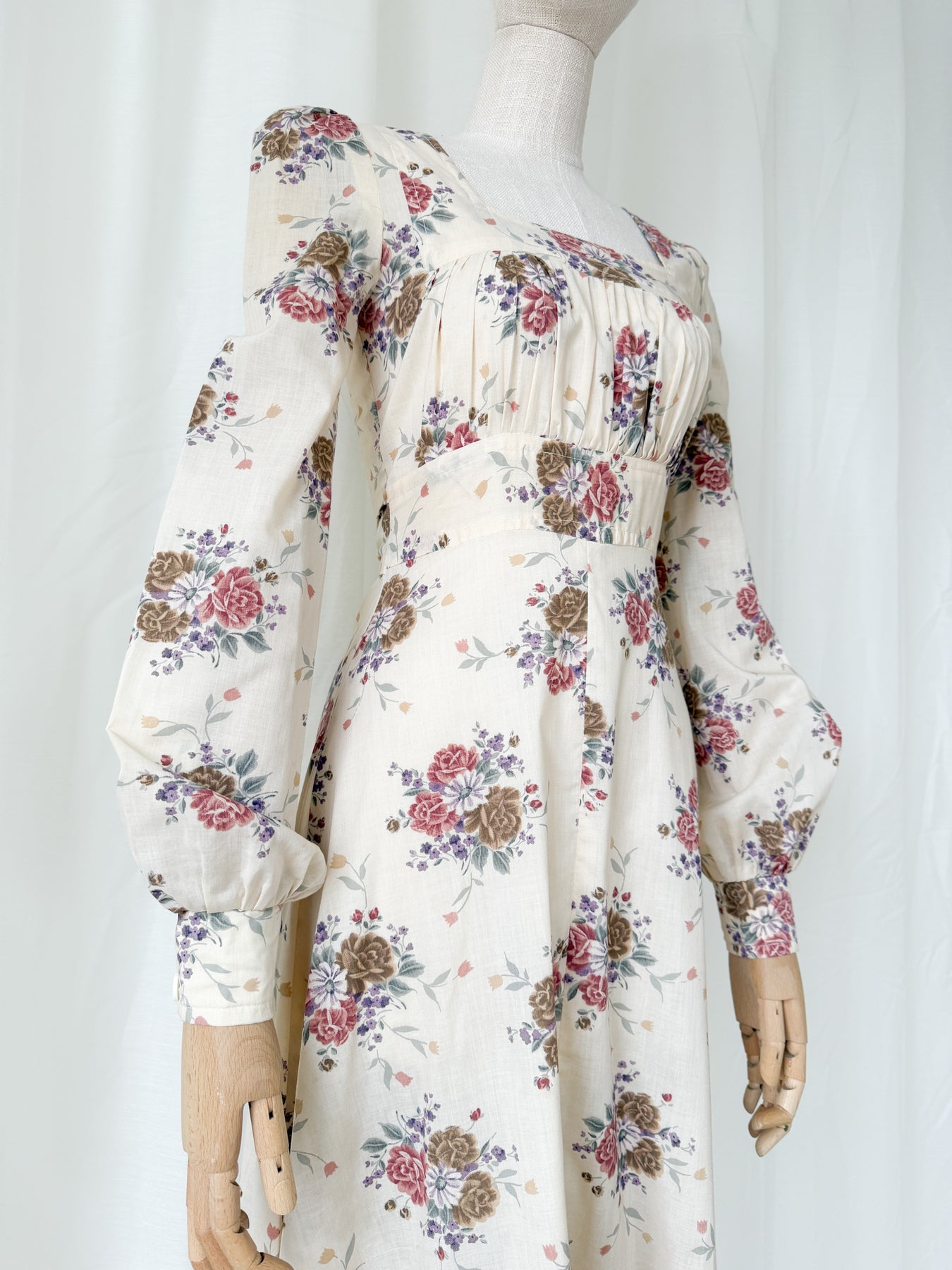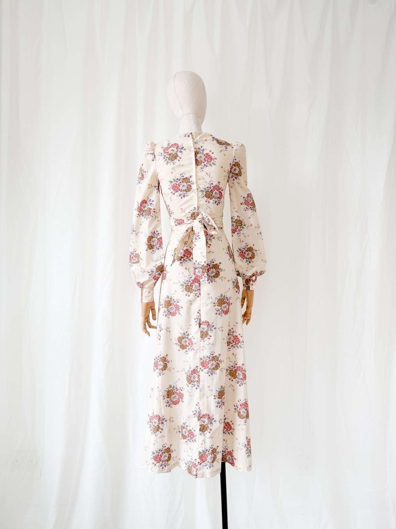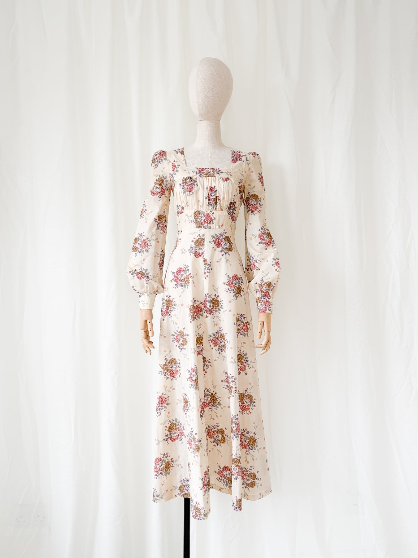 Thus is an absolutely dreamy 1970s cotton delight by Shelena. This is literally spring in a dress, with a magical silhouette, beautiful square neck, dreamy sleeves, ruched bodice and a long flowing skirt with side ties to cinch! I love her rustic colour way with that romantic floral, when worn this dress looks magical, with a perfectly snatched silhouette.