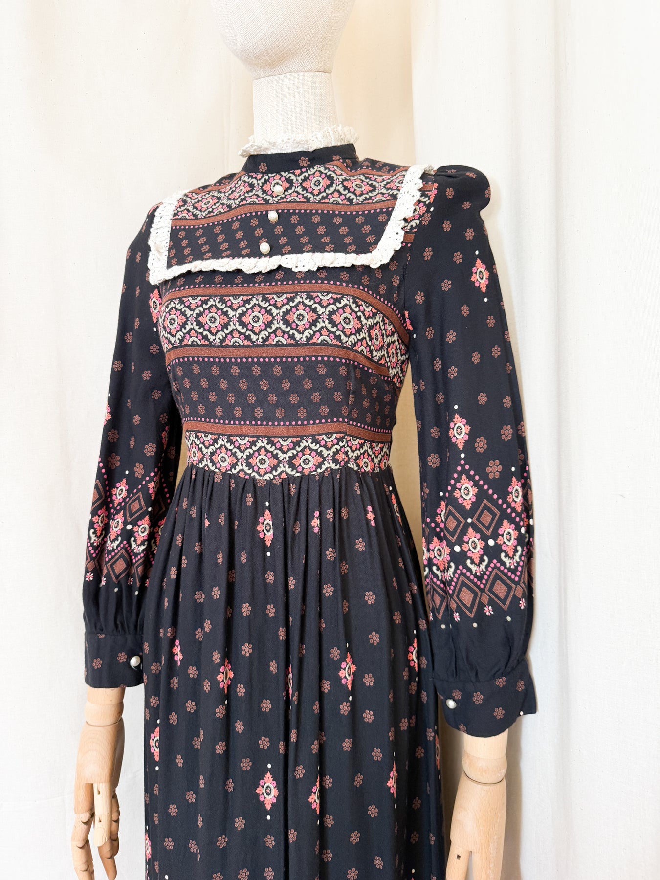 This divine 70s soft wool blend maxi dress featuring a black base with adorable floral and broderie frill detailing. Cuffed sleeves and a graceful flounced skirt create vintage charm and she truly is one of those precious pieces to wear season after season.