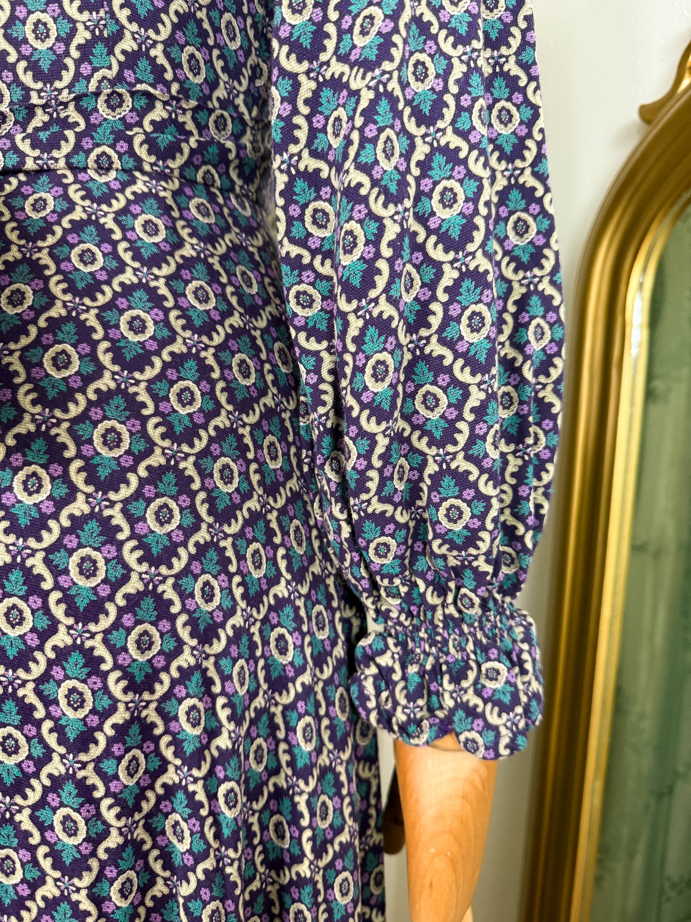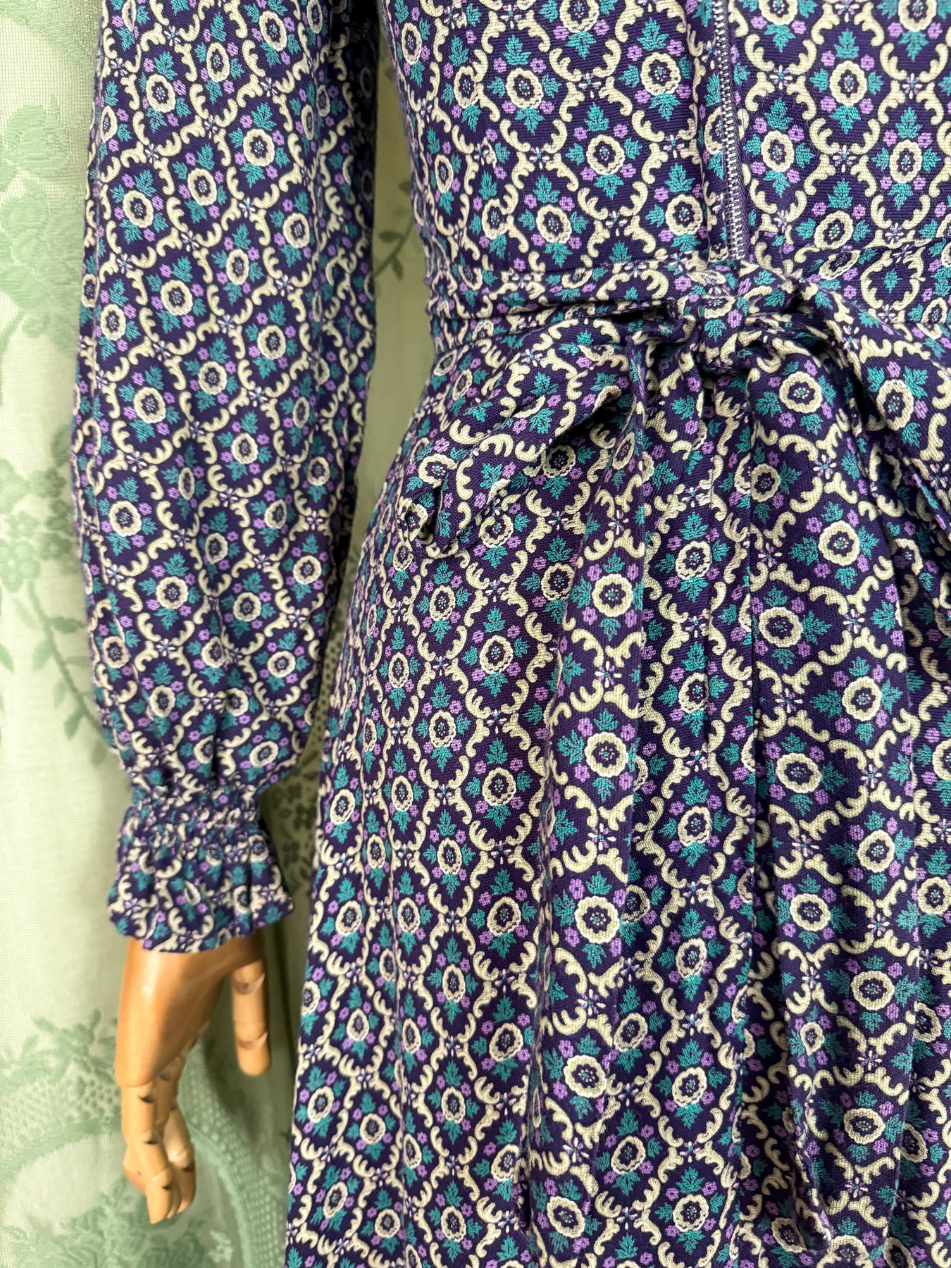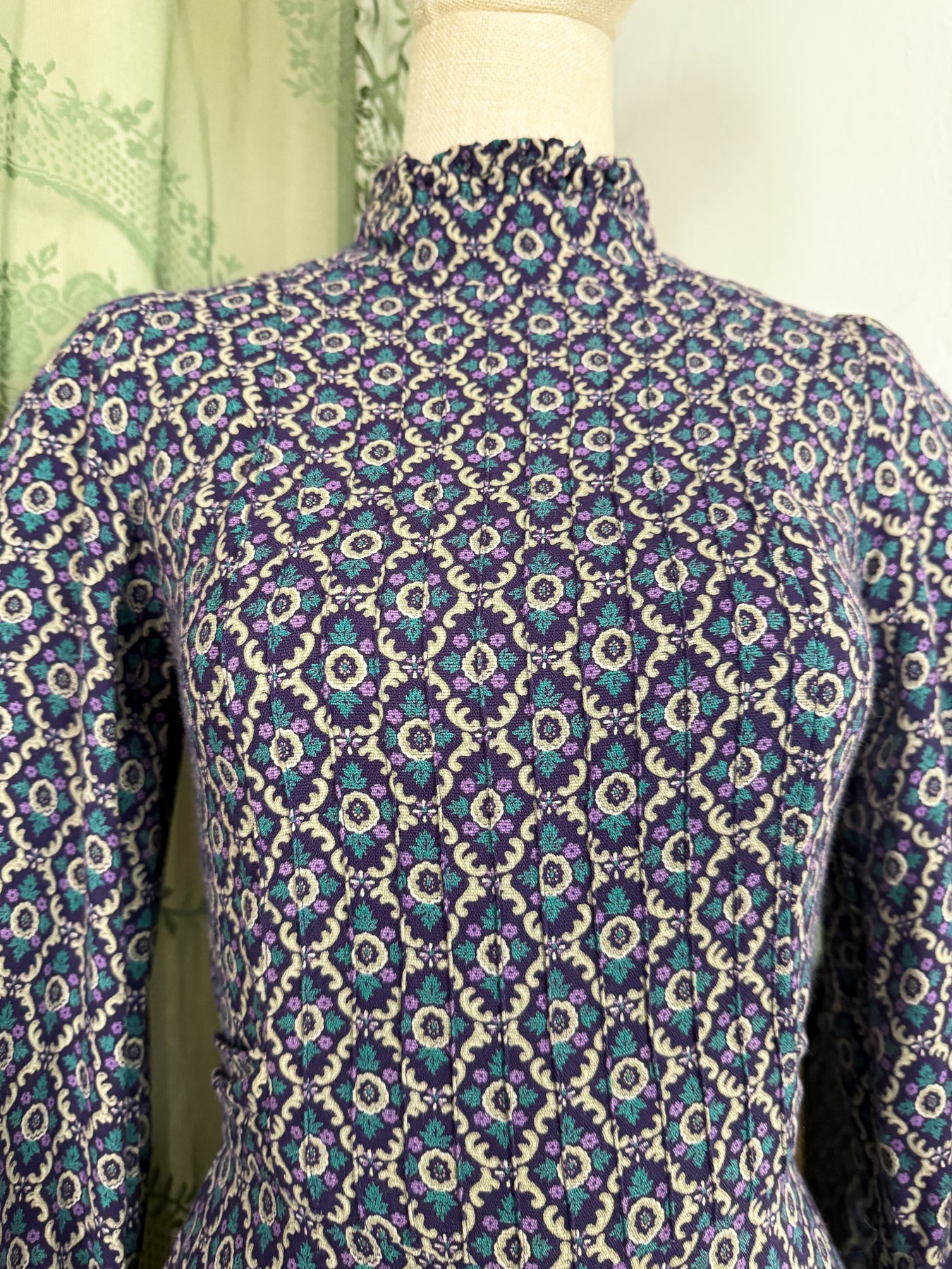 Step into a realm of vintage mystique with this rare 1970s wool blend maxi dress, adorned with an absolutely stunning unusual historical floral print that whispers secrets of the past. The finely crafted pin-tuck bodice and delicate frill cuff sleeves frame a hauntingly elegant silhouette, blending softness with spectral allure. Perfectly suited for layering with pendants and worn with boots, this dress captures a ghostly grace, wearable yet otherworldly, it invites you to embody a style both timeless and enchantingly enigmatic.