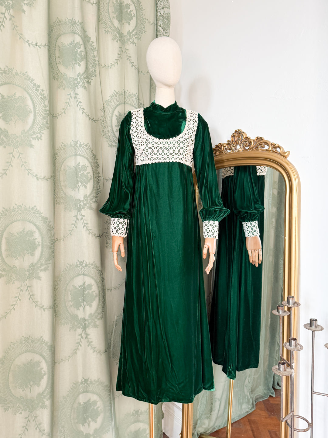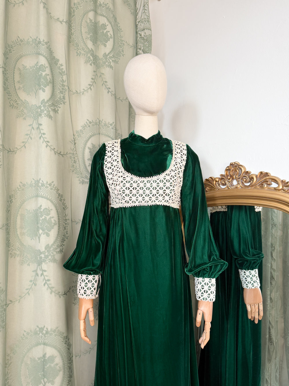 ELDERGROVE ~ INCREDIBLE LATE 1960S MEDIEVAL GREEN VELVET MAXI DRESS