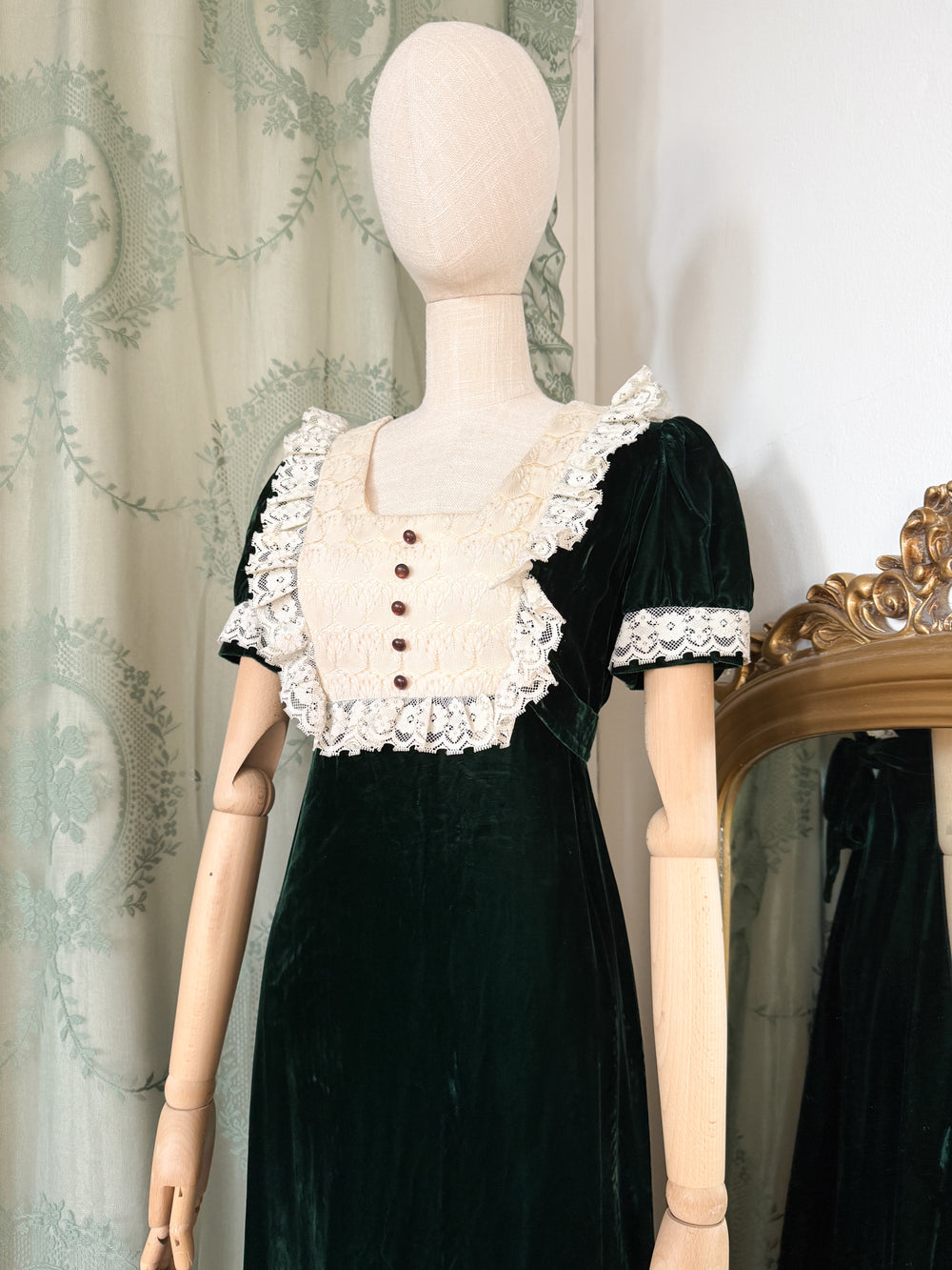POISON ~ HAUNTING RARE LATE 1960S GREEN VELVET LACE BIB MAXI DRESS