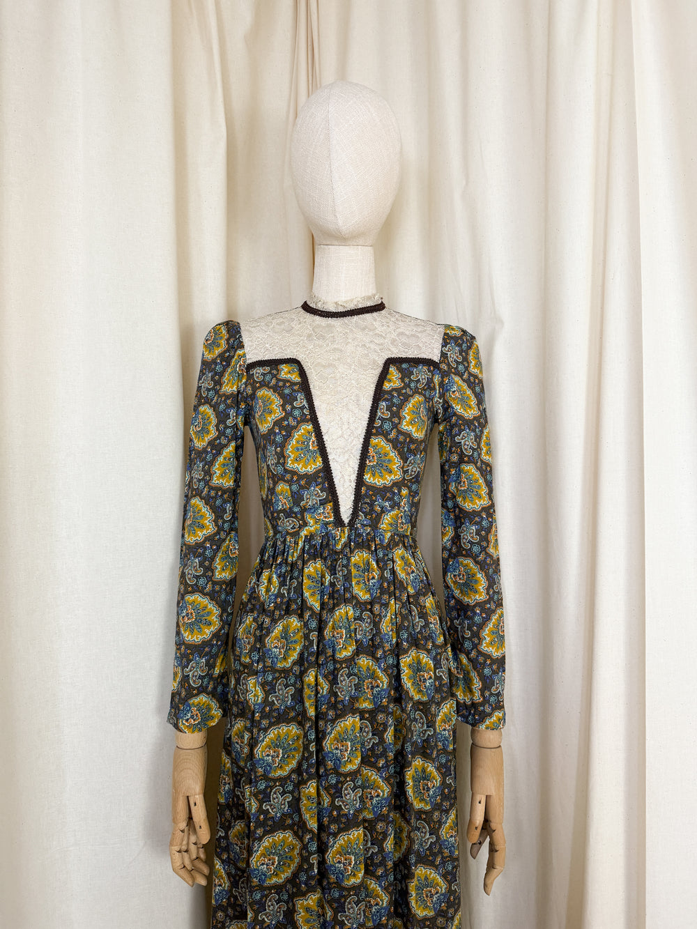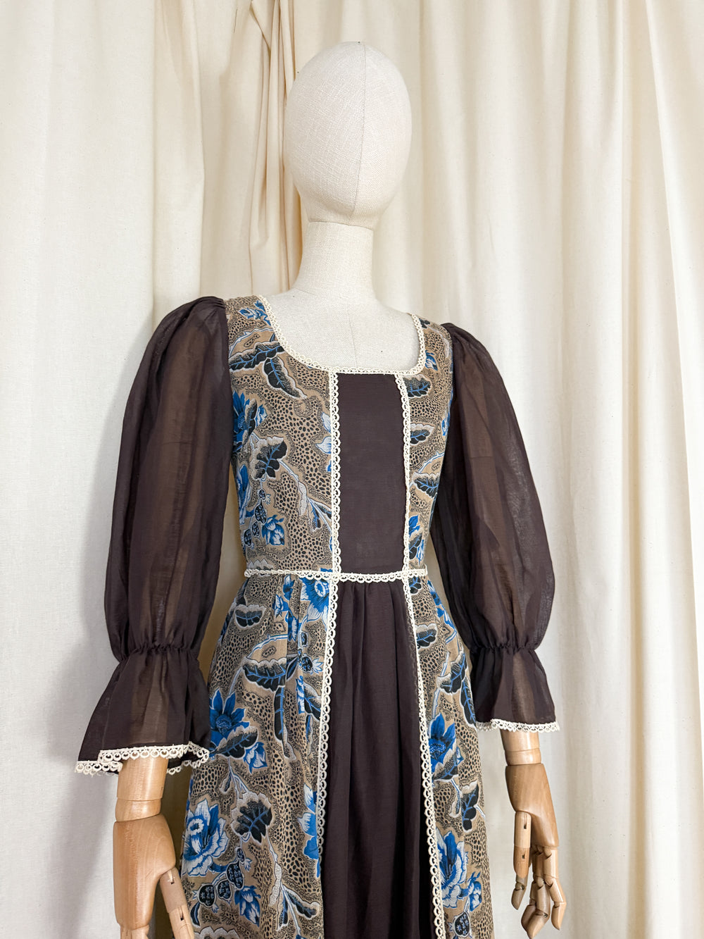 Stunning Rare Lace Panelled Brown 1970s Cotton Maxi Dress