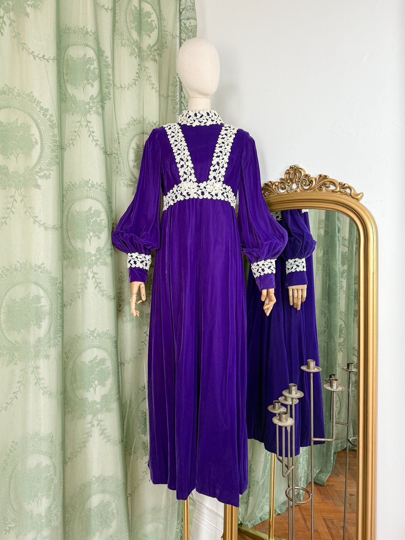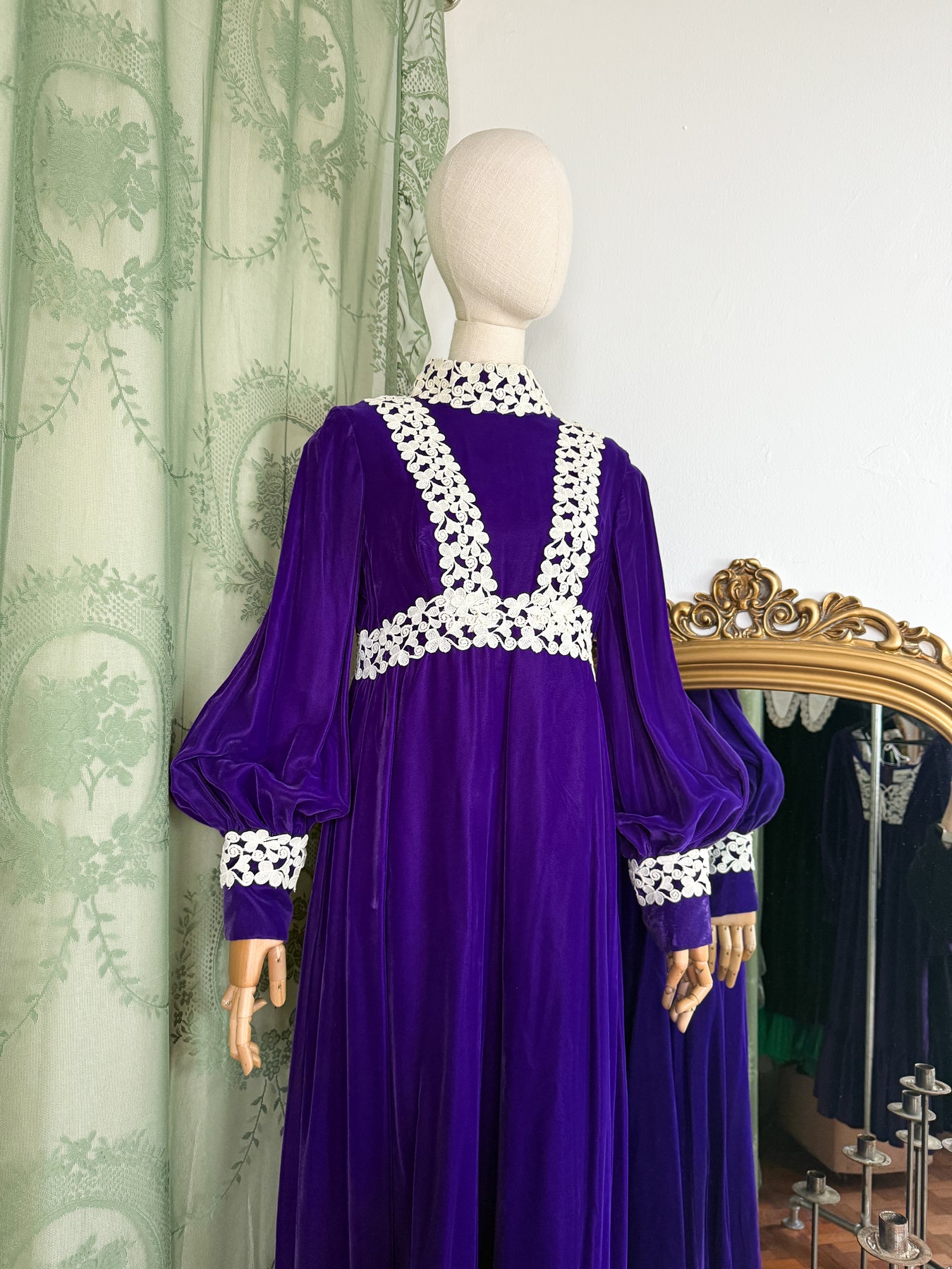 This rare late 1960s medieval revival velvet maxi dress mesmerises with its divine purple color and intricate lace placements. Featuring deep cuffed sleeves and a billowy silhouette, it evokes haunting and historical energy. Truly a precious one of a kind heirloom to cherish forever.