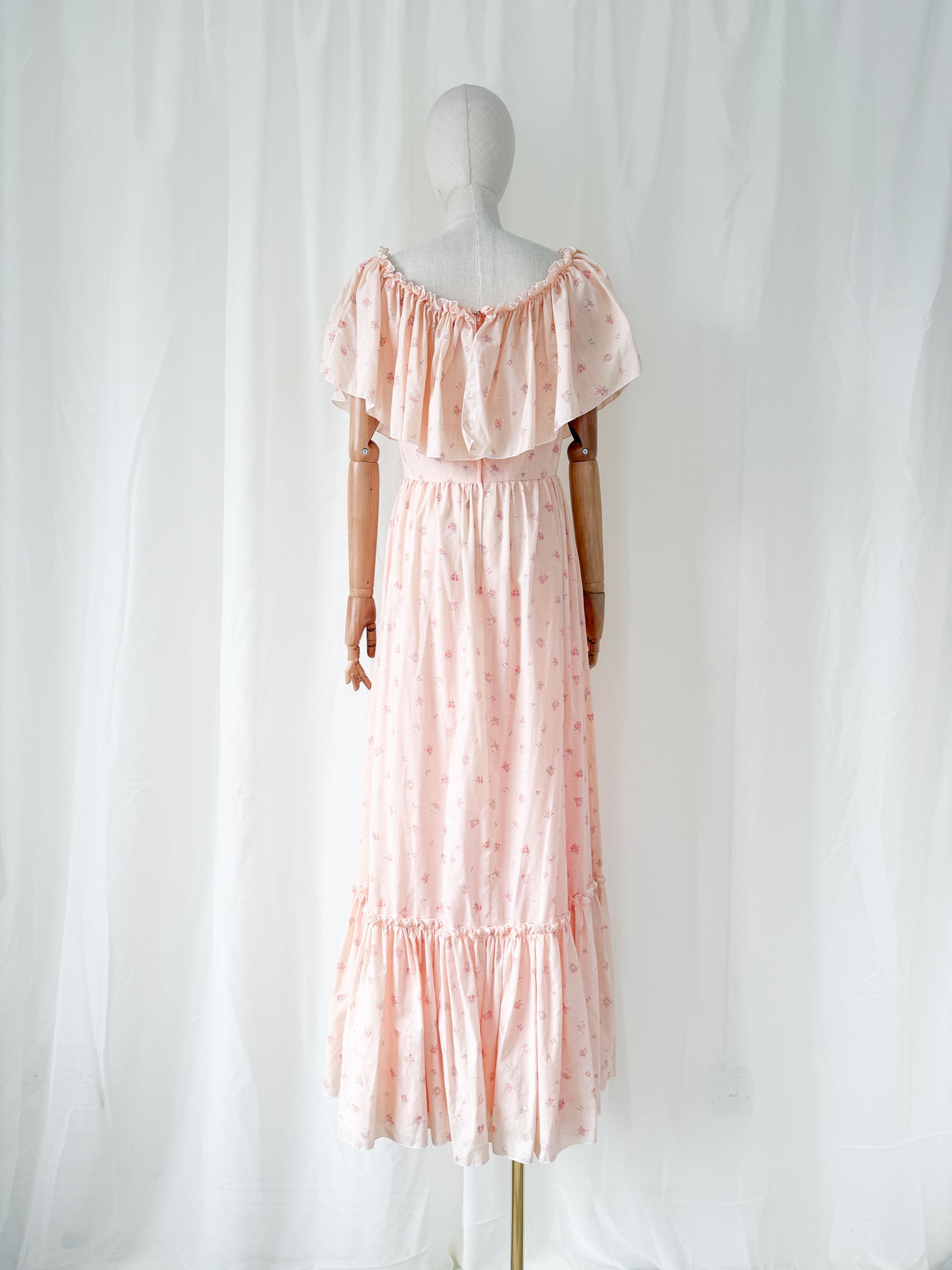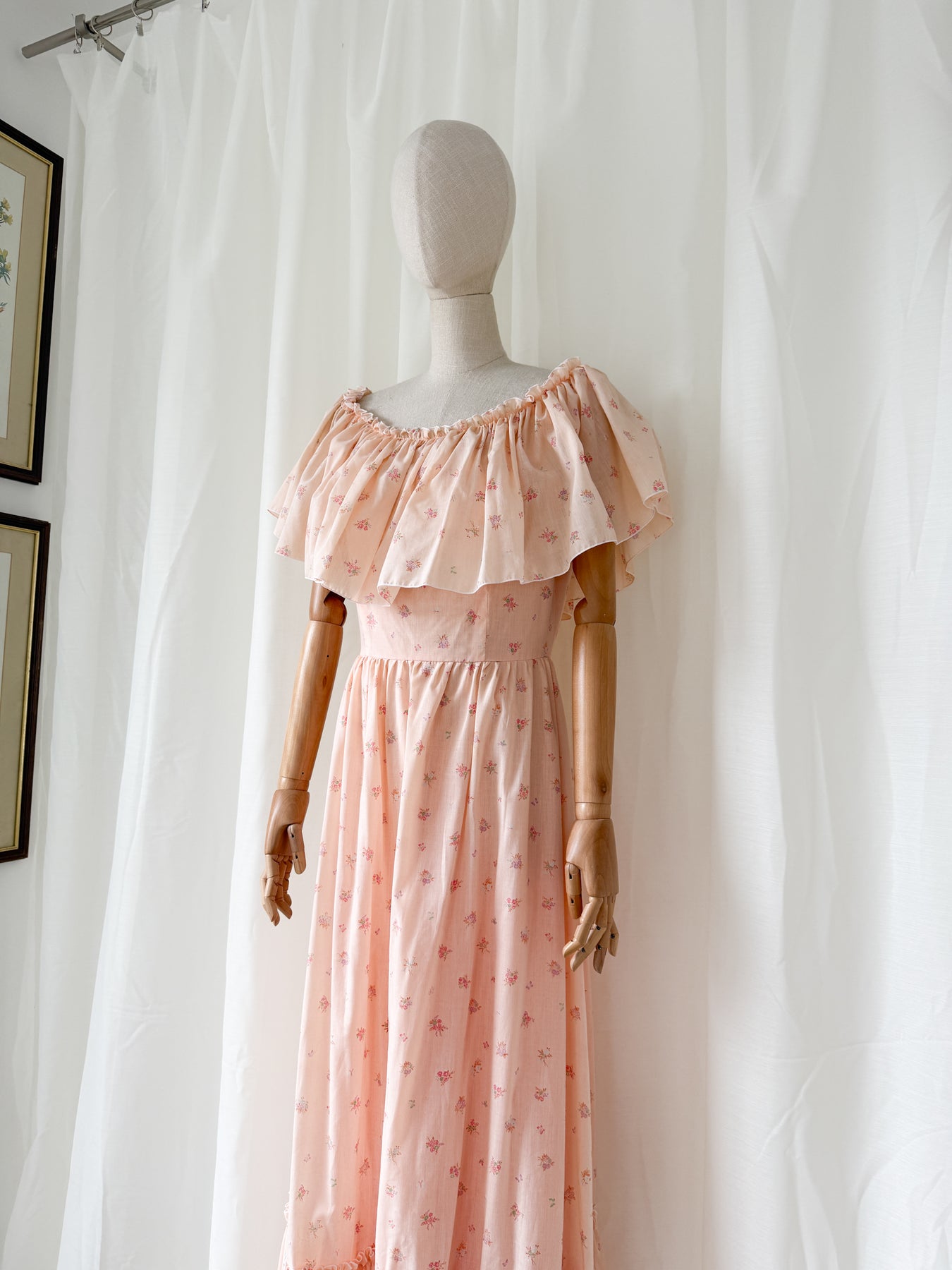 The prettiest peach... This precious 70s cotton romantic dream is simply stunning, with a big frill neckline which can be worn on or off the shoulder and the sweetest print, what is not to love?