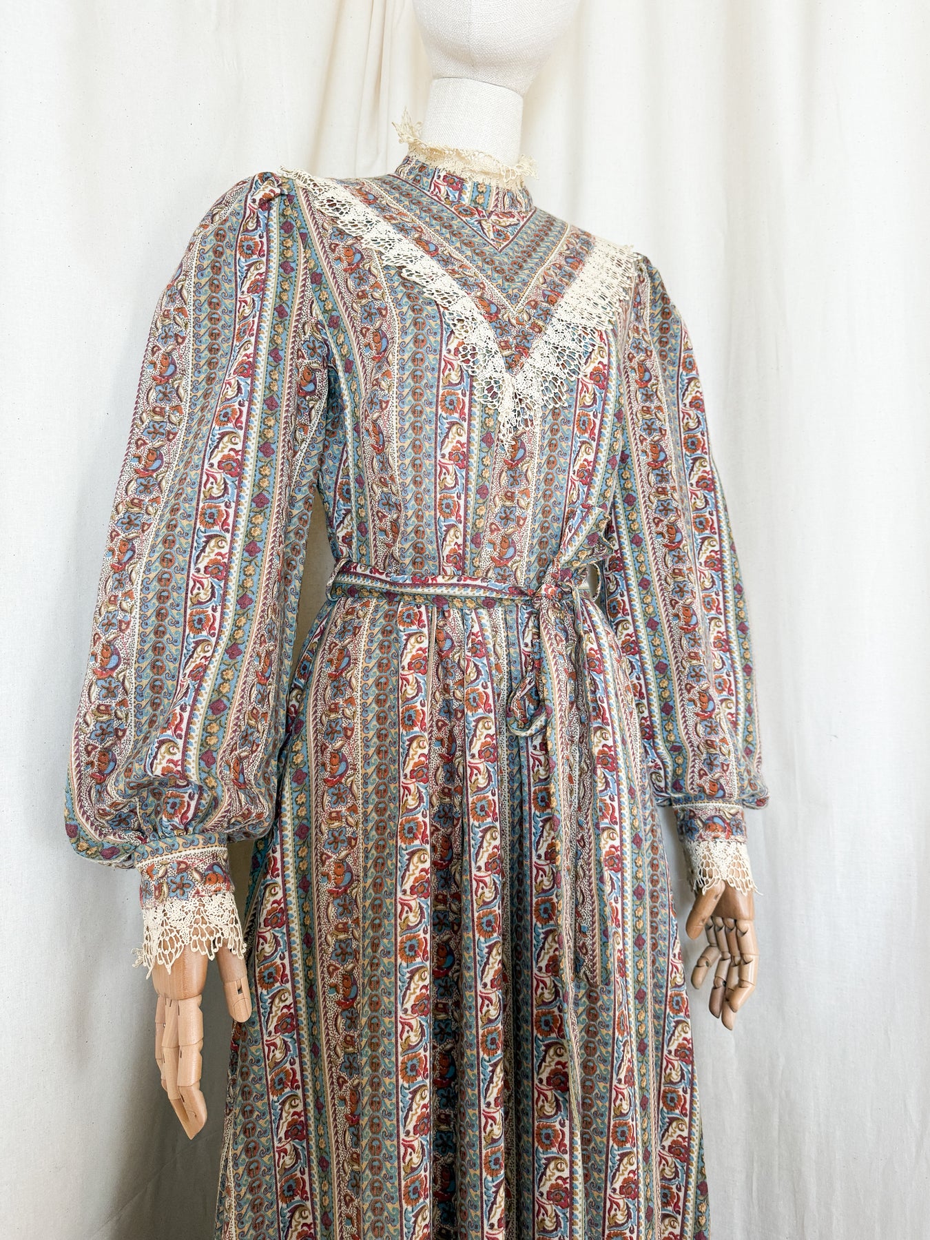A true winters dream, this fine wool 70s maxi dress is a precious find and is trimmed with beautiful lace detailing. She has a stunning chintzy floral print in a beautiful winter berry palette, voluminous sleeves, high collar and a flowing skirt. She is the perfect piece to wear and cherish for seasons to come..