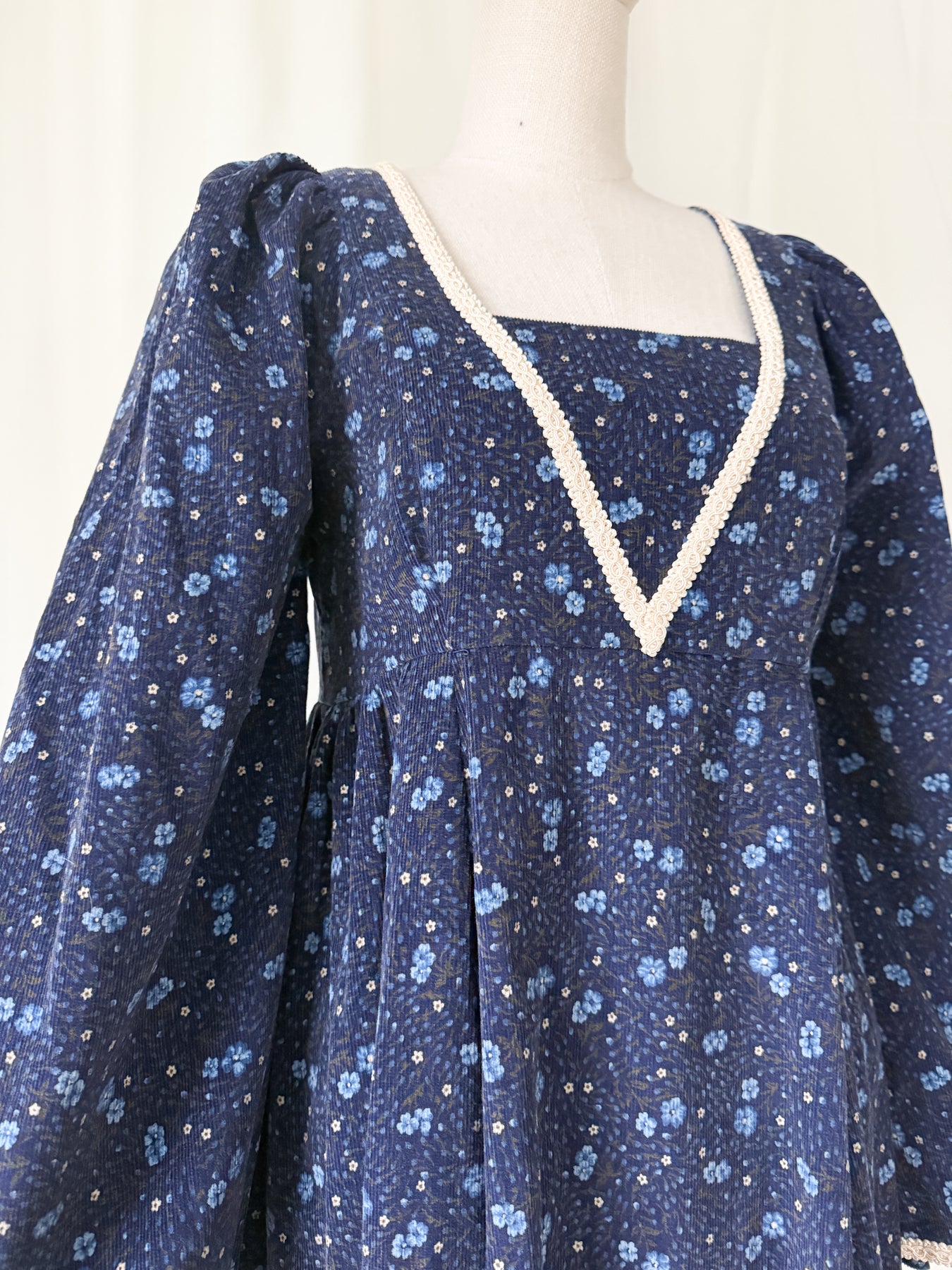 A medieval dream! This precious crafted to perfection, one of a kind cotton needlecord beauty is insane, just look at those flared sleeves and her bodice braid detailing. She has the most divine blue hues with delicate floral and is just simply a beaut! She is one of those precous pieces you will never see again..