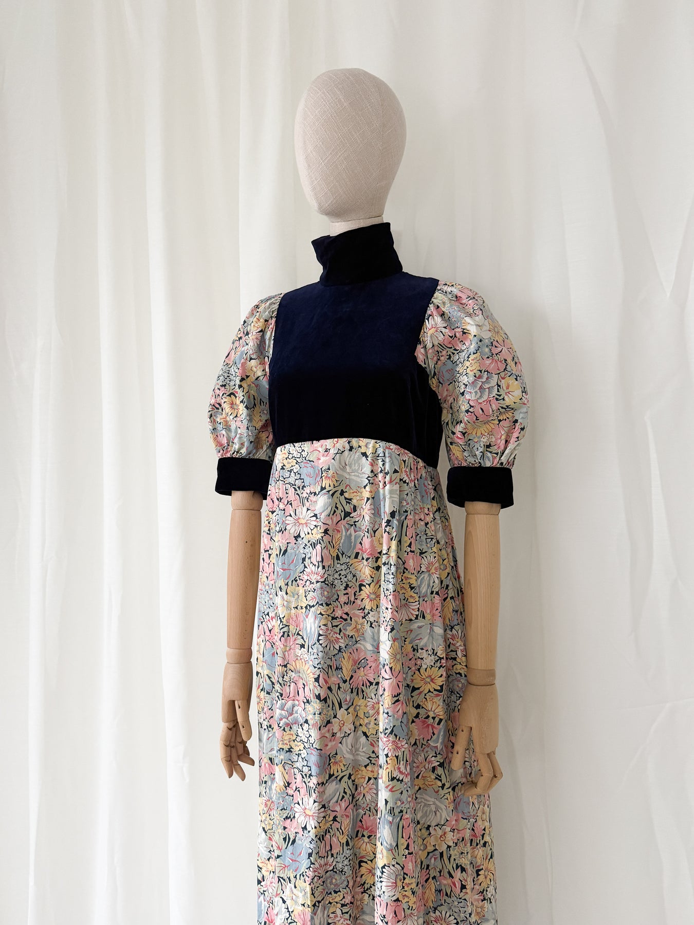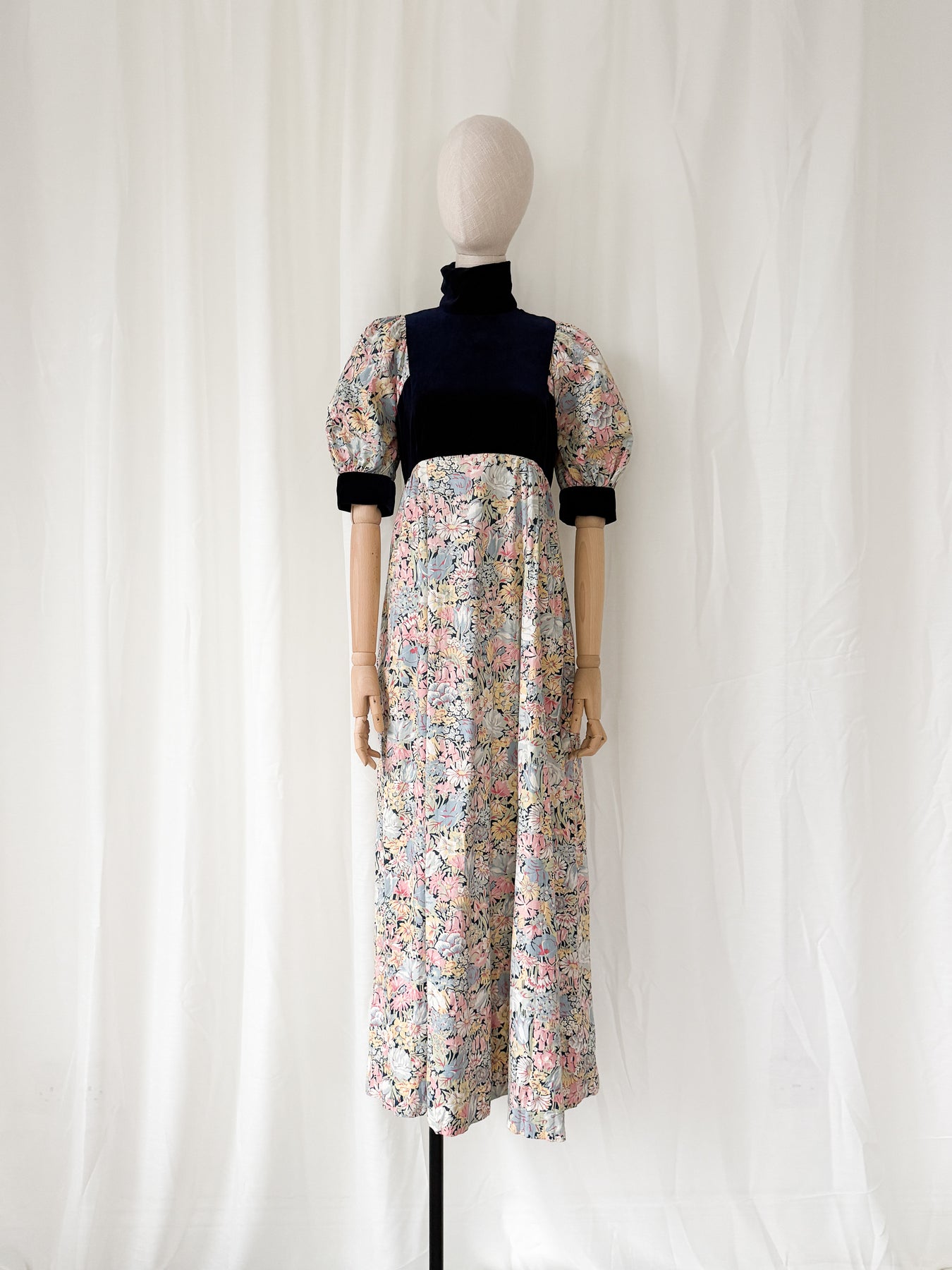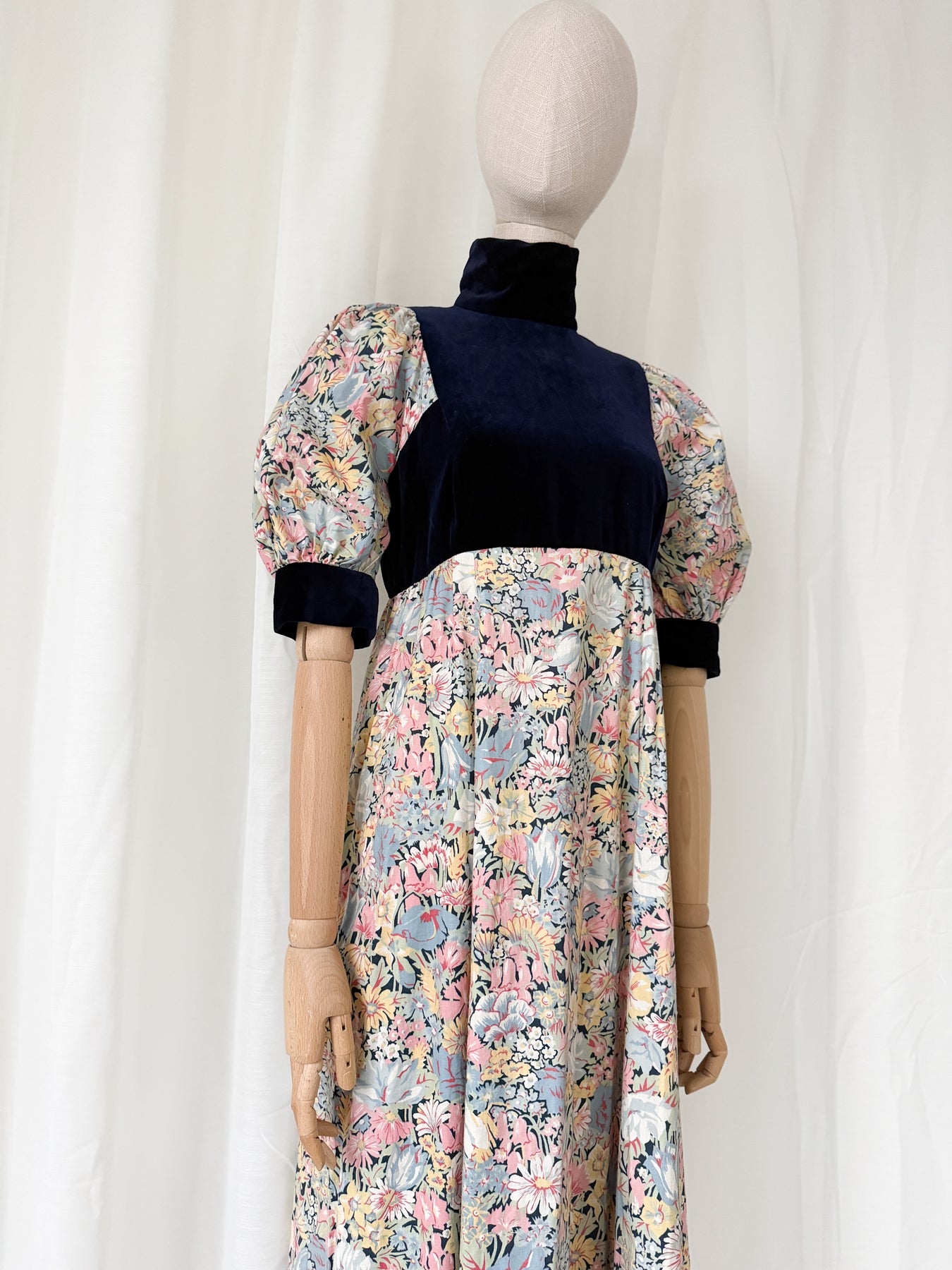 This is the kind of vintage dress I will forever love. She has the most incredible navy velvet cotton bodice with stunning contrast cotton floral print, and the most incredible cut with gorgeous puff sleeves. She is unique and looks so beautiful when worn.