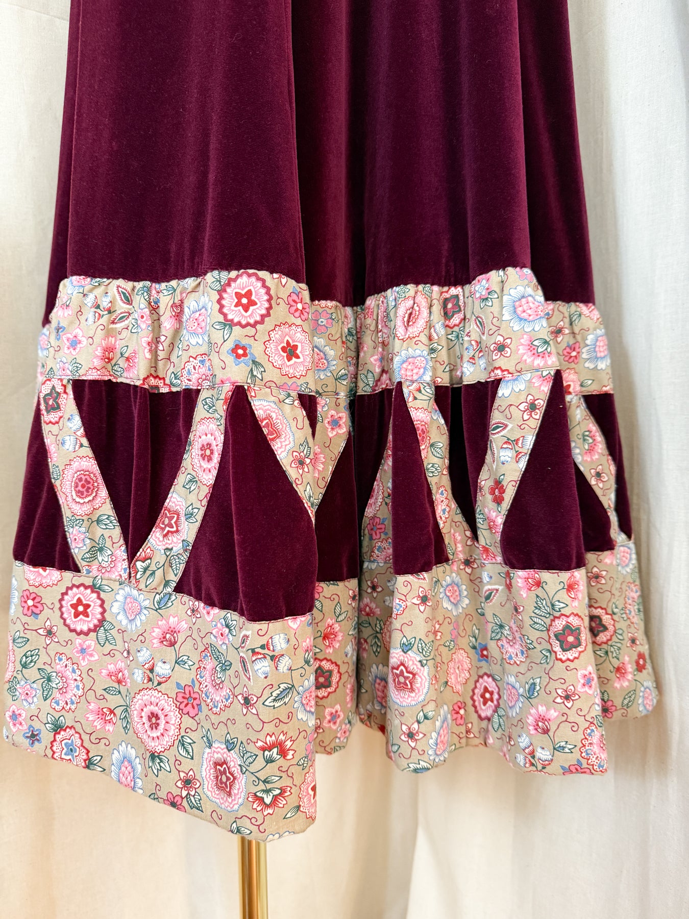 The rarest of them all, this precious museum-quality specimen by Valerie Goad is truly one of my most precious finds to date. Crafted in sumptuous burgundy velvet, the gown showcases exquisite cotton patchwork floral appliqués that exemplify the era's artisanal approach. The dramatic plunge neckline and voluminous puff sleeves frame the silhouette with theatrical elegance, whilst the expansive sweeping skirt creates an unforgettable presence. A true investment piece and something to cherish forever and ever.