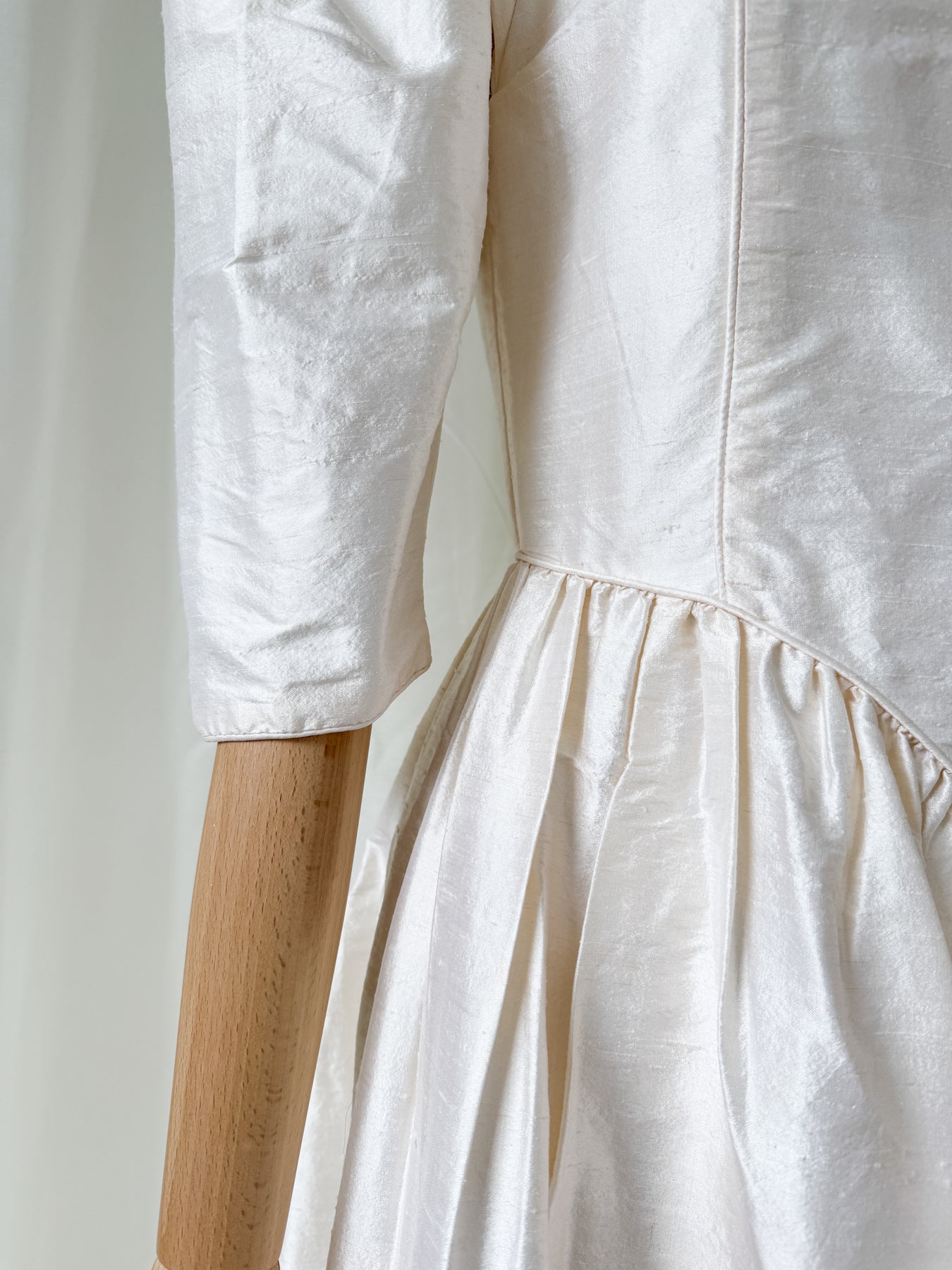This precious rare 1980s Laura Ashley raw silk beauty is simply divine. She has a beautiful cream hue and her silk is wonderfully slubby. Her fit is a dream with cropped puff mutton sleeves and a princess waistline. She is truly something so special and will look beautiful when worn.