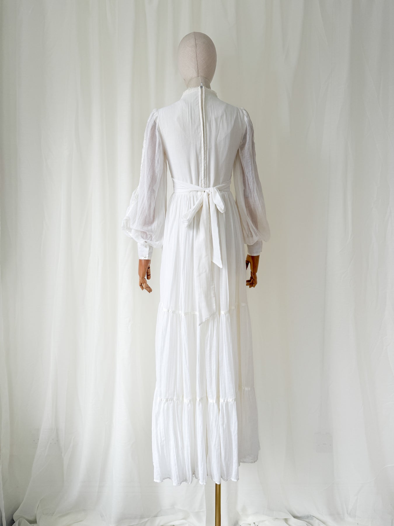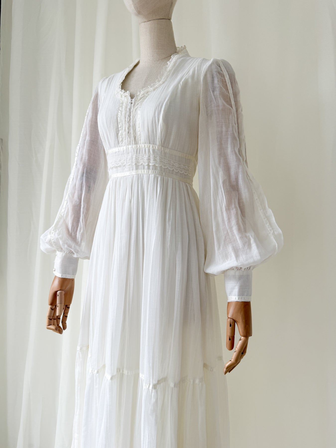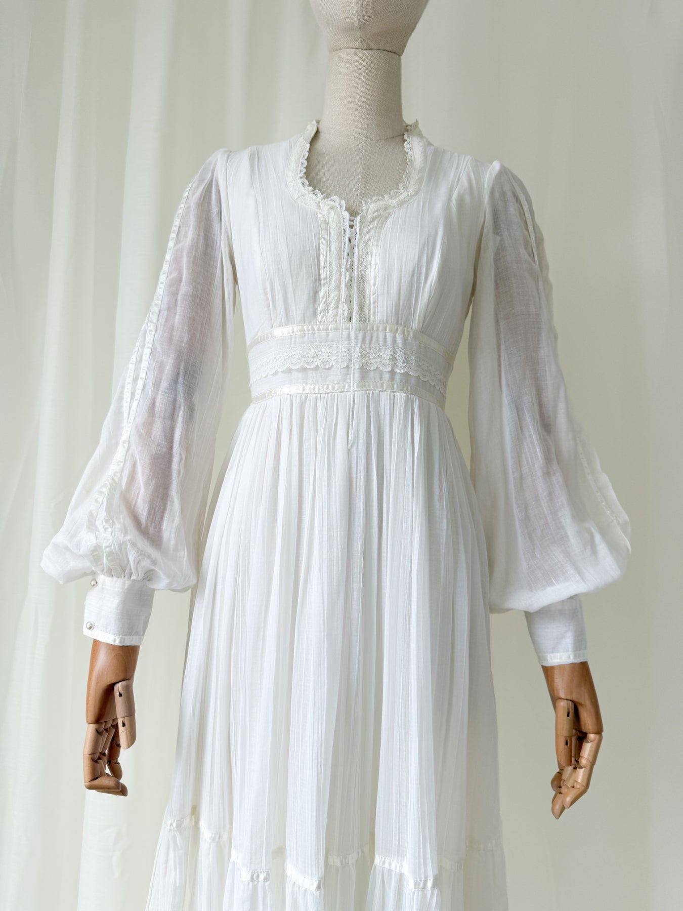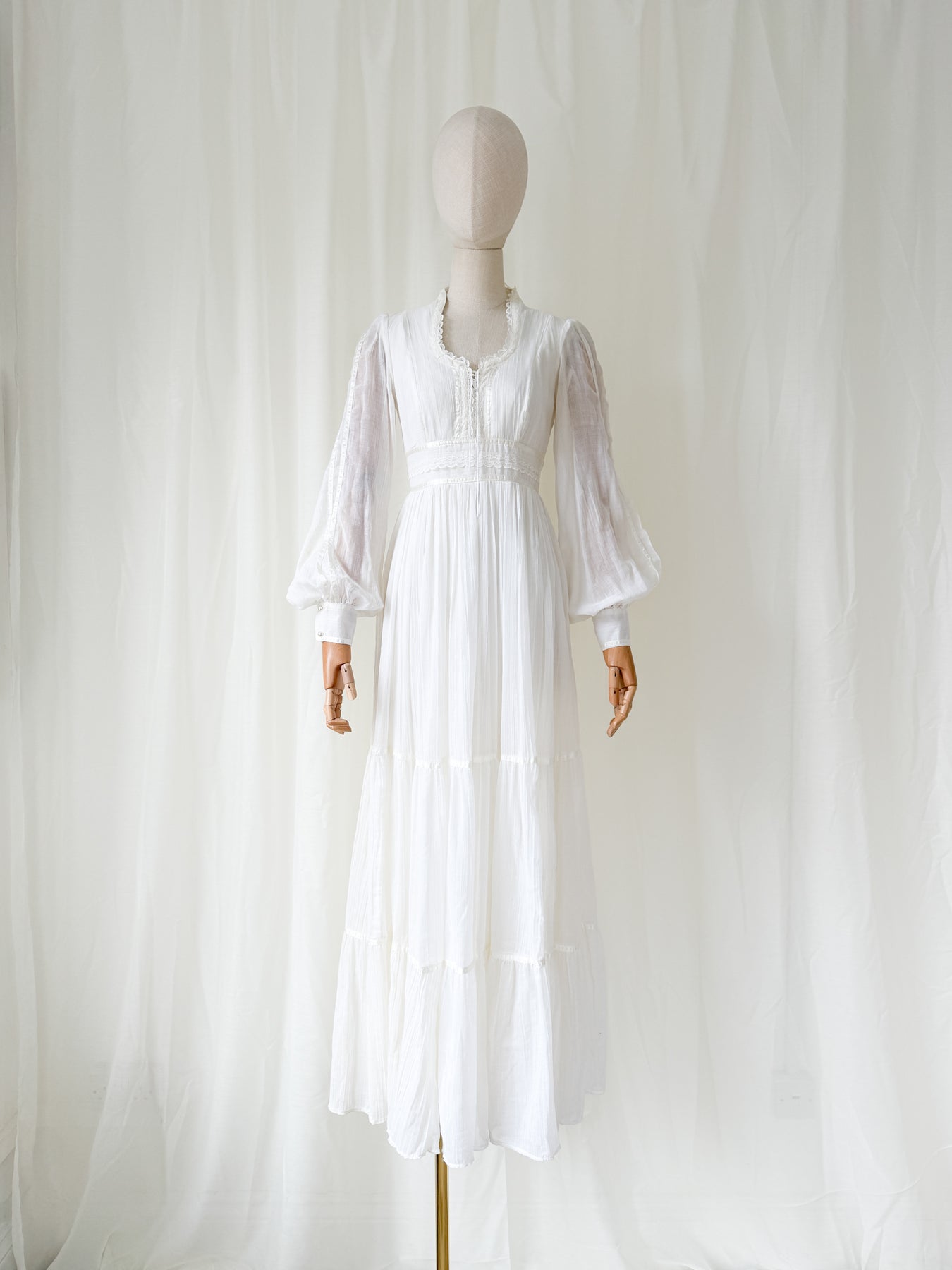 This precious rare 1970s white cotton beauty (possibly an unlabelled Gunne Sax) is a true favourite and is one of those beautiful pieces to cherish forever. She has a stunning silhouette with corset feature bust and beautiful sleeves with a tiered skirt, and is trimmed in beautiful lace and ribbons.