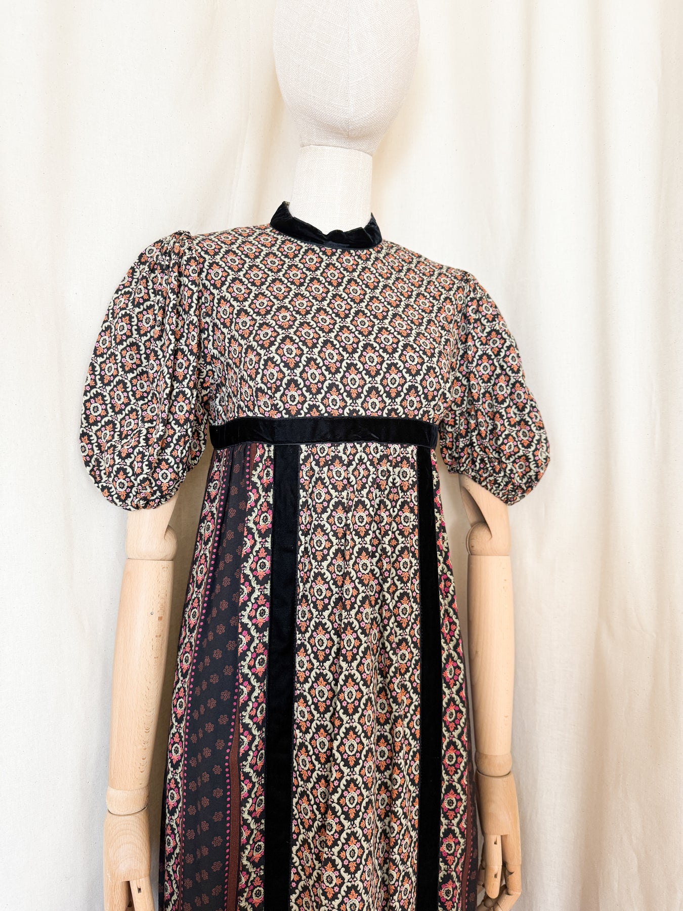The ultimate autumn dream, this precious wool blend 70s empire line maxi is just adorable, with beautiful mixed prints on a black base with thick black velvet trims. She has a high collar and puff sleeves and is a dream when worn.