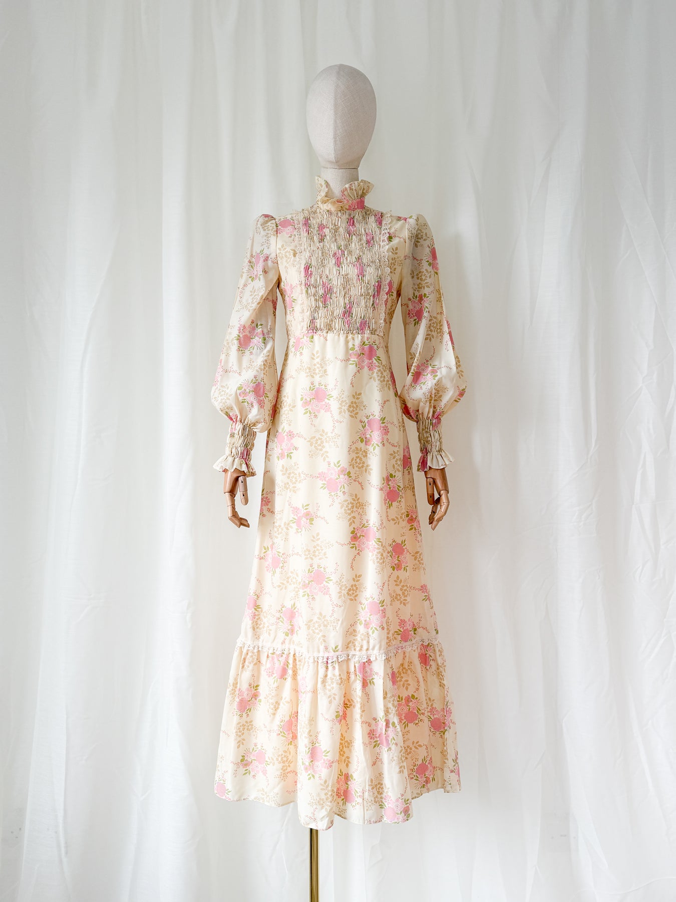 This is such a classic and staple 70s girl piece, with a gorgeous playful take on victoriana, she has a stunning silhouette with shirred bodice and cuffs, high collar and a flowing flounced skirt. She is crafted in a light cotton and has the prettiest floral print.