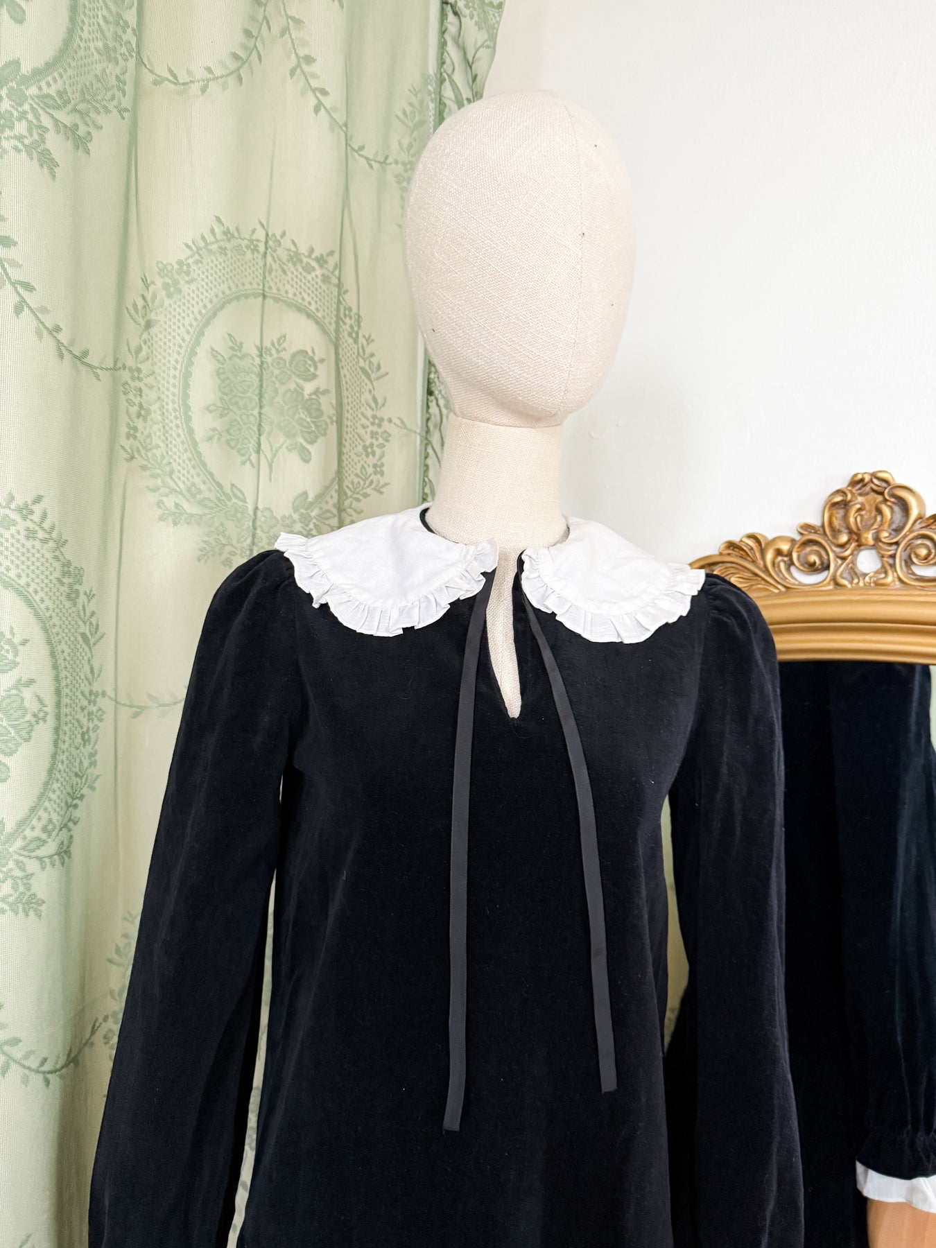 This 1960s Miss Selfridge velvet mini dress exudes a ghostly elegance, merging vintage allure with an eerie undercurrent. Its drop waist smock silhouette drapes softly in rich velvet, contrasted starkly by a white puritan collar and frill cuffs that evoke a spectral innocence. The dress’s delicate detailing and shadowy vibe create a hauntingly beautiful presence, perfect for those drawn to timeless pieces with an unsettling, evocative spirit.