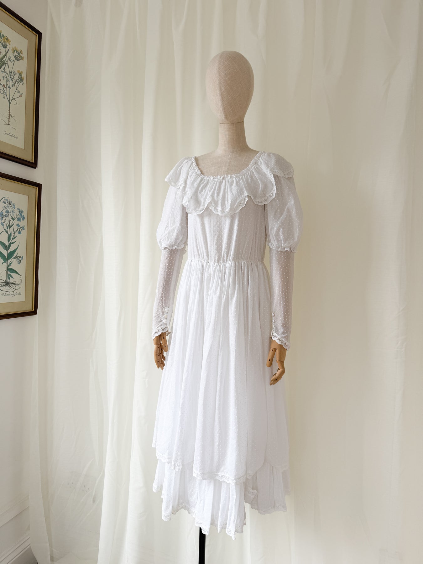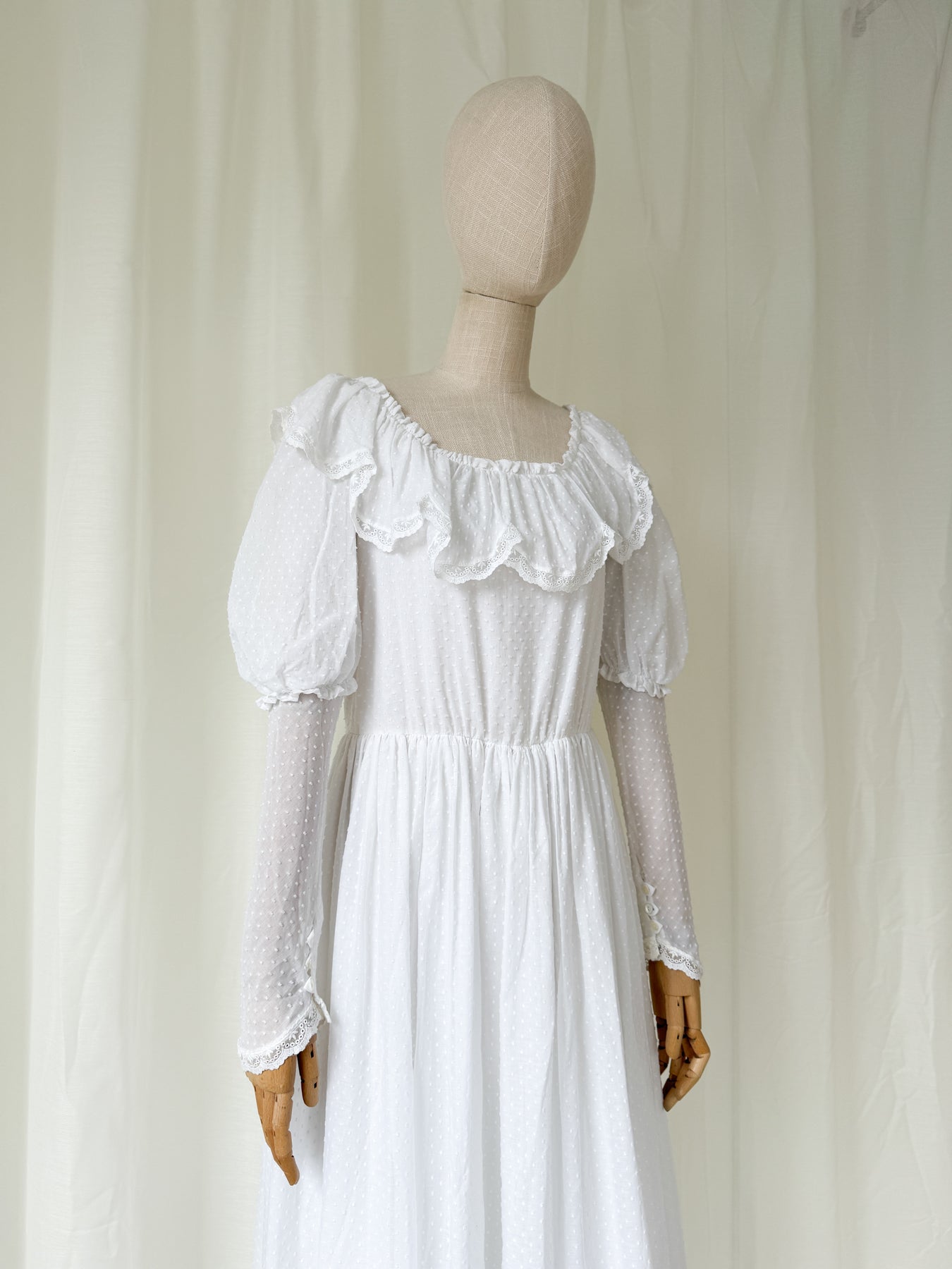 This dress is a literal swan, elegant and graceful, but also full of passion and energy. She is a late 70s Laura Ashley Made in Carno, Wales, dream and is crafted to perfection in the most heavenly swiss dot cotton. She has dripping in beautiful details, with lace frills and the most divine double layered skirt, and is simply a true treasure to behold.