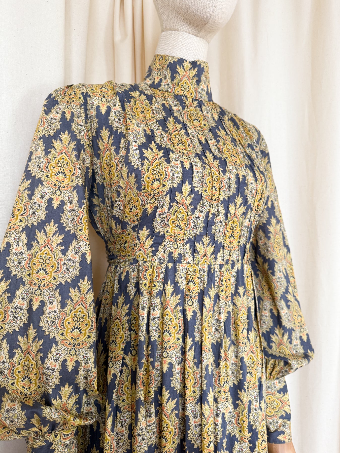 A coveted HOLY GRAIL RARE 1970s Bluestocking maxi dress crafted in luxurious liberty cotton lawn. The dress features a striking golden damask print, high collar, voluminous cuffed sleeves, and a dramatically flounced skirt. Bluestocking's limited production and refined design aesthetic make pieces highly sought after and some of the rarest early Liberty designs around. She is a VERY precious find and will be treasured in her next abode.