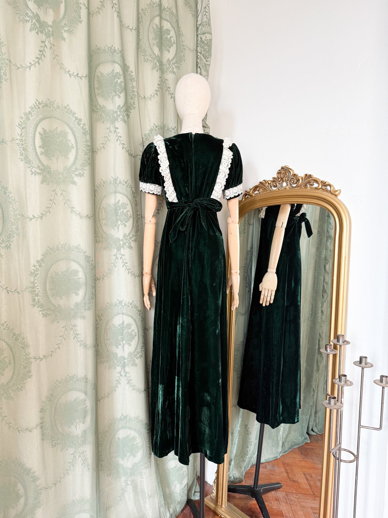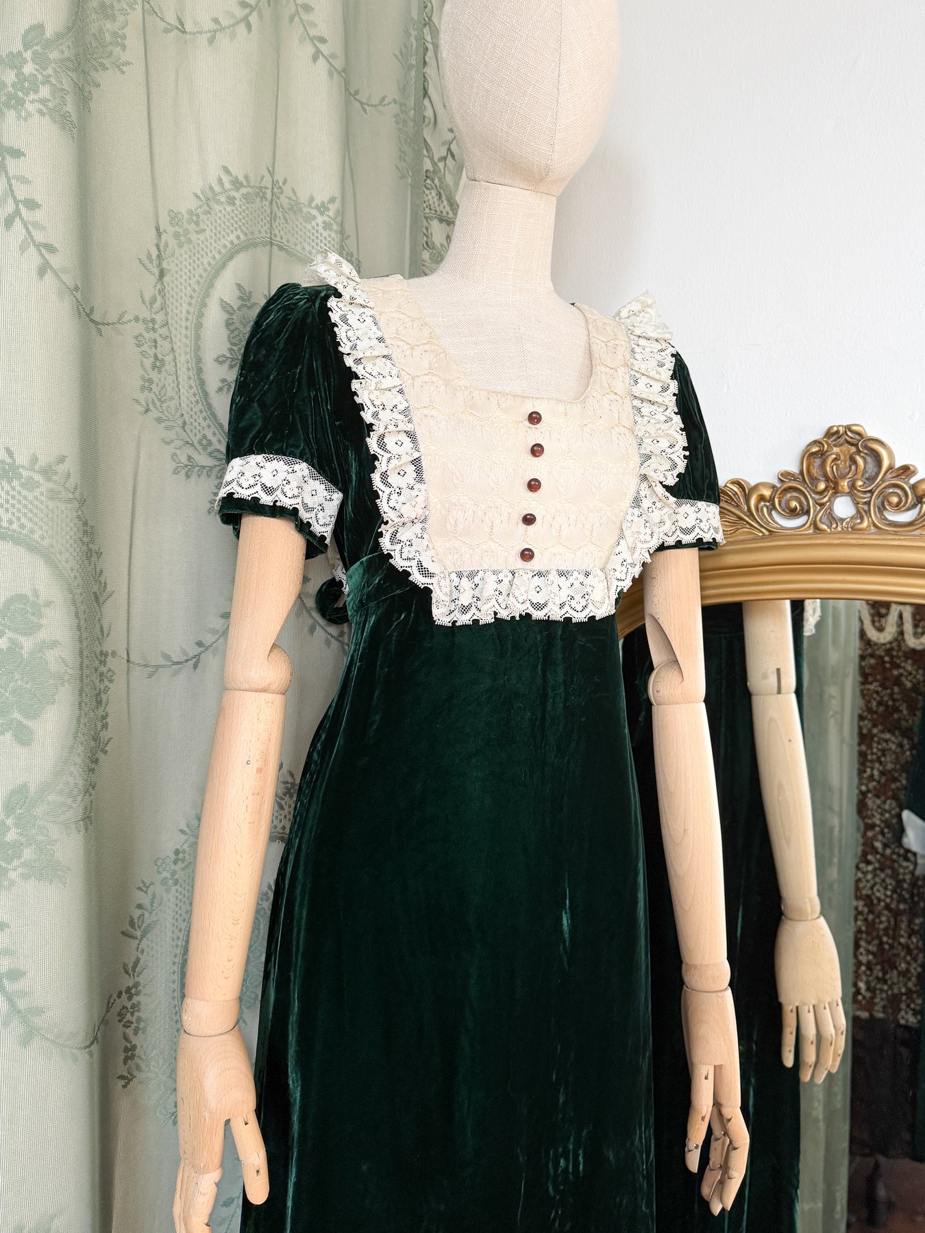 Poison is an exceptionally rare late 1960s maxi dress crafted from sumptuous dark green shimmering velvet. The garment features an exquisite lace bib with accompanying lace frills, paired with adorable puff sleeves that give a playful touch to her haunting silhouette. She is a piece of gothic magic and a truly precious piece to cherish forever.
