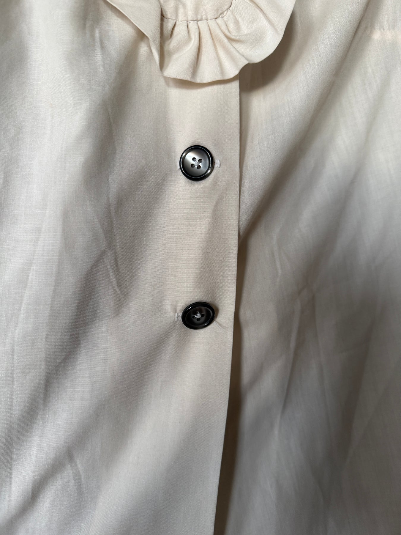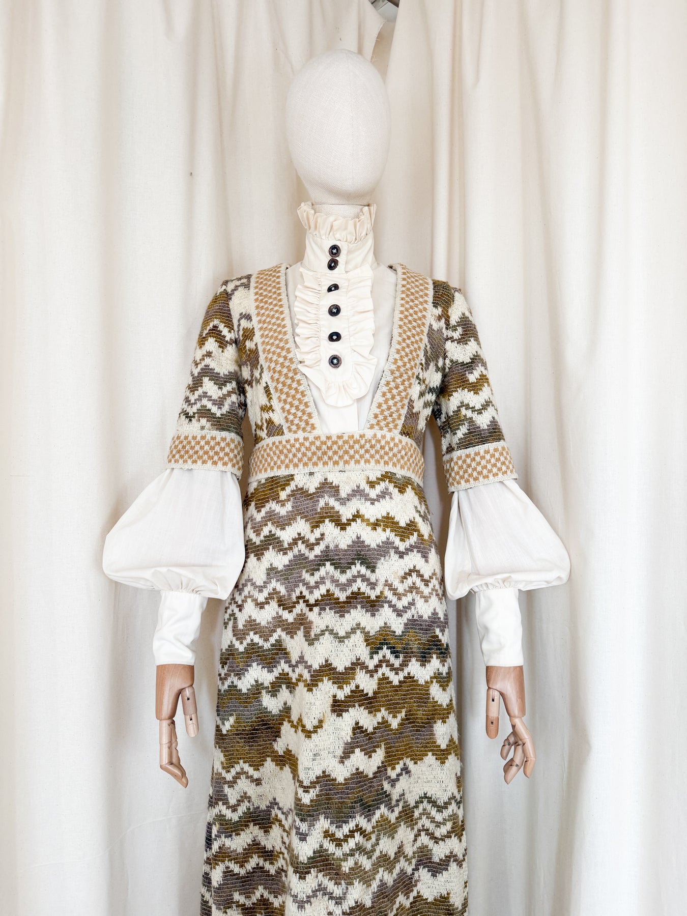 This holy grail rare Jean Varon ensemble has lived upon my rails for what feels like a lifetime since I unearthed her, and it truly is such a painful sale letting her go. She is one of the rarest Jean Varon pieces to ever grace my studio door, and is truly a magnificent find. She has a heavy woven wool dress with gorgeous textural design in a golden hued palette and comes with a matching labelled cotton blouse with gorgeous high frill collar and deep cuffed voluminous sleeves.