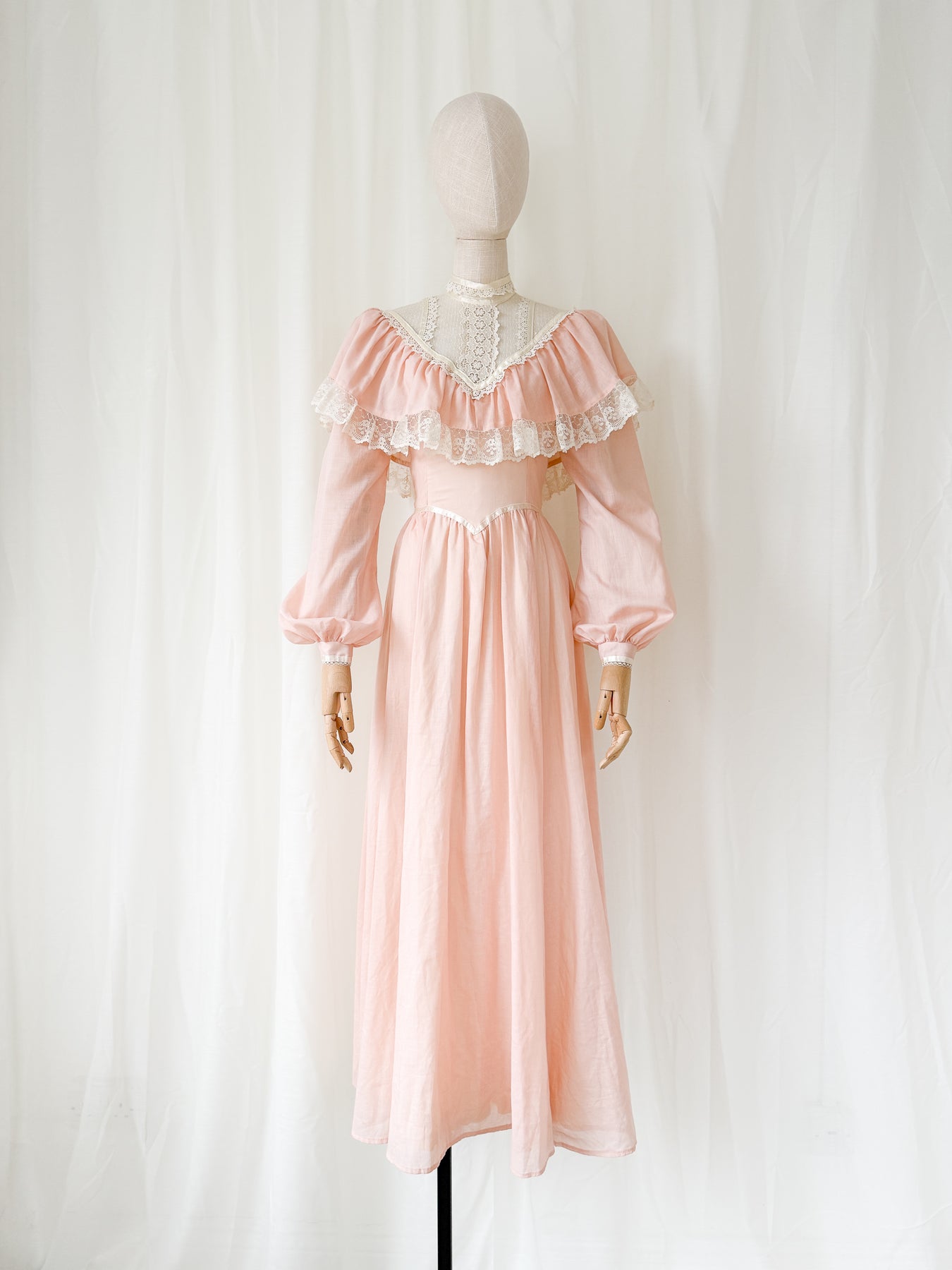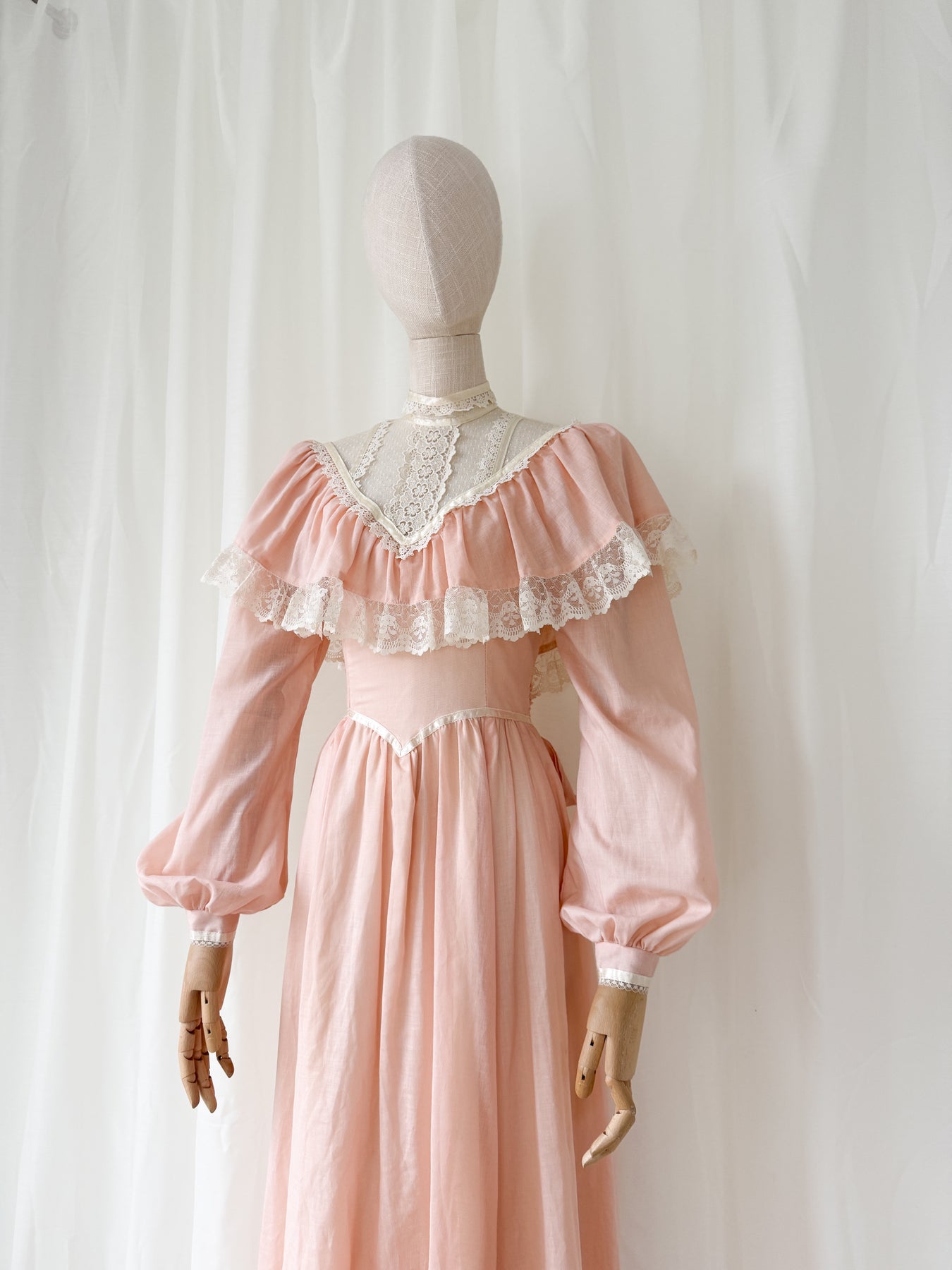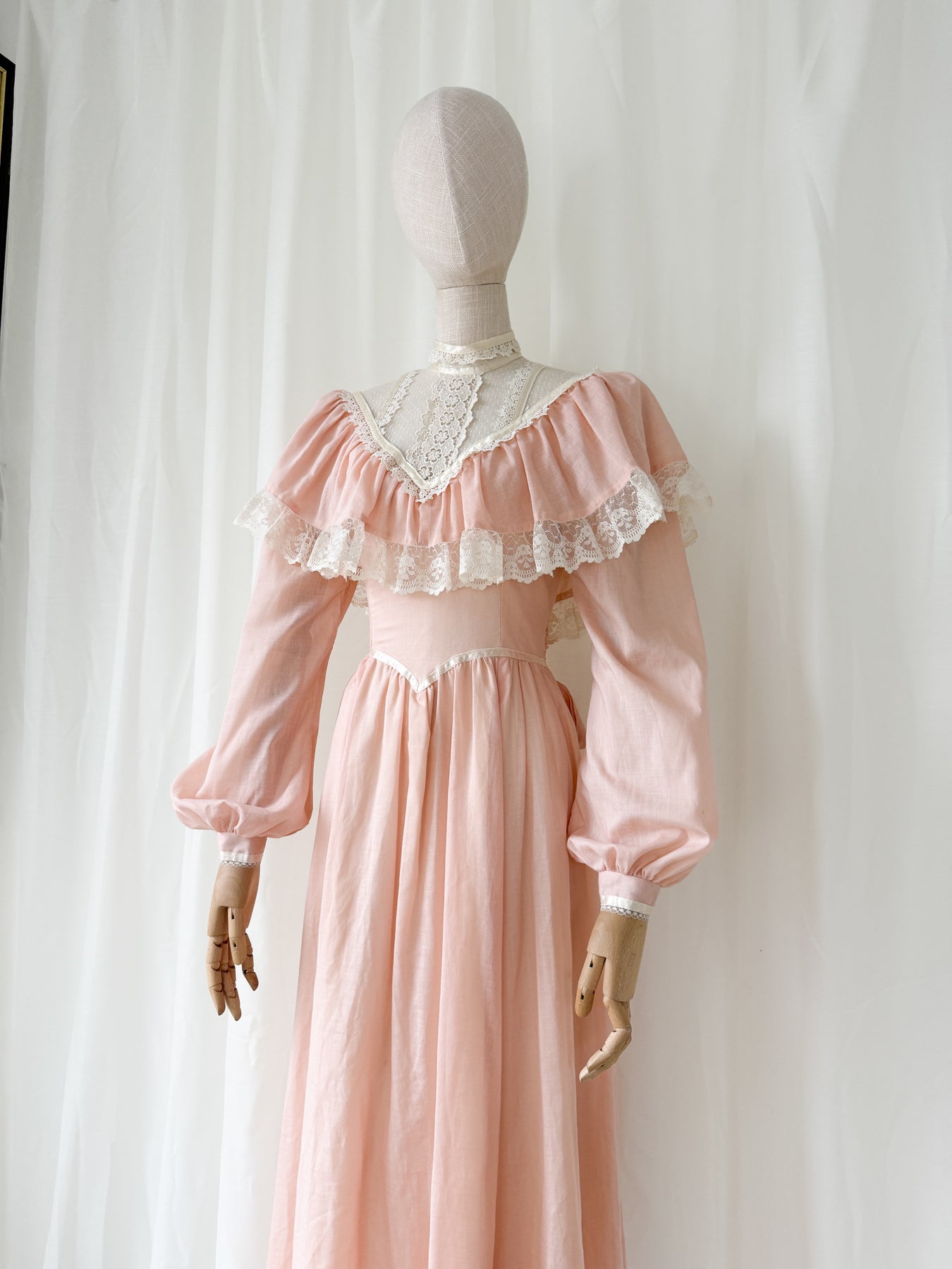 This is the kind of dress that is unmistakably vintage, and is simply one of those pieces that can never be replicated. She is by Jessica McClintock, which is the later version of Gunne Sax, and dates from around the late 70s early 80s. She is crafted in a beautiful peach cotton and is lathered in the most gorgeous lace. She has a stunning silhouette with frill yoke and is simply divine.