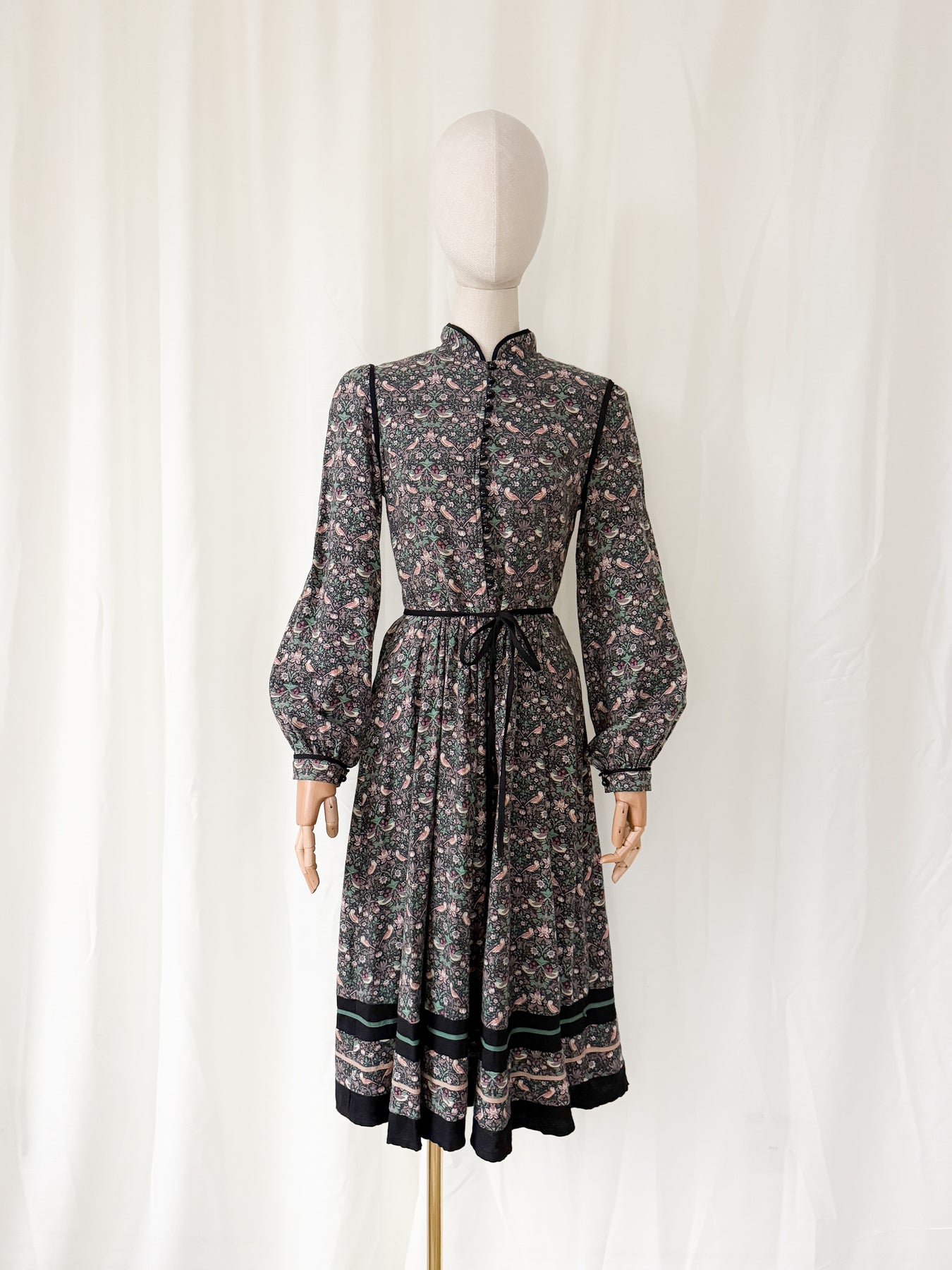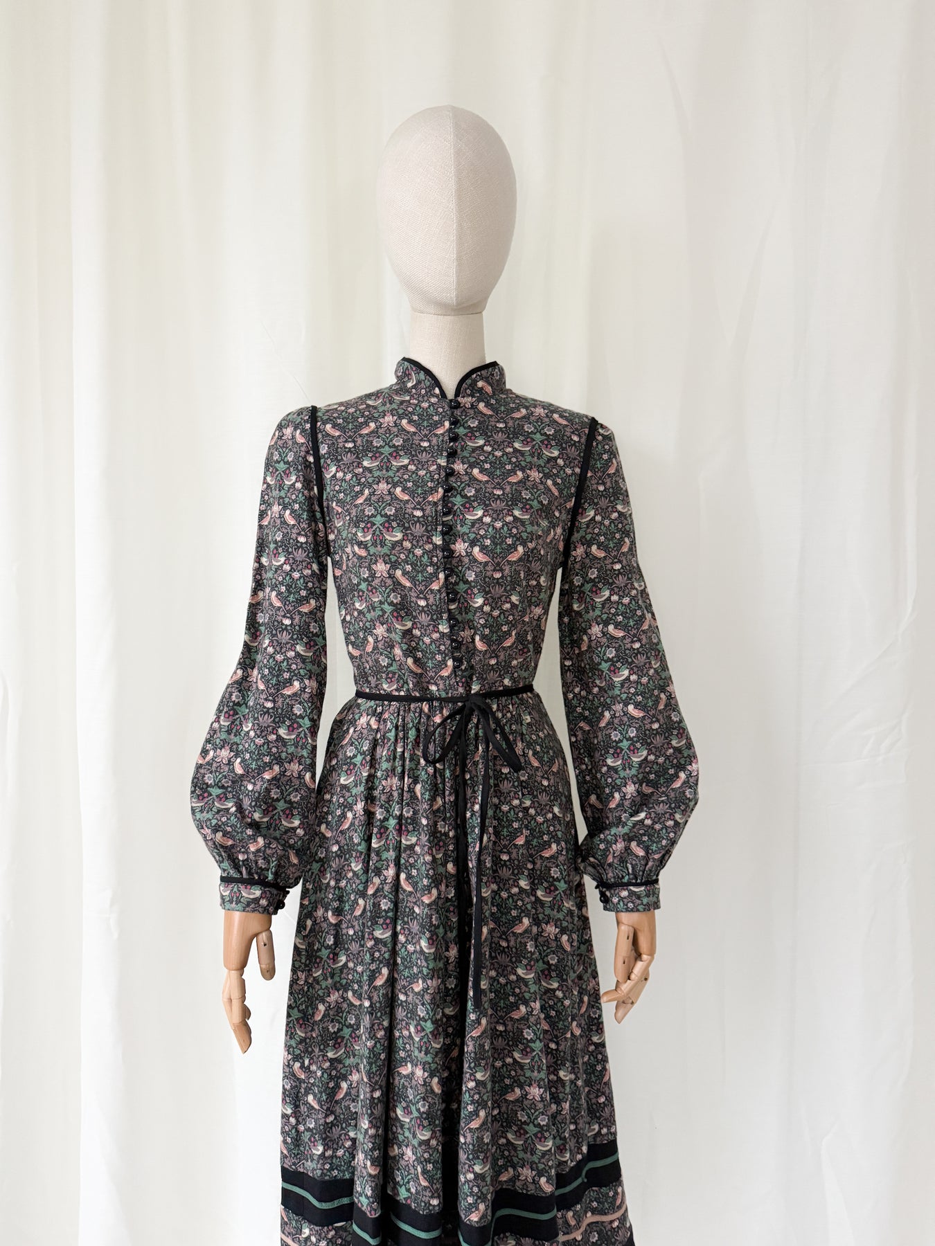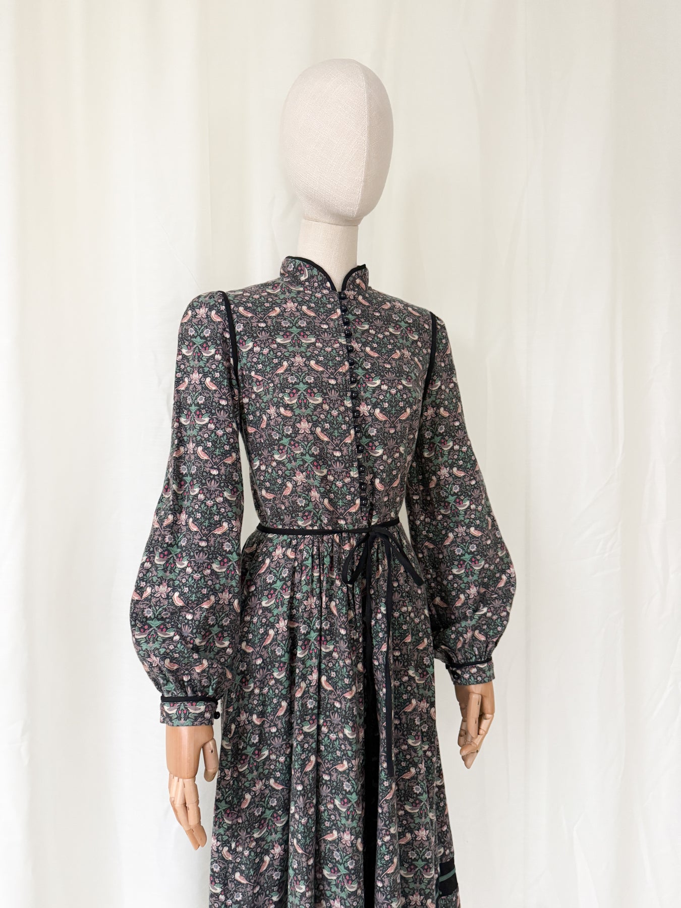 Another rare strawberry thief treasure for you! Highly coveted among collectors, this incredible 70s Origin cotton Liberty wool blend dream is truly the most precious of finds. She has the most beautiful silhouette with button through bodice, floaty skirt and cuffed voluminous sleeves. She is a gem and something to cherish and wear forever.