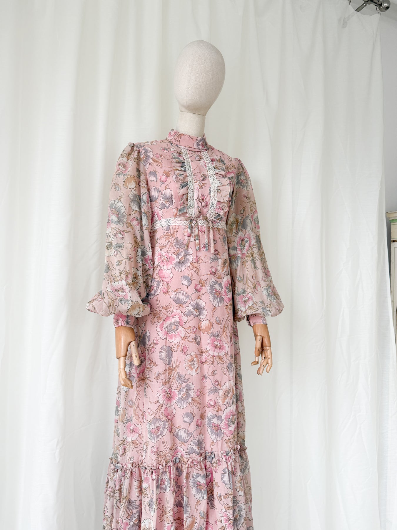 Dusky pink dreams... This soft cotton 70s floral beauty is a piece of magic, ripe with so many magical details and a stunning silhouette with gorgeous billowing sleeves, high collar and a flounced skirt. She is just forever beautiful and something to cherish forever.