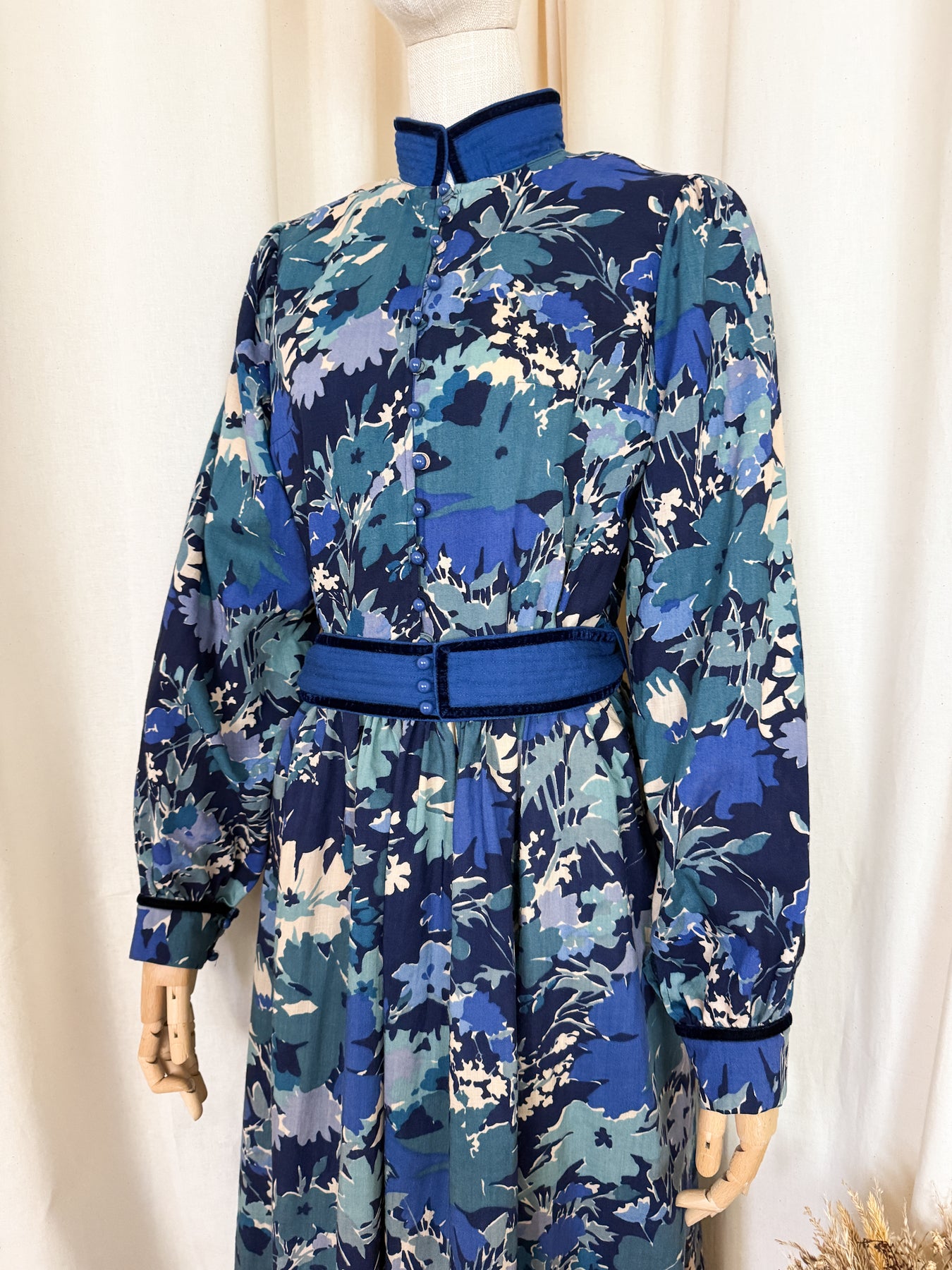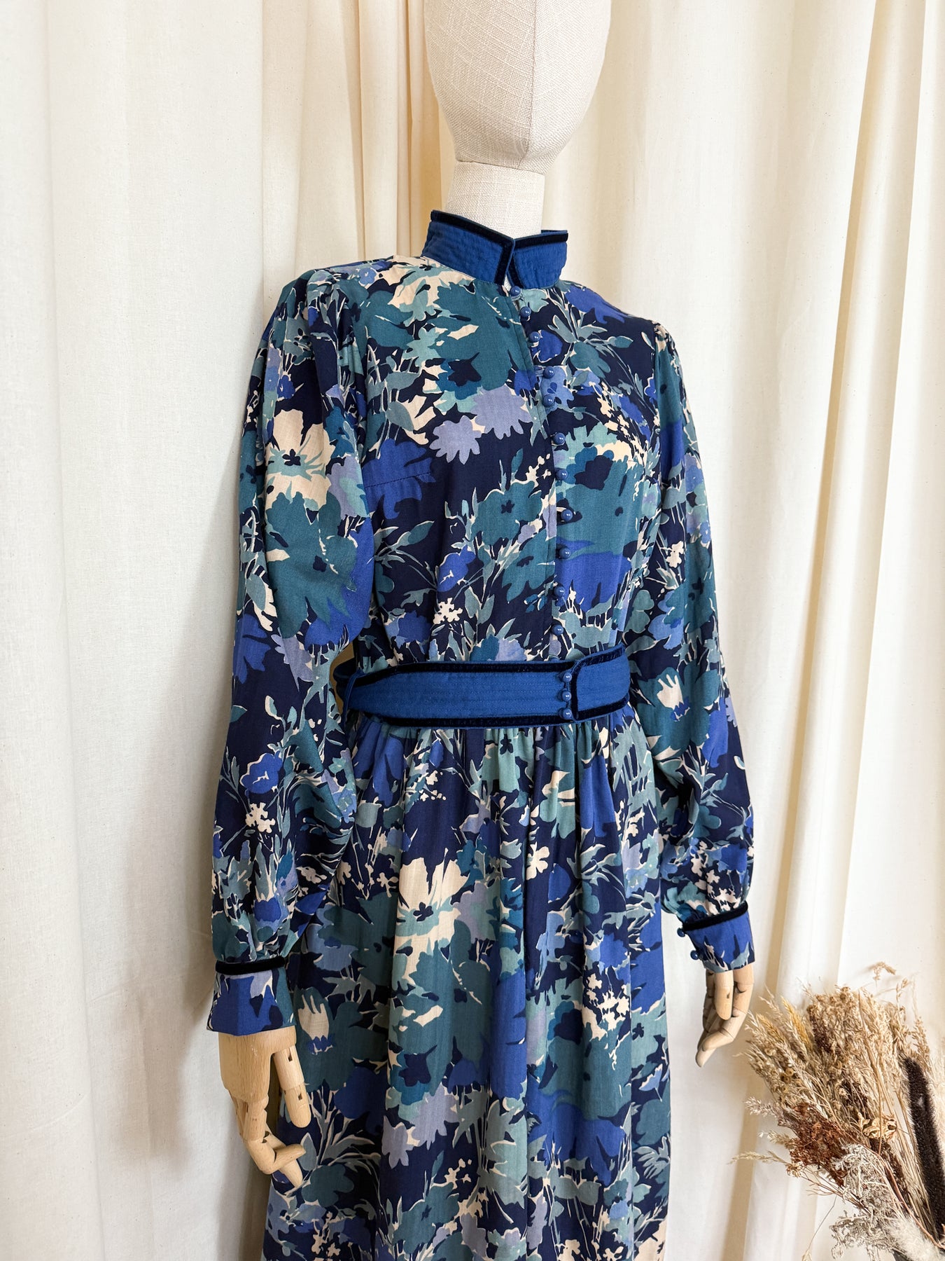 Discover this divine 1970s Liberty pure new wool midi dress by Origin, adorned with a dreamy blue floral print. A romantic masterpiece featuring a fitted button-through bodice, voluminous cuffed, and a sweeping full skirt that moves like poetry. She is the ultimate vintage winter midi and is such a treasure.