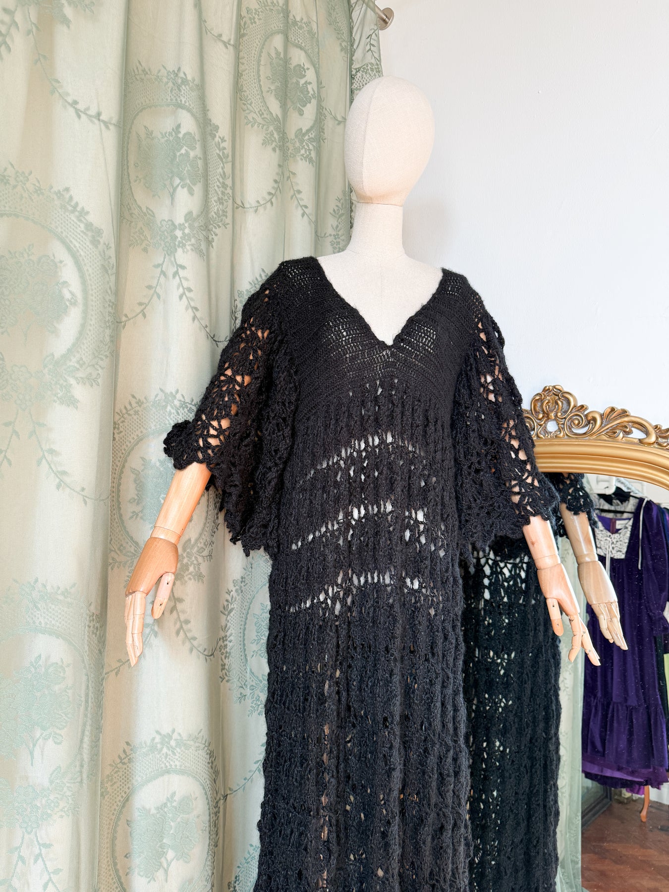 Step into an enigmatic realm with this HOLY GRAIL RARE 1970s black crochet maxi dress, a true collector’s alluring treasure. Crafted with mesmerising spiderweb patterns, she exudes gothic drama and haunting allure. Her incredible flared cape sleeves sweep like shadows, enhancing jer seductive, witchy charm. A one-of-a-kind statement piece, this dress embodies vintage mystique and mysticism, perfect for those who dare to mesmerise with every step.
