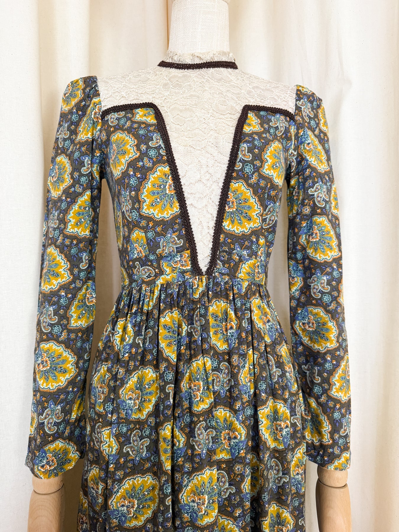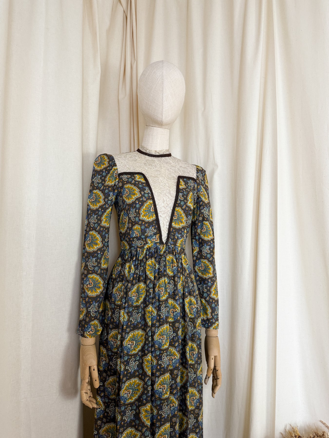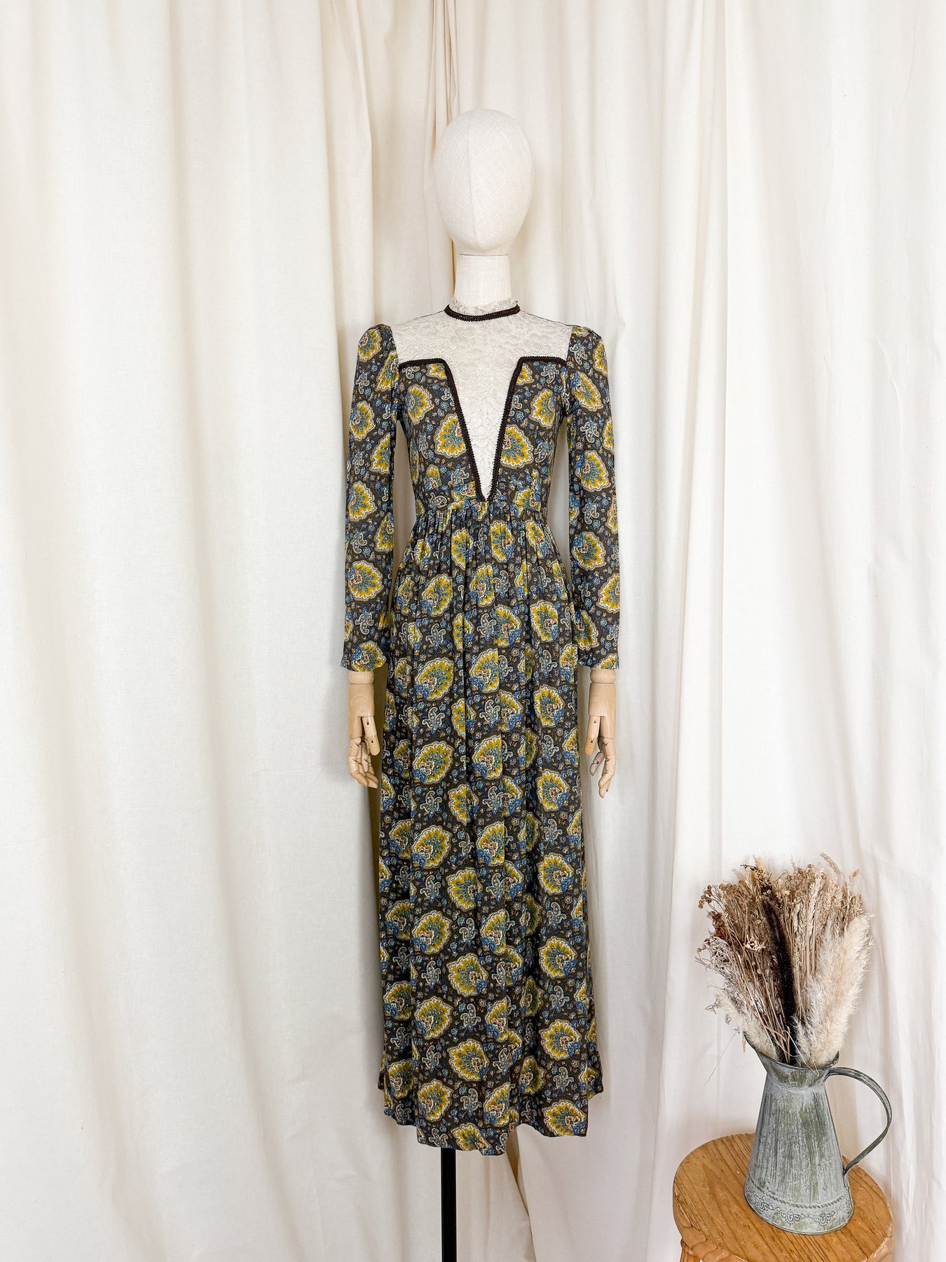 This stunning 1970s Dorothy Perkins maxi dress in soft cotton with a striking autumnal palette features an intricate lace-panelled bodice and vintage print that captures the era perfectly. She has such an incredible cut, and is perfectly enchanting. The ultimate autumnal witch vibe.