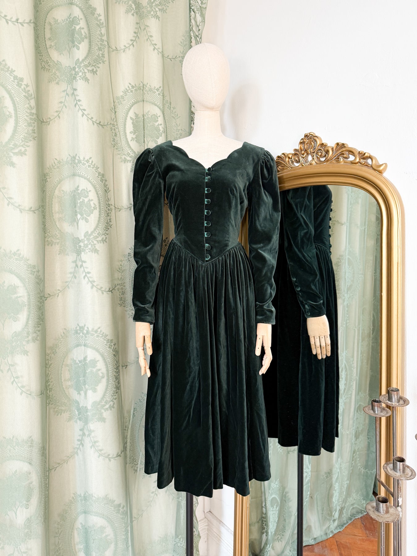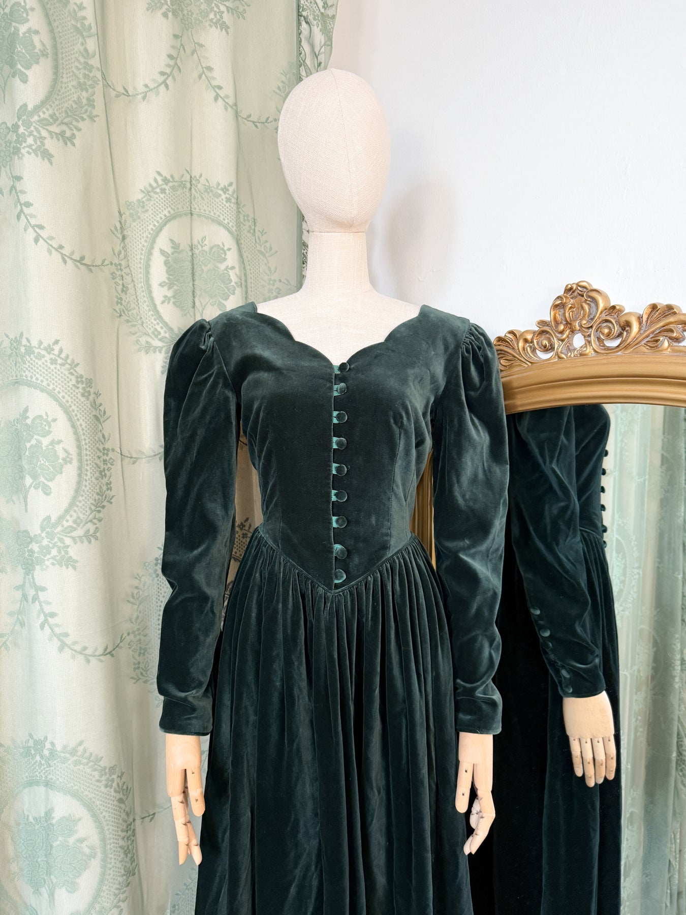 Thorn is a beautiful high quality 1980s green sumptuous cotton velvet maxi dress by Laura Ashley. She has a beautiful button front bodice, incredible mutton sleeves and a full midi length skirt. She is one of those forever beautiful pieces, and is meticulously made like all Laura Ashley dresses, I know she will be well loved in her next abode.