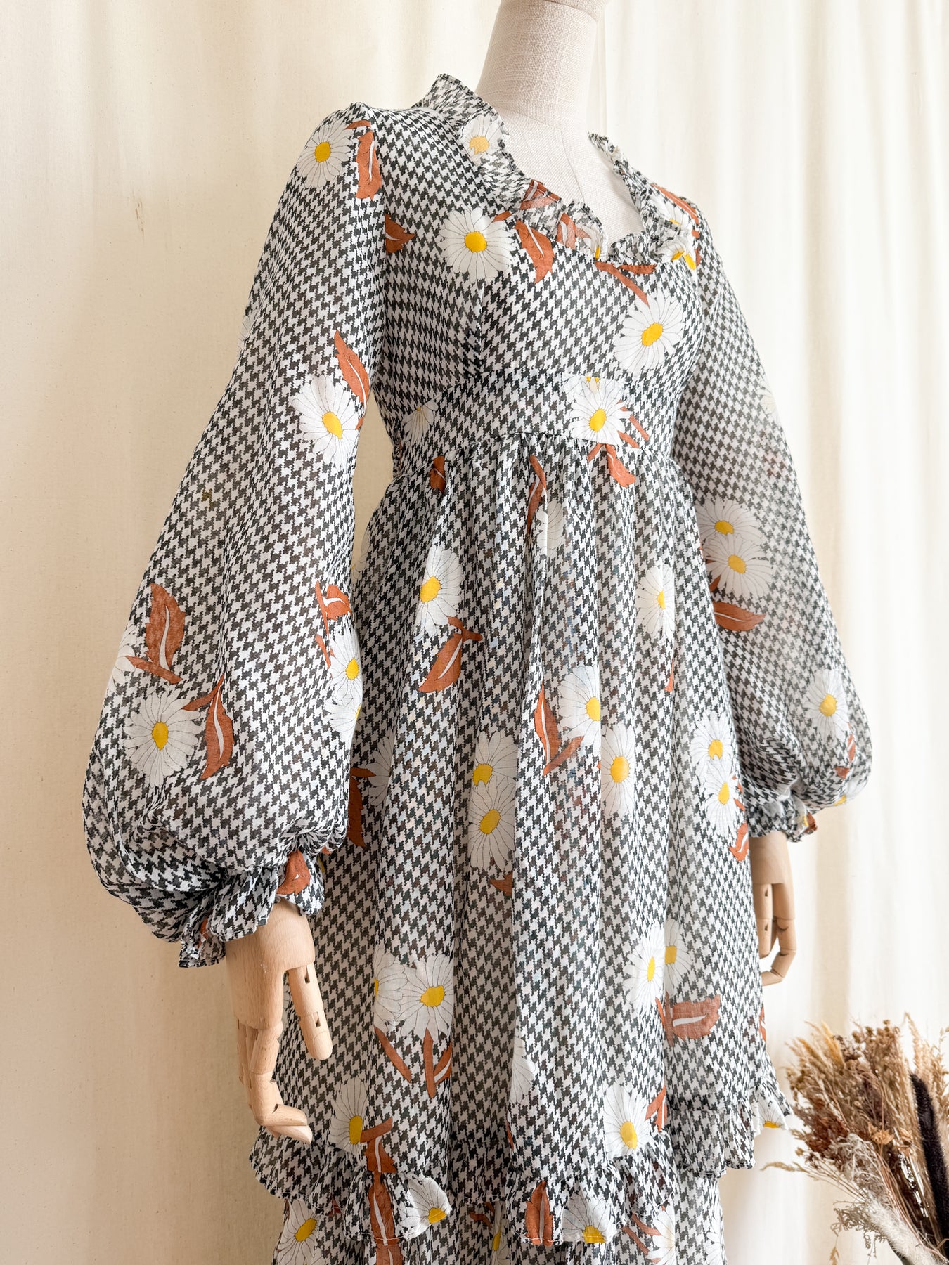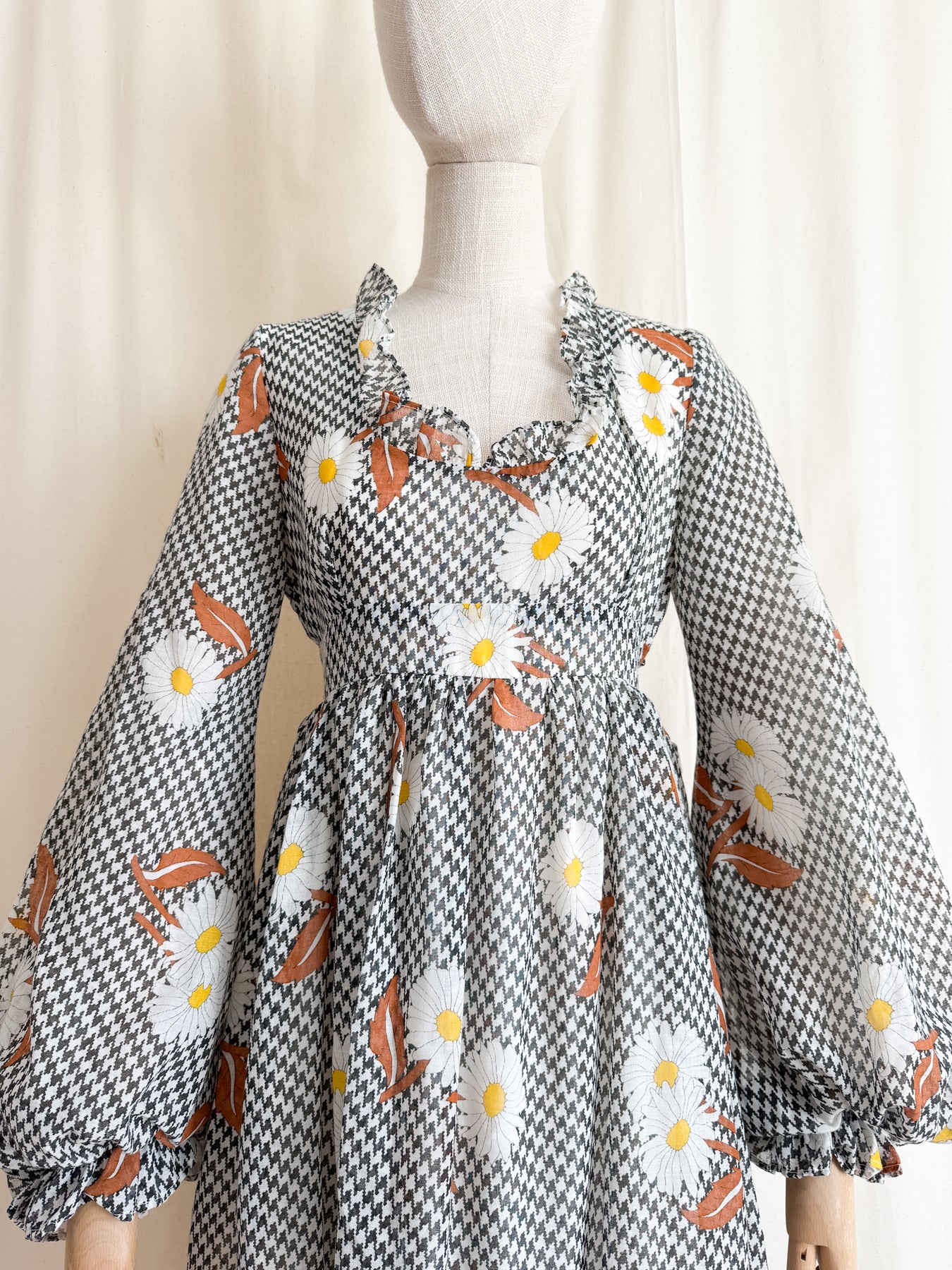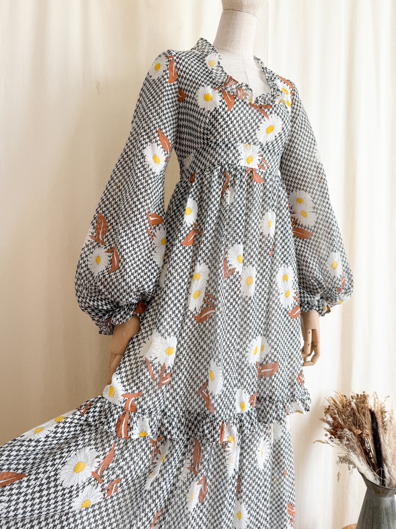 This rare 1970s cotton maxi dress by collectible label Angela Gore features a breathtaking silhouette with dramatic billowing sleeves and delicate frill details. Highlighted by a high waist and a beautifully crafted flowing double-layered skirt, she showcases an autumnal houndstooth print accented with brown and white floral motifs. She truly is a stunning piece and will look amazing when worn...