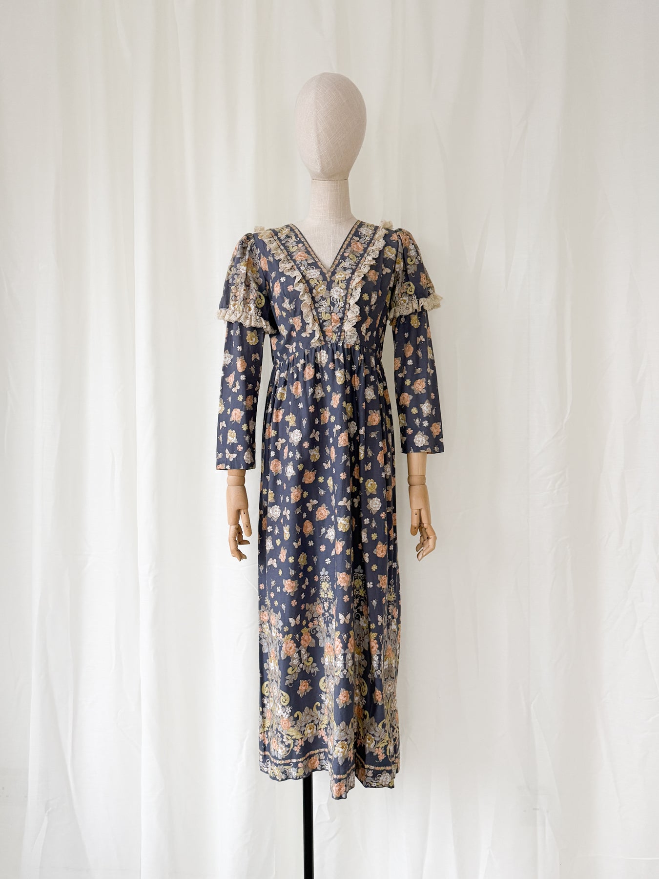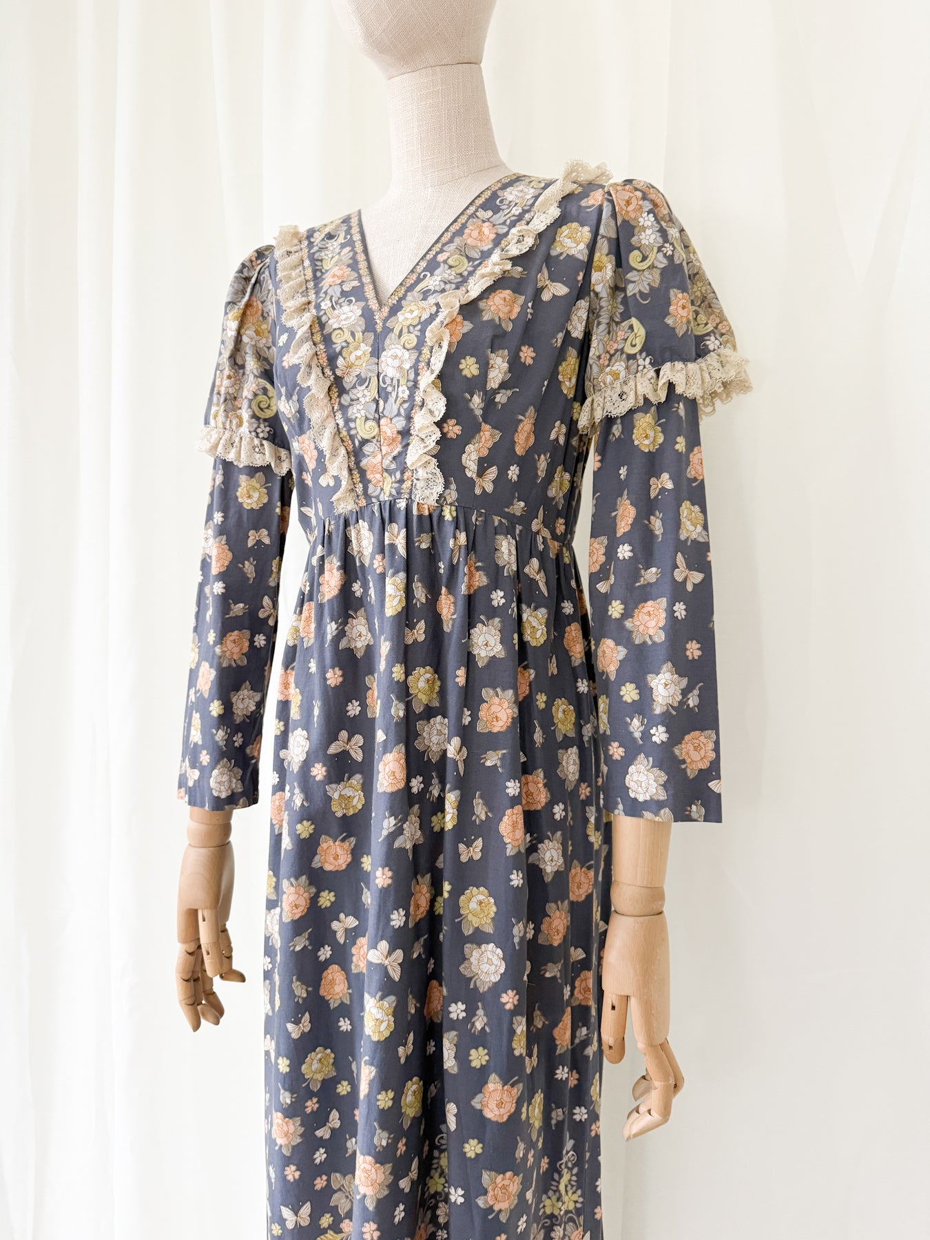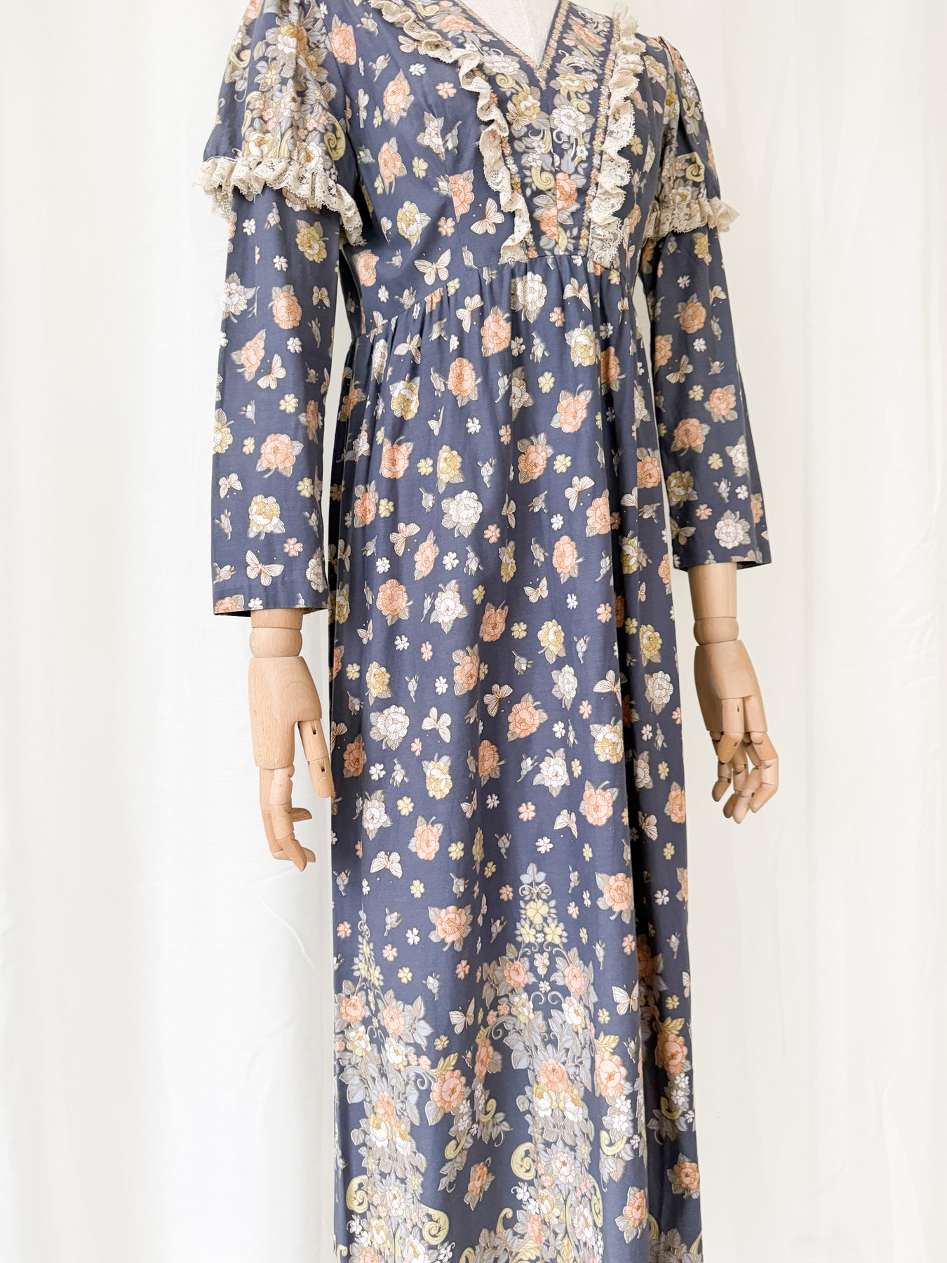This is a true 70s dream by one of the most renowned labels of the time, Dollyrockers. She has a gorgeous silhouette with flutter double layered sleeves and a heavenly neckline, and her print is like a spring day filled with flowers and butterflies. She truly is something so precious and unique, and is one of those pieces to cherish forever.