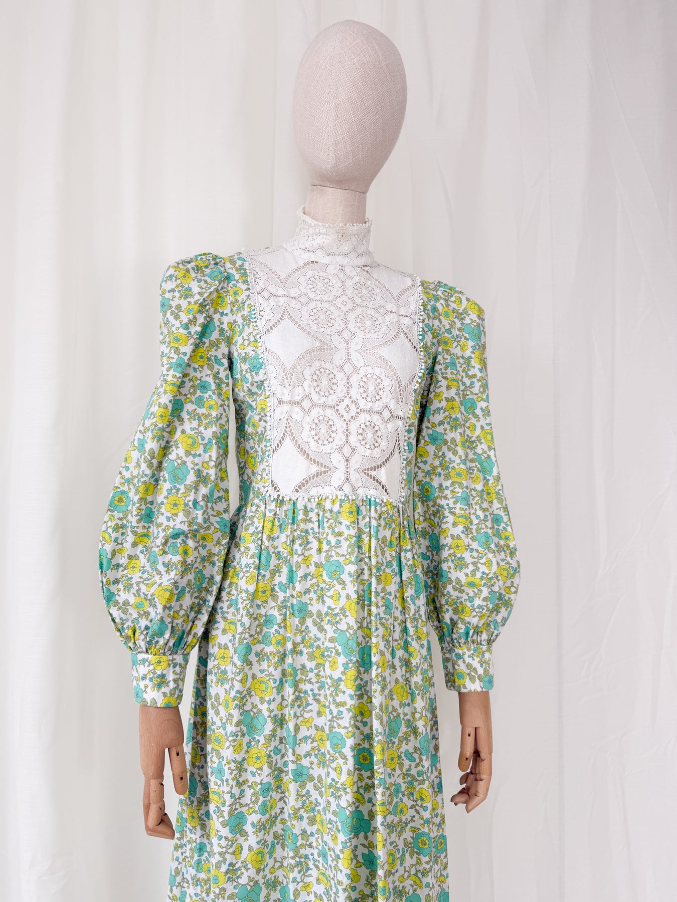 As beaut as they come, this precious 70s Wallis dream dress is one of my spring favourites! All of the vintage Wallis pieces are superior, and the quality of this one is second to none! She has a gorgeous cluny cotton lace bodice and is crafted in a thick high quality cotton with gorgeous spring floral print! She is just adorable and one of those perfect spring pieces to cherish.