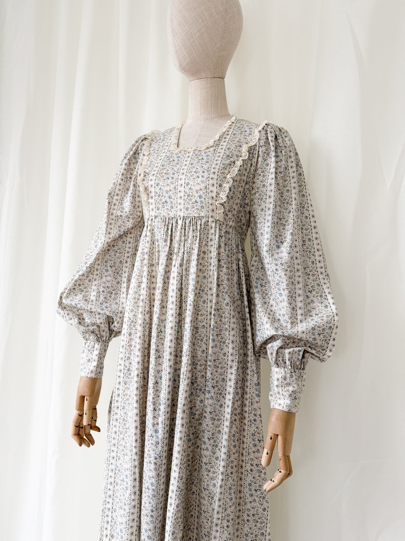 This is the kind of 70s dress I will always love. Beautifully crafted in a thick cotton with delicate blue floral on an off white base, she is just precious and carries so much charm. She has beautiful crochet lace trims and is absolutely ripe with the prettiest of details, and she also has the most incredible billowing sleeves...