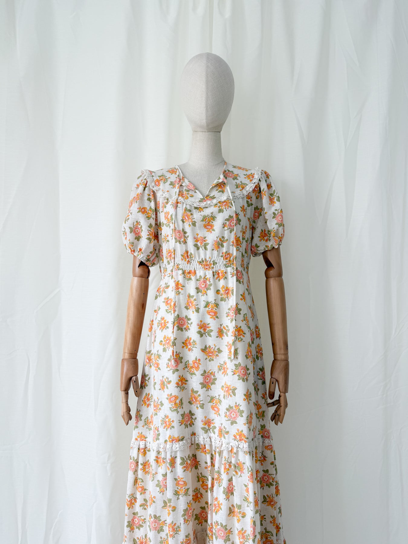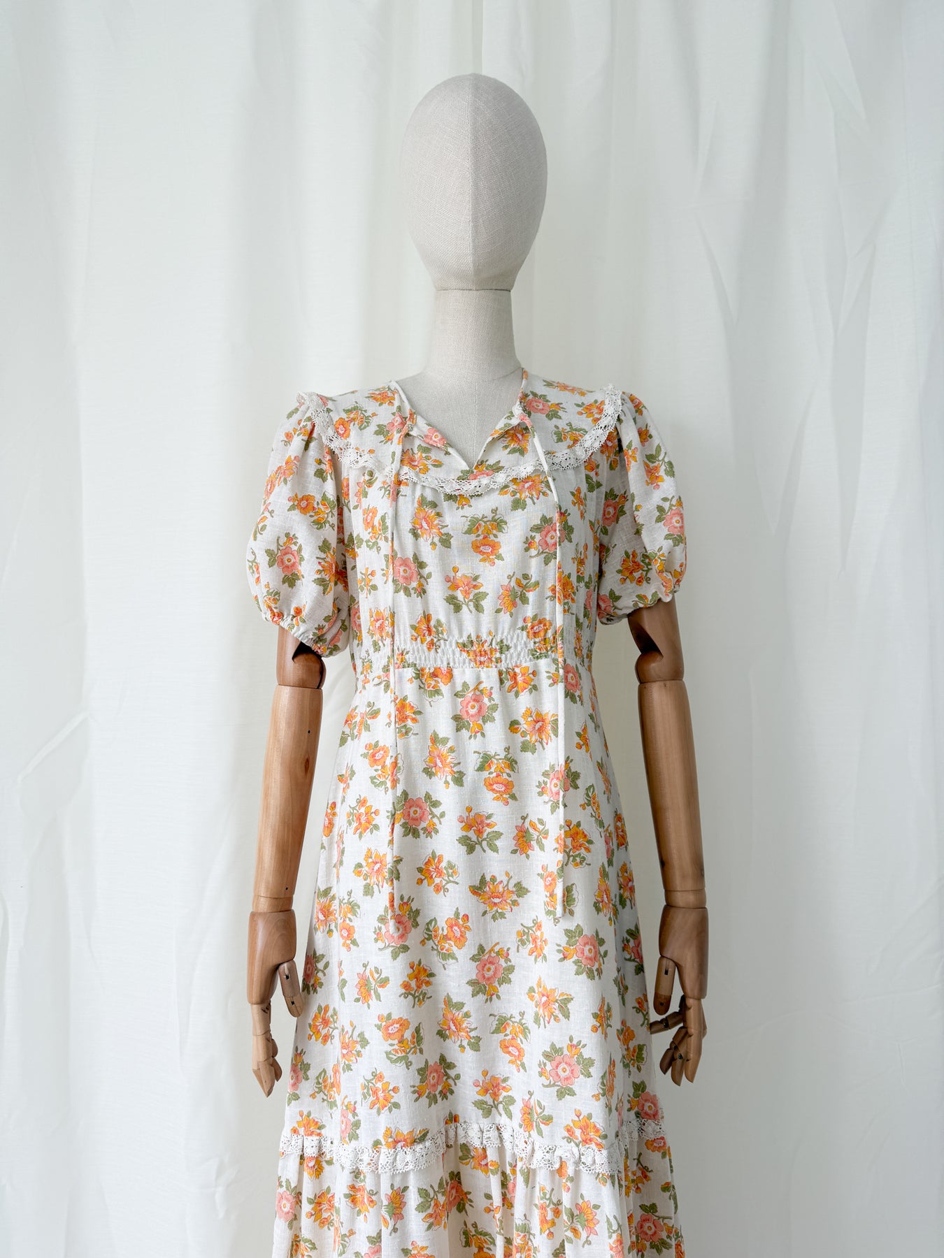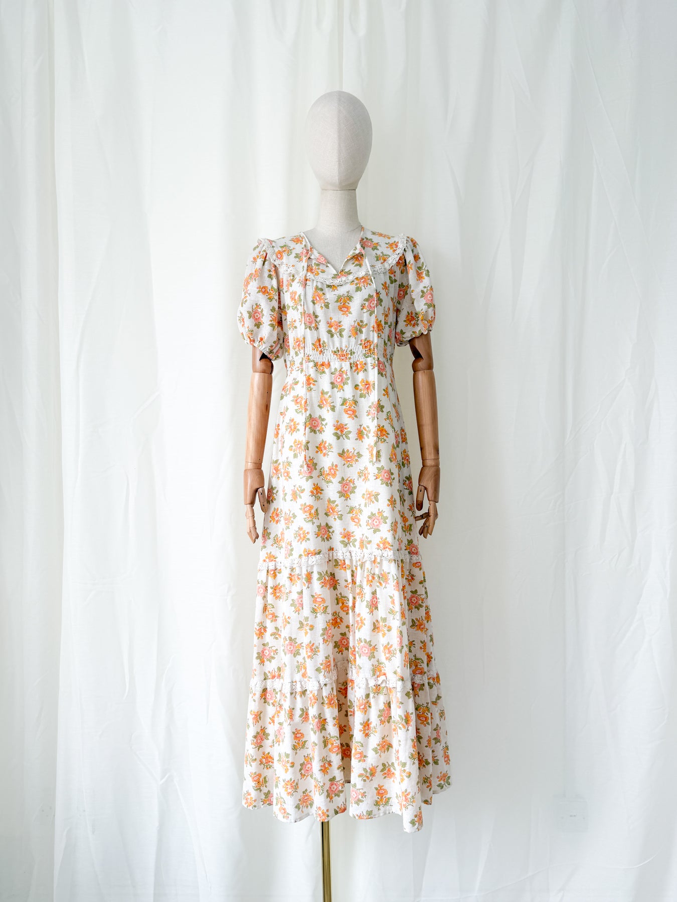 This adorable vintage prairie dress in a soft floral print with warm peach and orange tones is crafted from the most gorgeous natural raw cotton. Features puff sleeves, delicate lace trim, and a flowing tiered skirt. An easy to wear and forever gorgeous find to cherish forever.