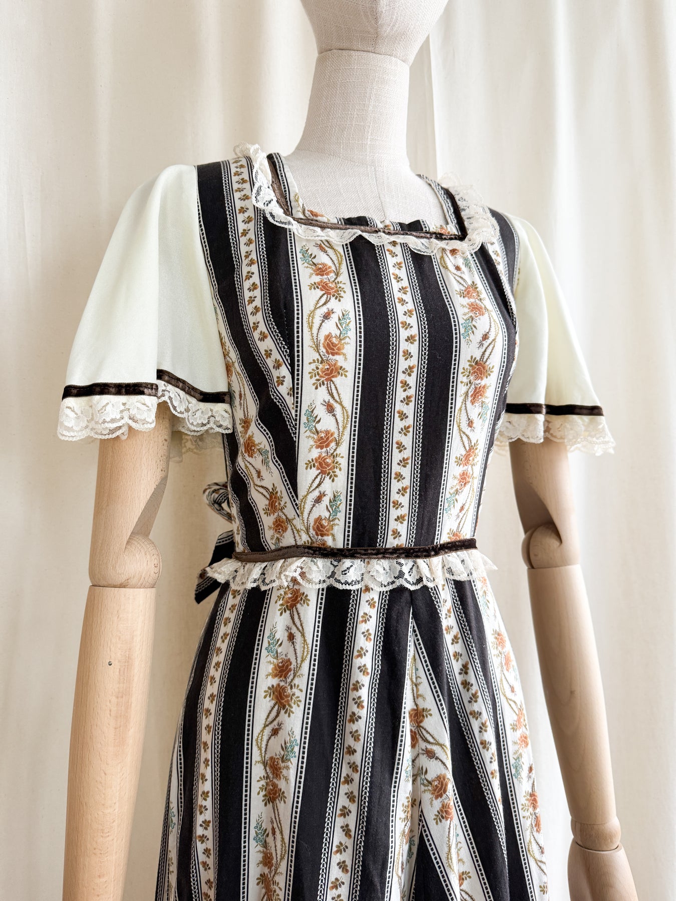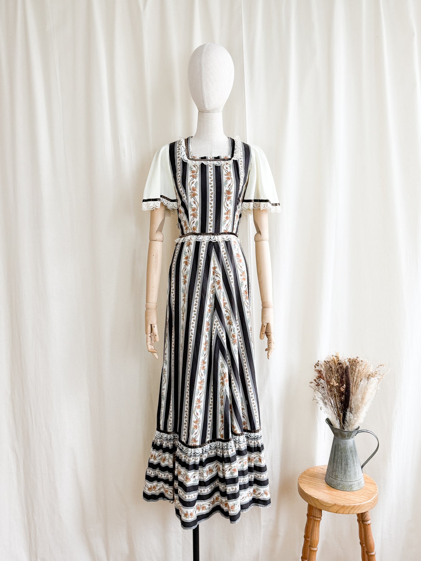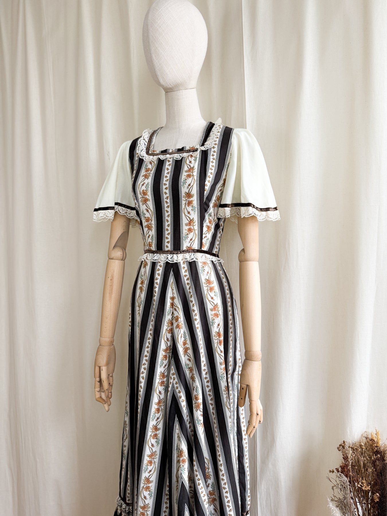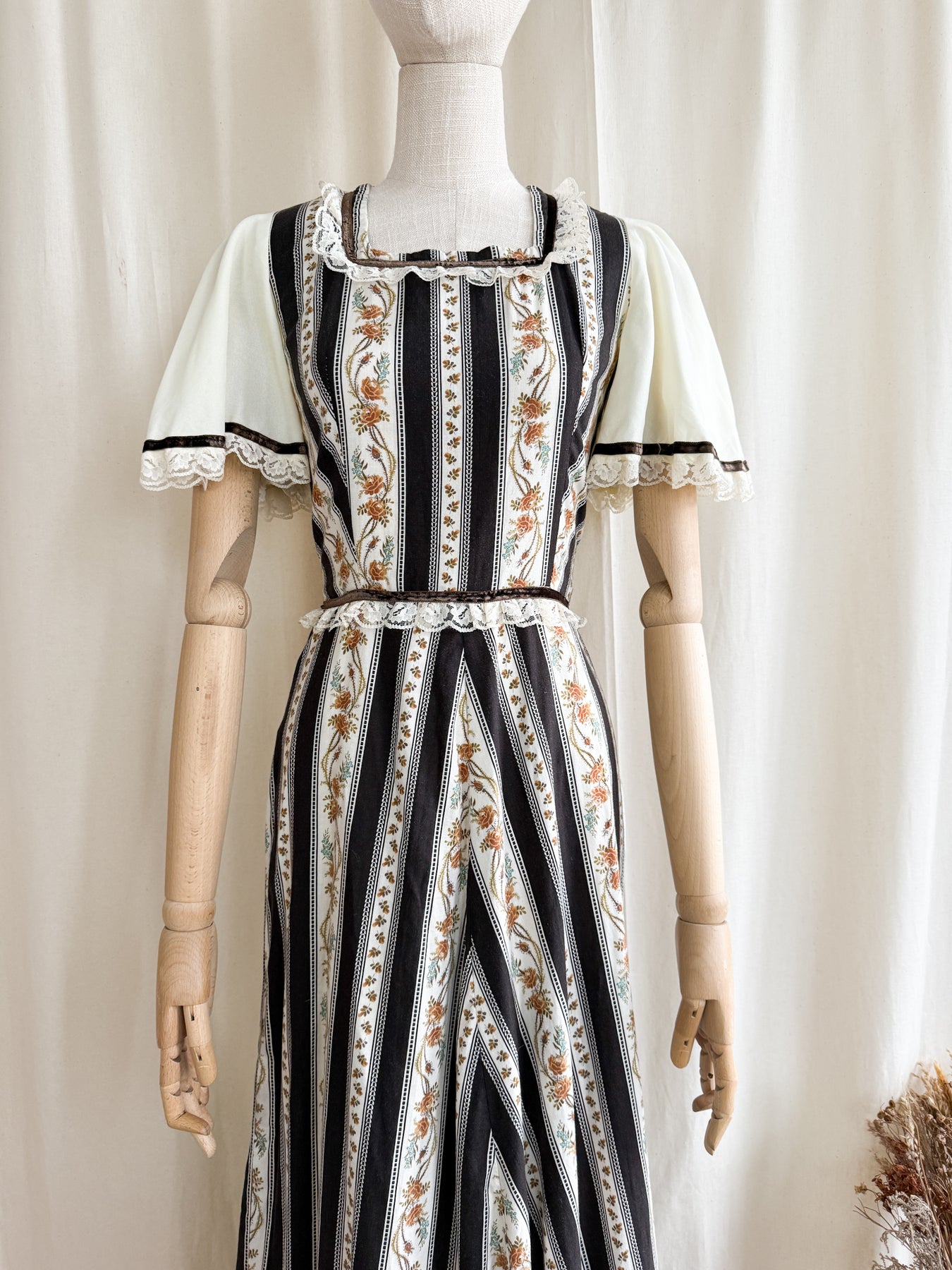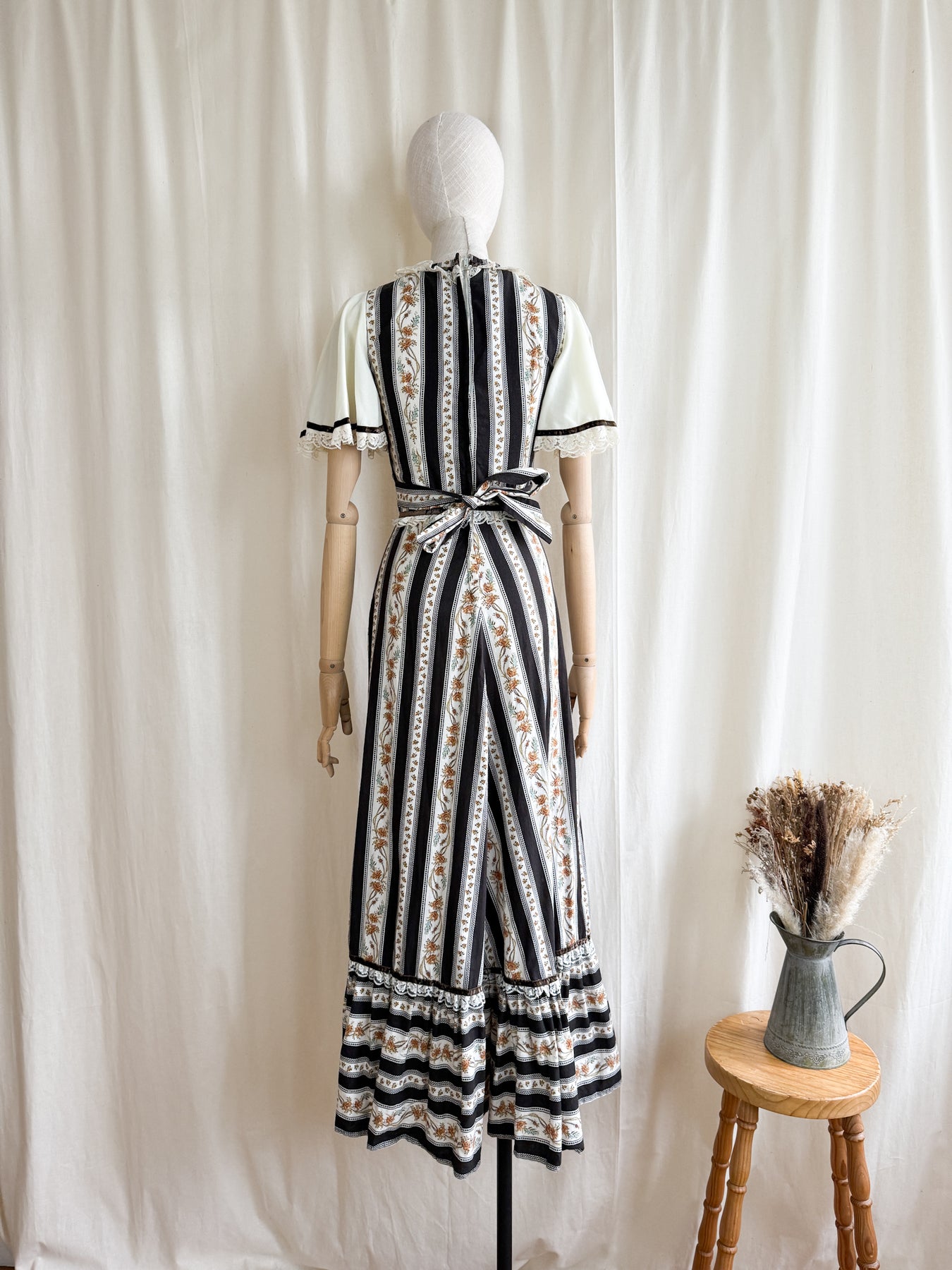 Gorgeous 1970s witchy dark floral chintz stripe cotton prairie maxi dress