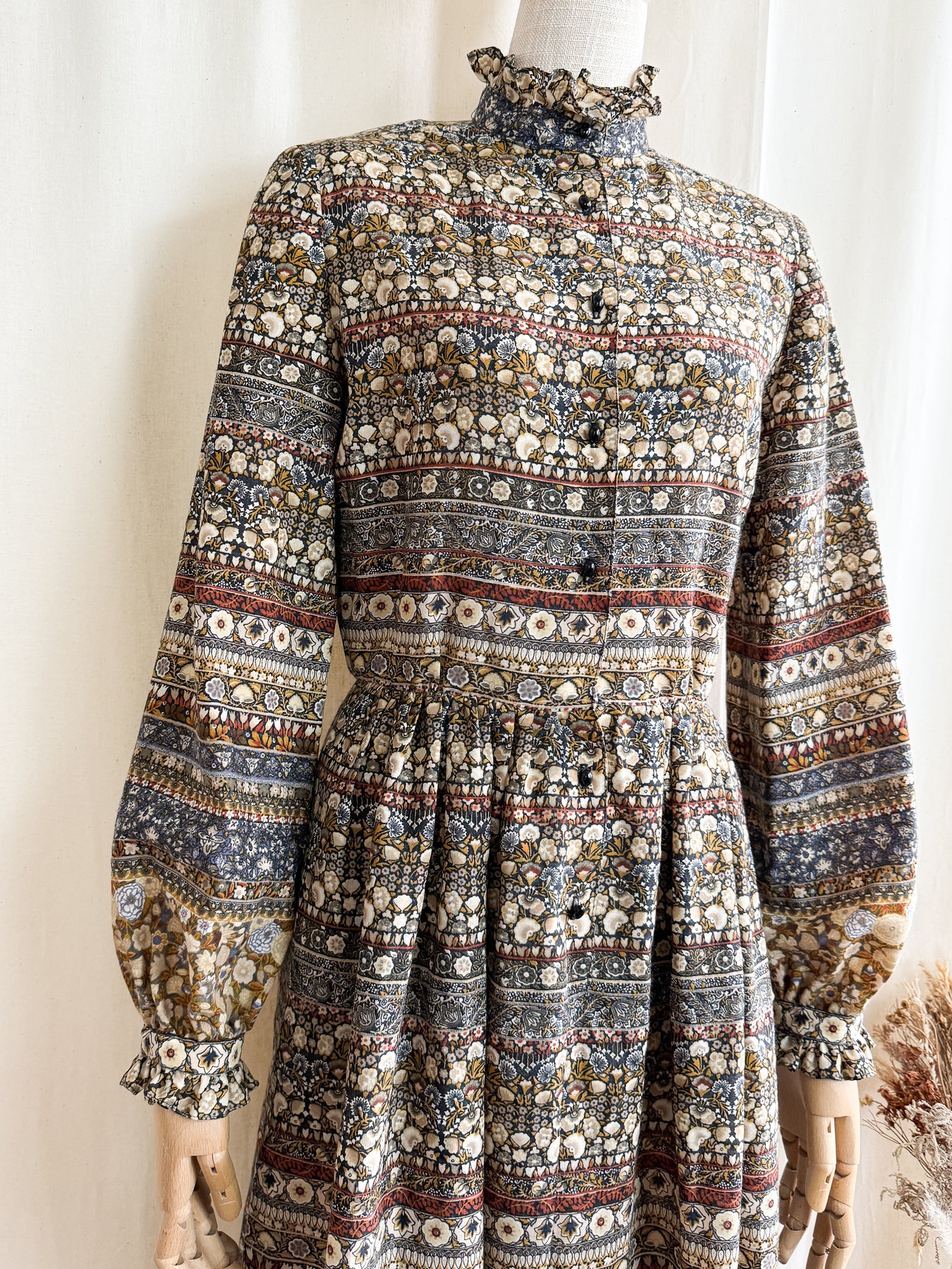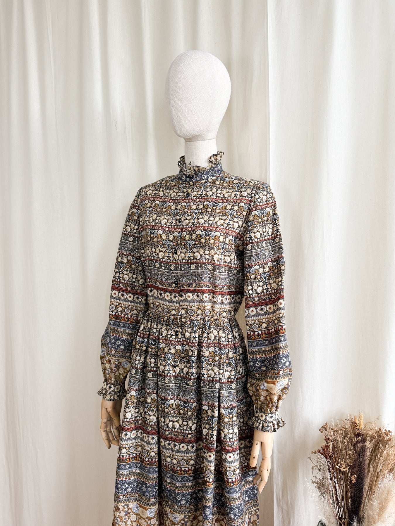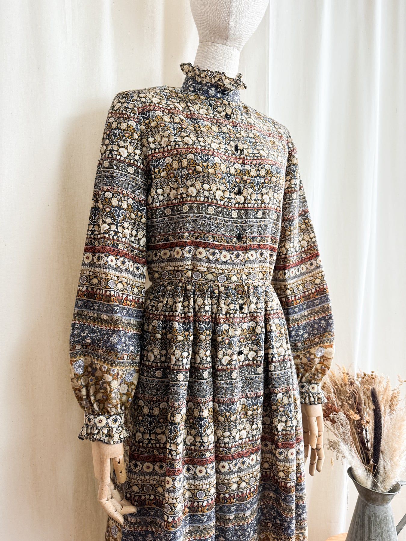 This rare 1970s Jaeger wool midi dress showcases a stunning autumnal palette with a unique, captivating print. Expertly tailored, it features a delicate frill collar, a button-through front, and frill-cuffed sleeves that add a refined vintage touch. Her warm wool fabric and elegant design make it an essential statement piece for seasonal wardrobes and perfect for styling all autumn winter round..