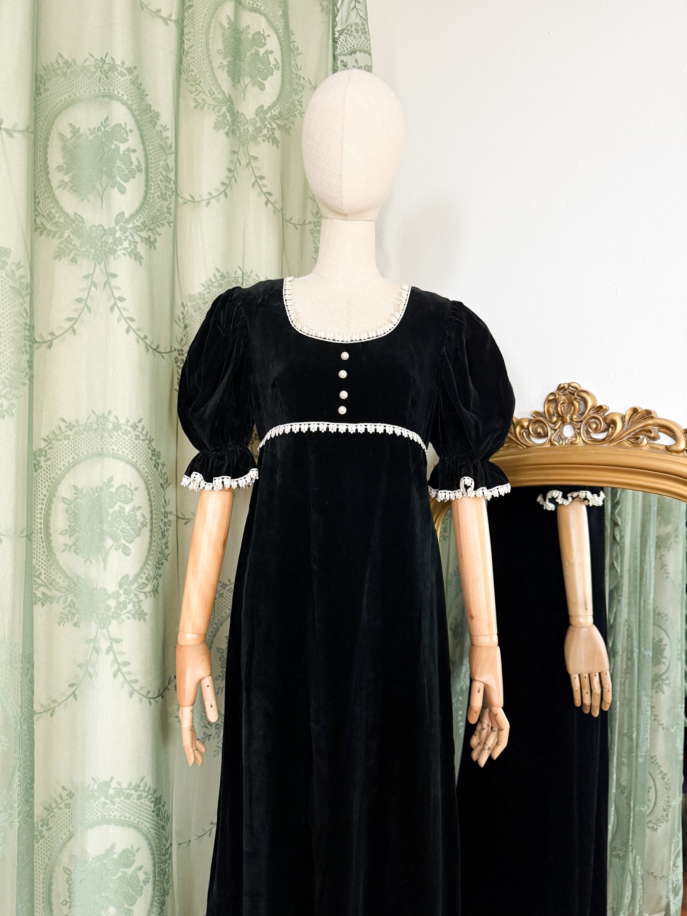 Lantern is an adorable yet haunting late 1960s black velvet maxi dress by Shelena. Featuring a flattering empire waist, short puff sleeves, and stunning lace trims, this dress strikes the perfect balance between delicate and witchy. Her slimline flowing skirt creates an elegant silhouette, enveloped in a dark, ethereal charm that captures the essence of gothic romance. A truly rare and captivating piece for those who appreciate timeless, mysterious style.