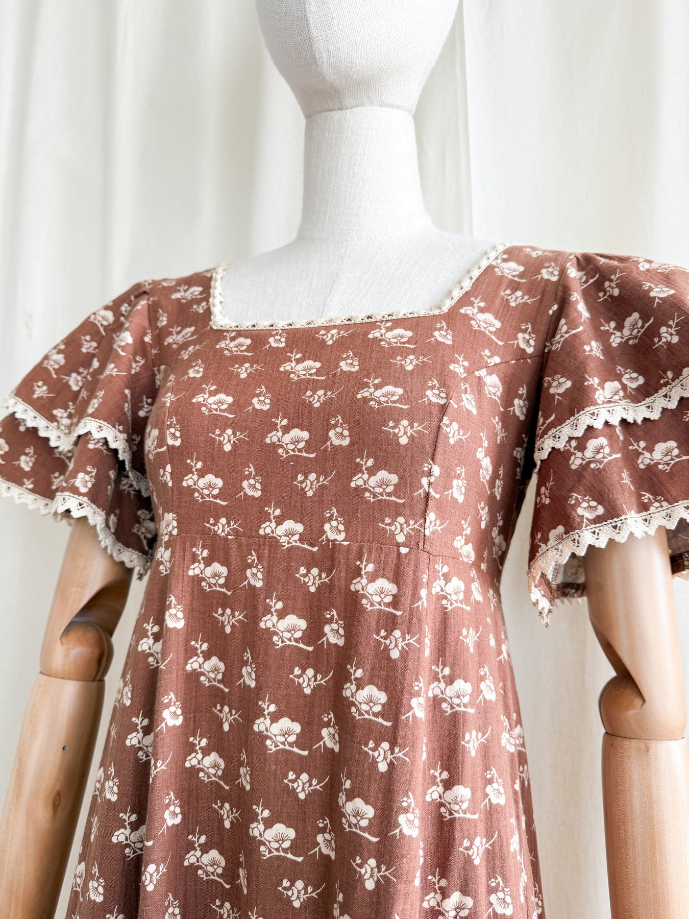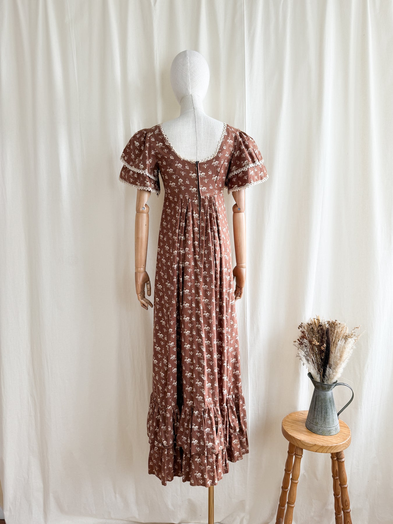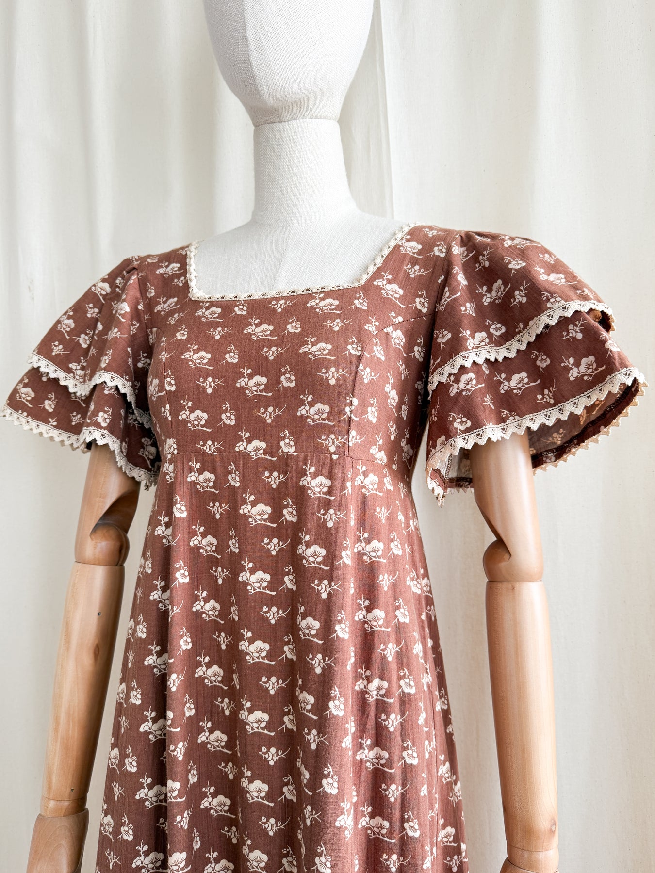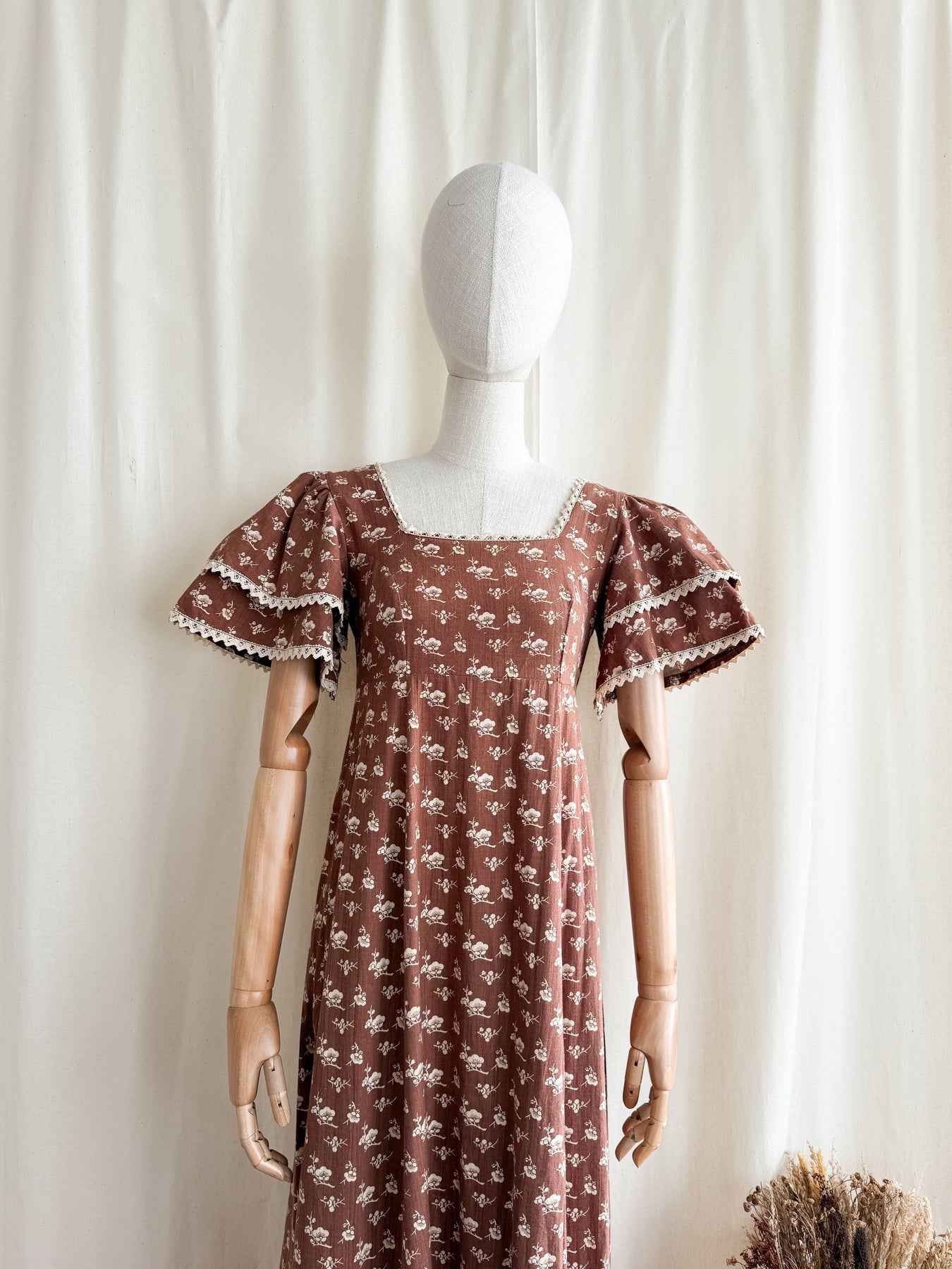 This is an absolute piece of vintage heaven! She is an incredible 1970s cotton romantic maxi dress by Laura Ashley Made in Wales in the most beautiful warm brown hue. She has beautiful layered flutter sleeves, empire line waist and a super full skirt with flounce. Her waist is gathered at the back, giving an absolutely stunning swoosh to that gorgeous skirt. She has gorgeous cotton lace trims and her print is simply beautiful. She is the most perfect autumnal vintage beaut to cherish forever.