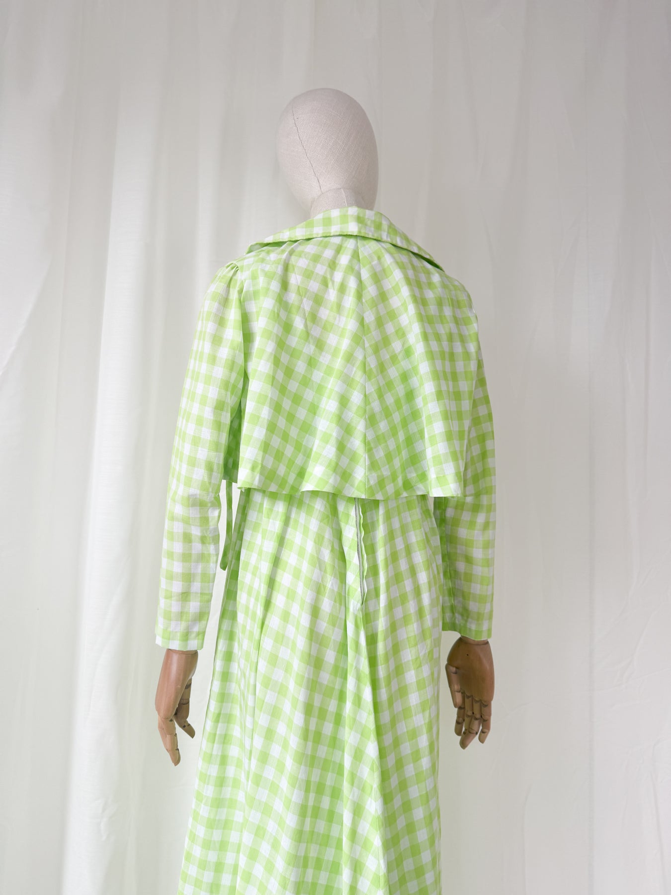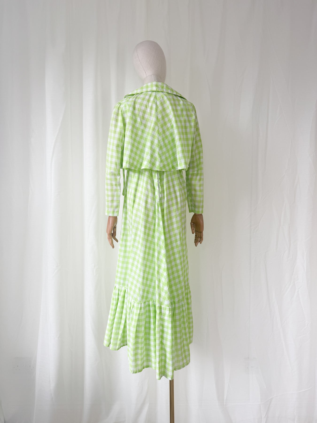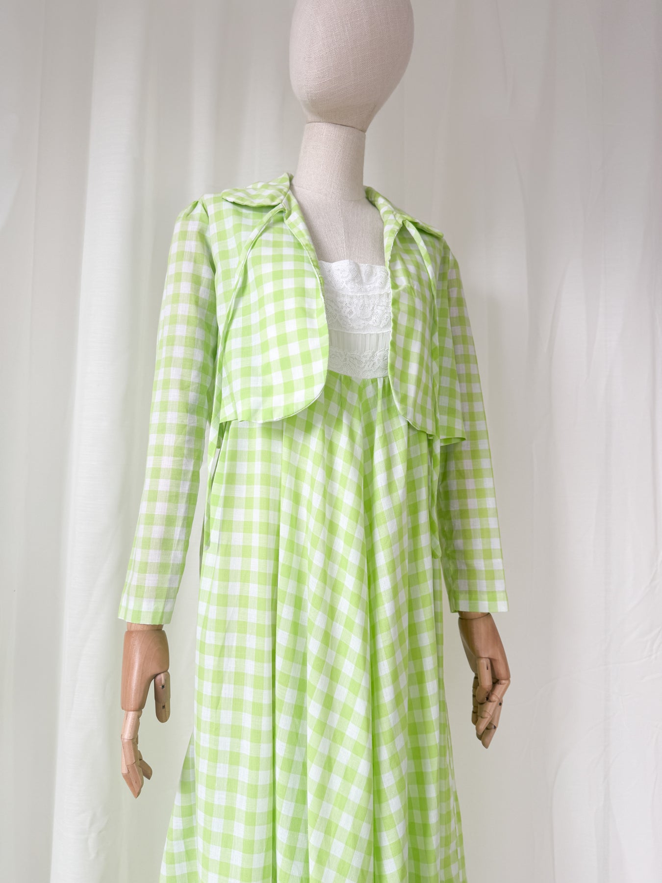 The sweetest little jacket and dress set there is! This rare beauty is by coveted British boutique label Travers Tempos and is crafted from a gorgeous lime green gingham with lace bodice! She is something to cherish forever and reach for year after year!