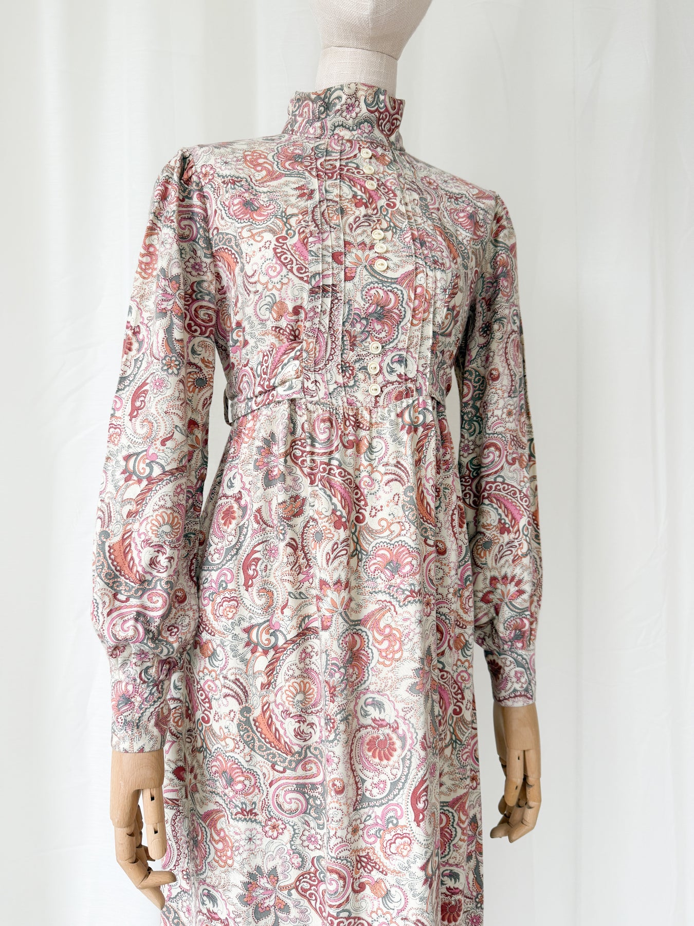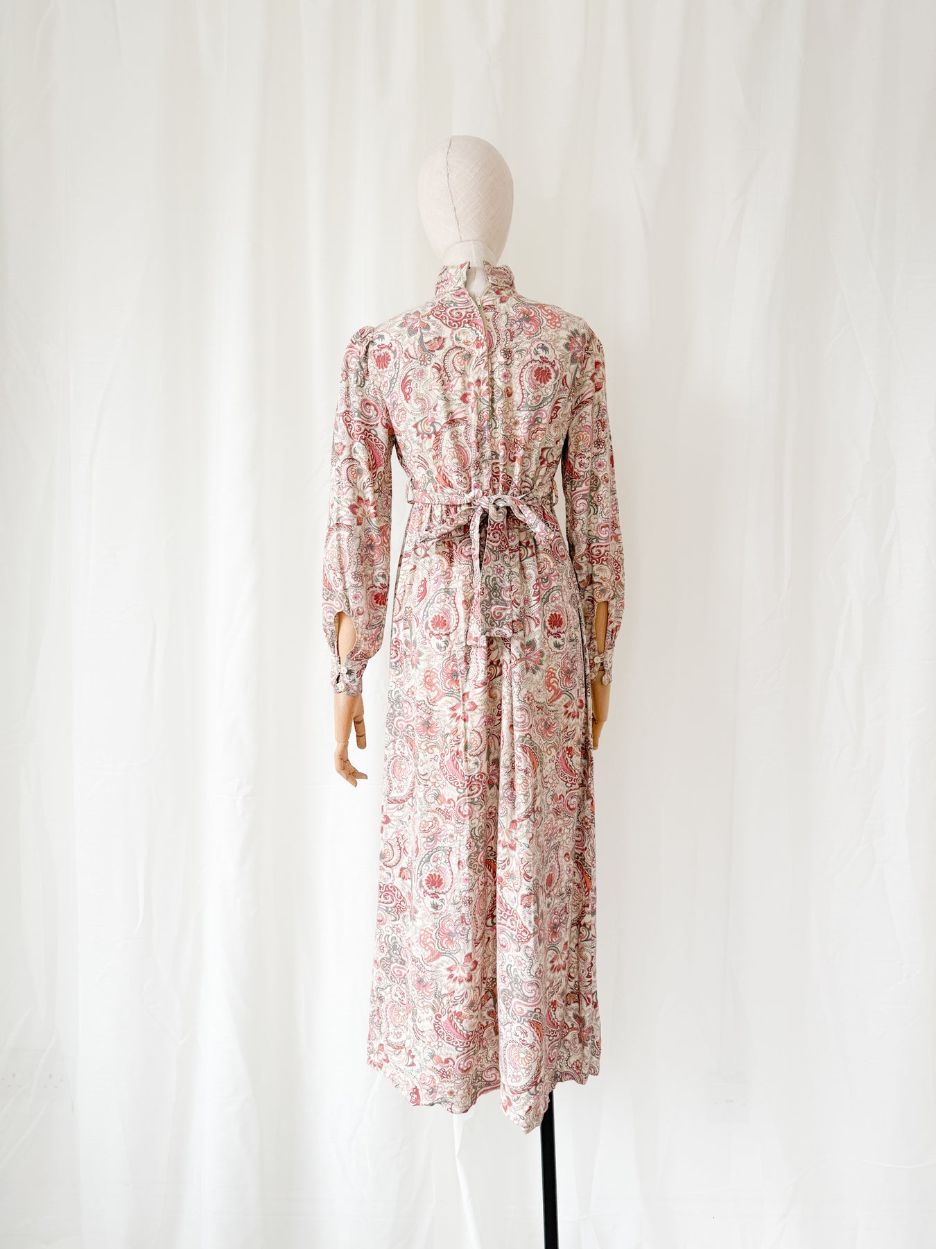 This stunning dusky hued dream by collectible british boutique label Ann Reeves is something truly precious to behold. She has a stunning print, the most divine high quality drapey wool blend crepe style fabric and a stunning easy to wear silhouette. When worn she will be stunning and truly is something to cherish forever.