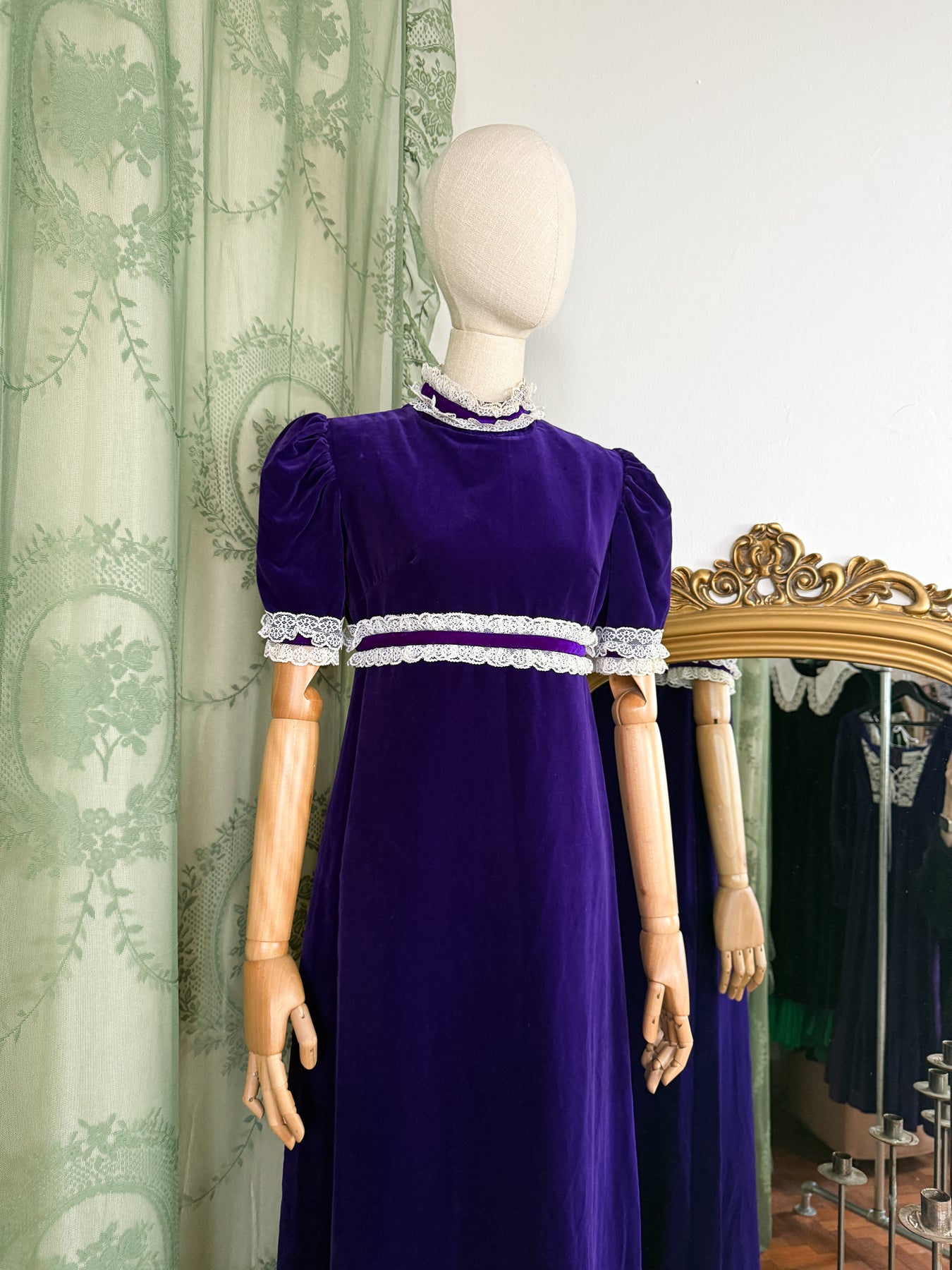 This stunning rare late 1960s John Charles velvet maxi dress is a precious find, featuring an extraordinary purple shade adorned with beautiful lace trim details. Its puff sleeves and mesmerising slinky silhouette create a hauntingly alluring presence so full of that heirlooms energy we all adore.