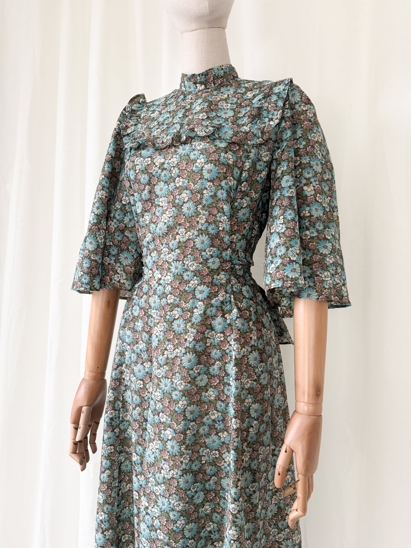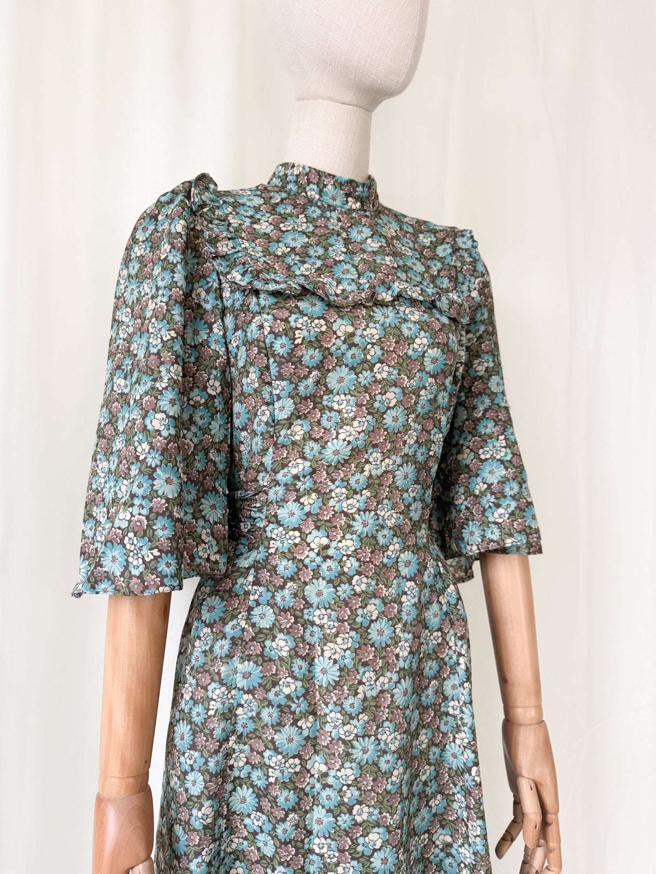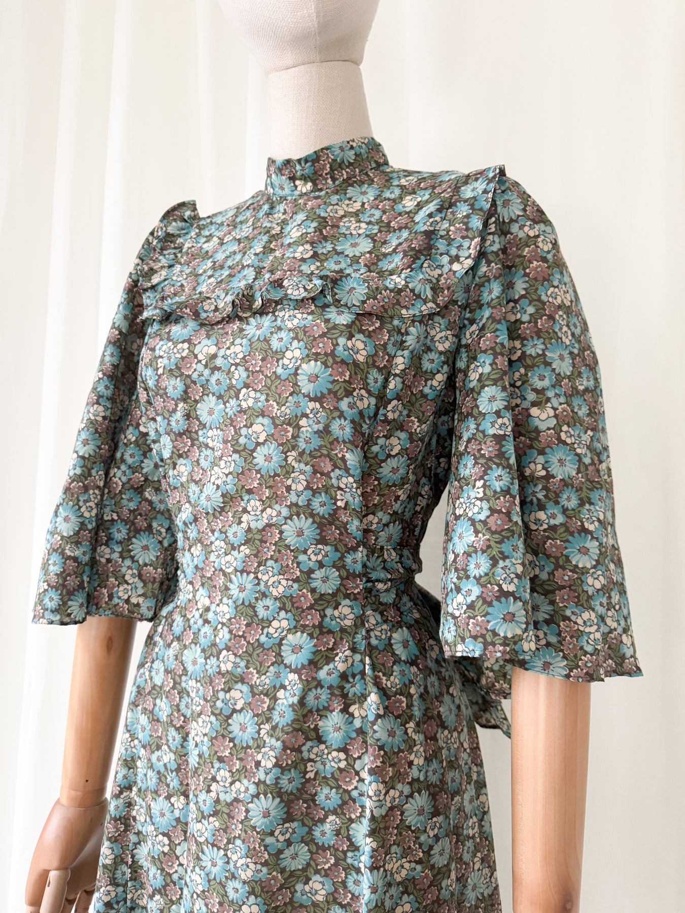 This is one of my favourite vintage silhouettes, with the most beautiful flutter sleeves and frilled yoke, she is forever romantic and timeless. She has a gorgeous colour palette with soft floral, is made from a flowy lightweight cotton blend, and is by the brand English Lady.
