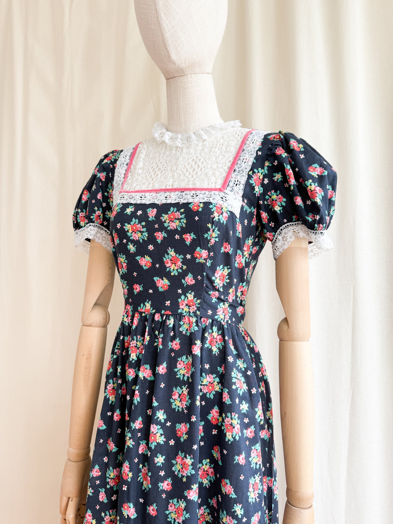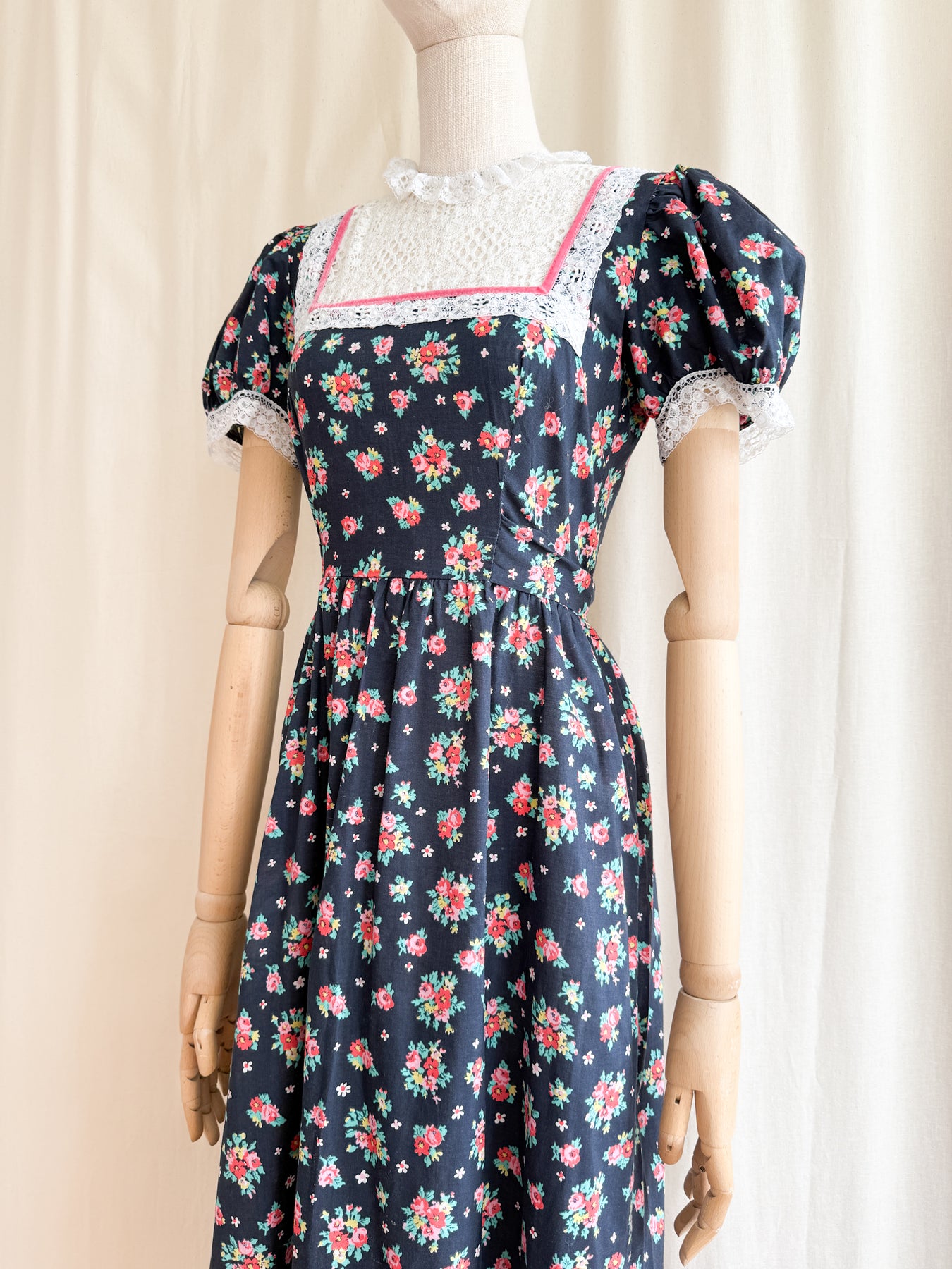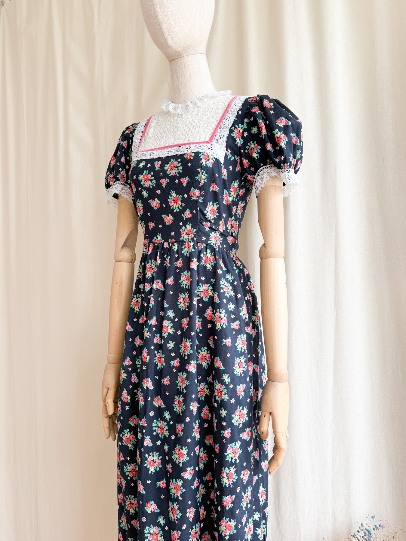 Picnic perfect, this is an absolute dreamworthy rare 1970s black cotton prairie dress in the most stunning dark floral colour palette.. This is one of them staple 70s dreams which will always look amazing and can be styled in so many ways.. She has a stunning lace yoke and puff sleeves, and is beautifully crafted from a soft cotton.. If there ever was a perfect all year around dream dress, this is it..