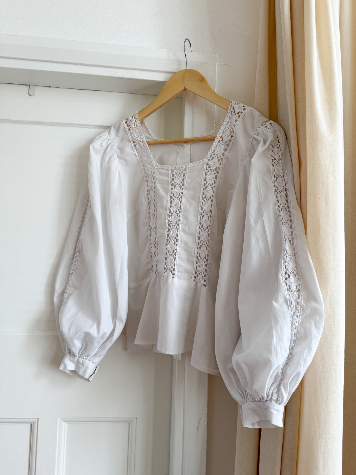 This is a rare and precious soft white cotton 70s blouse with the most gorgeous billowing sleeves and crochet cotton lace detailing. She is such a staple and truly a precious find.