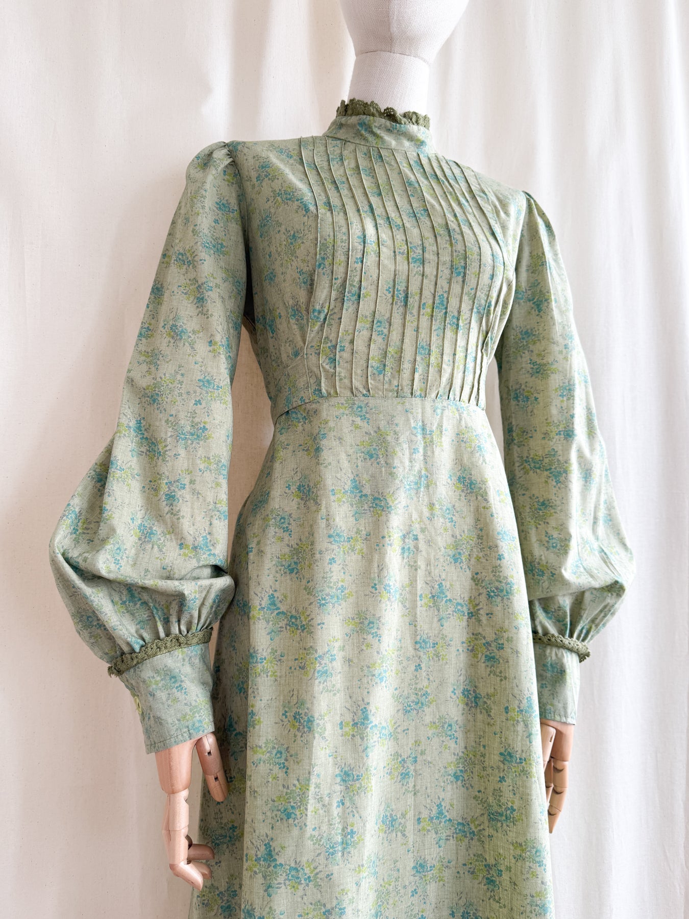 The Beautiful Rare 70s Green Soft Cotton Maxi Dress by Zanie is a stunning vintage dream featuring a soft fern khaki green shade complemented by a delicate floral print. Crafted from soft light breathable cotton with beautiful crochet lace trims, this dress offers both comfort and timeless style, embodying the relaxed elegance of the 1970s. Its flowing maxi silhouette and subtle botanical design are a piece of true vintage heaven which could transcend between all seasons.