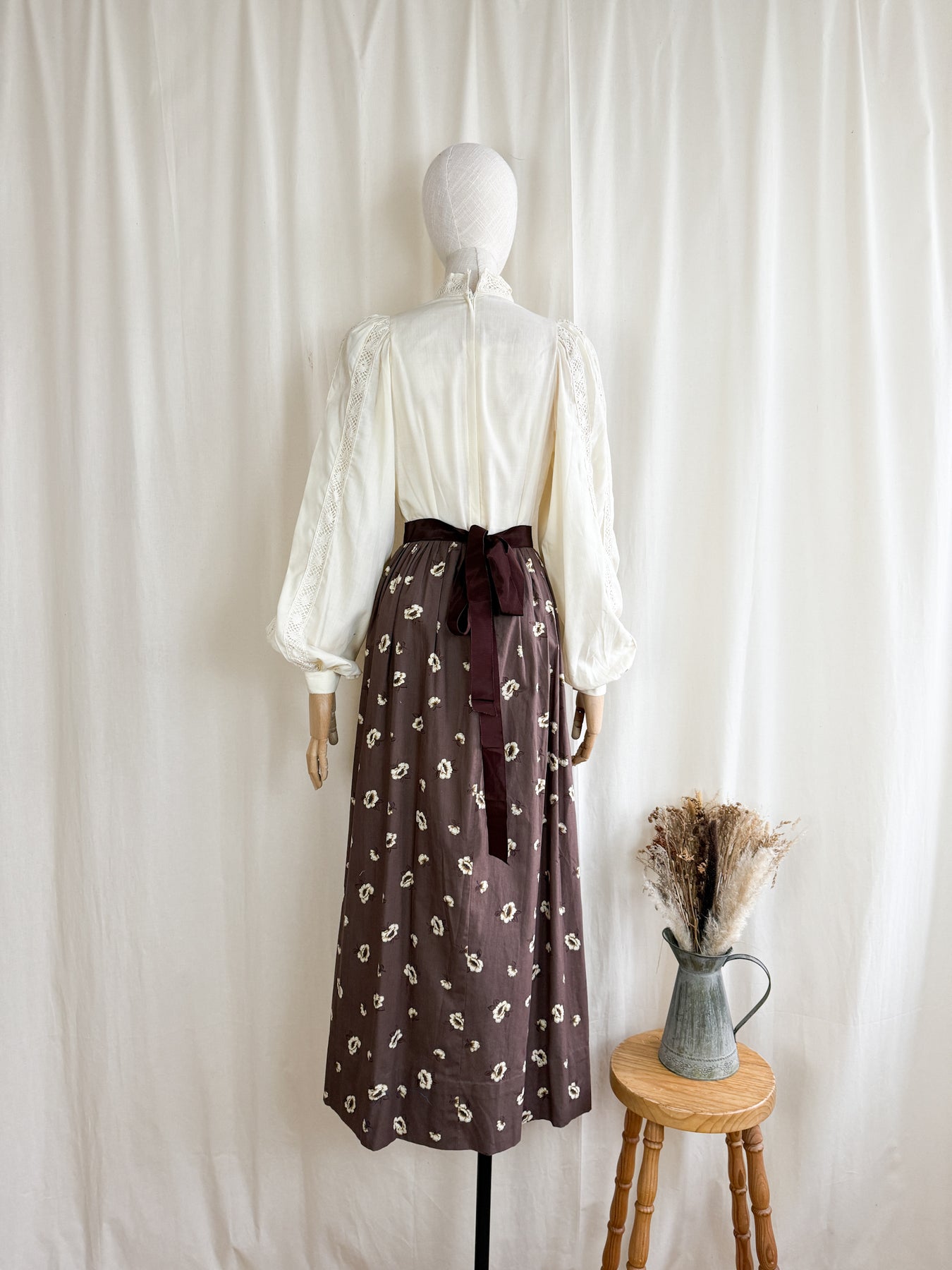 This exquisite romantic 1970s maxi dress combines incredibly soft cotton fabric with delicate design details for a forever beautiful look. Featuring a cream bodice paired with a brown floral skirt, she is enhanced by cotton lace trims and an attached ribbon sash that cinches the waist elegantly. The dreamy floral print evokes autumnal charm, making her a versatile treasure that effortlessly complements seasonal styling, and when worn with boots she will be simply insane.