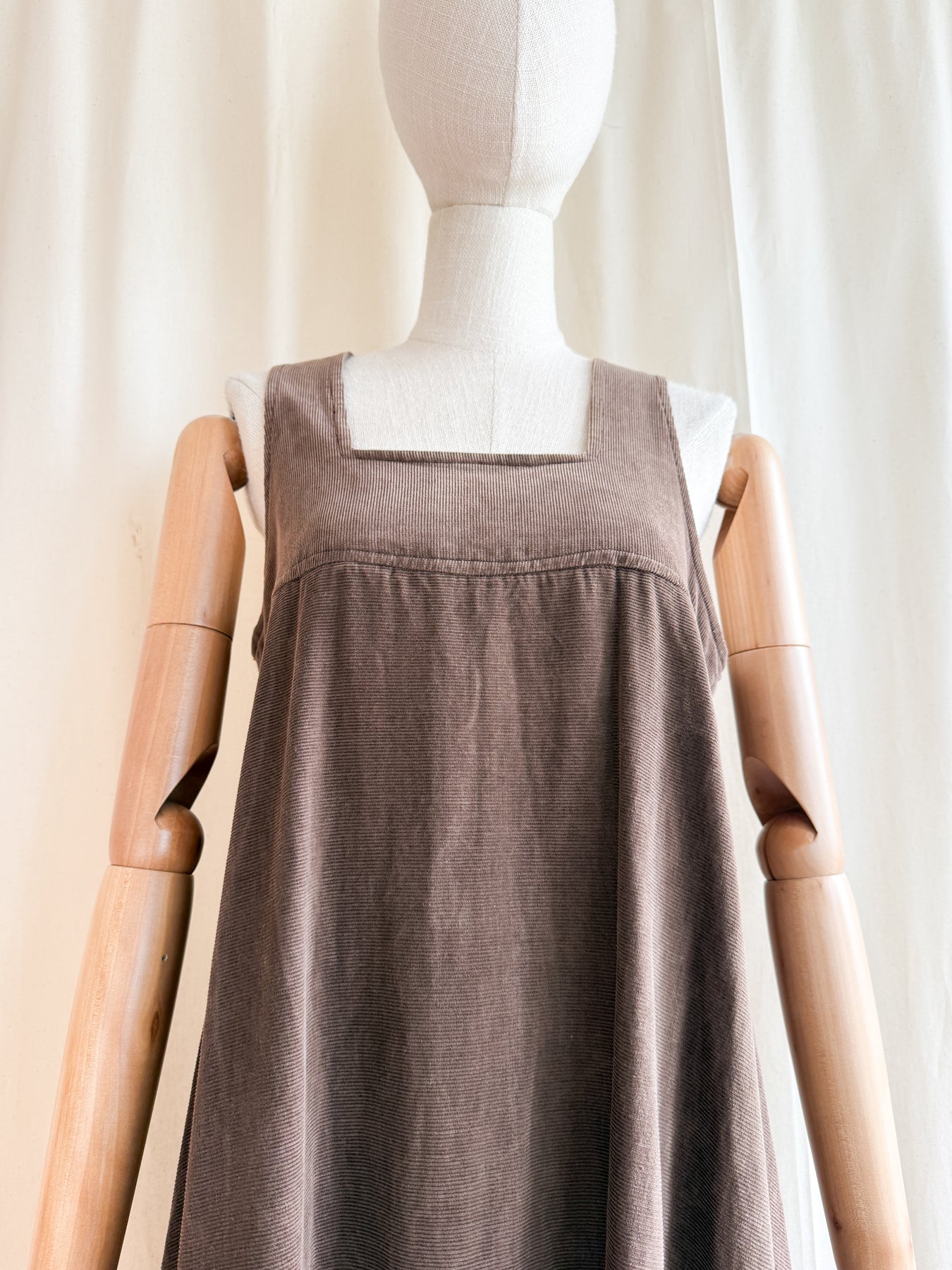 This breathtaking RARE 1970s soft brown cotton needlecord pinafore by Chloes Clothes features a tiered, swooshing maxi skirt crafted from beautifully soft, heavy cotton fabric. Exuding a witchy, old-world charm, this rare piece combines substantial texture with voluminous movement, making it a truly special and collectible vintage treasure perfect for styling in so many ways all season...