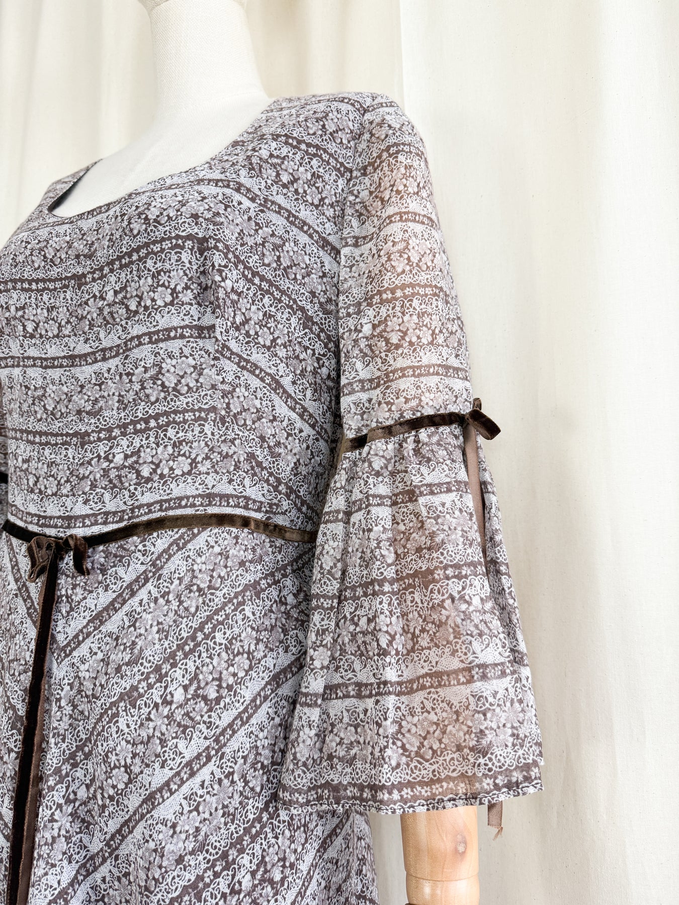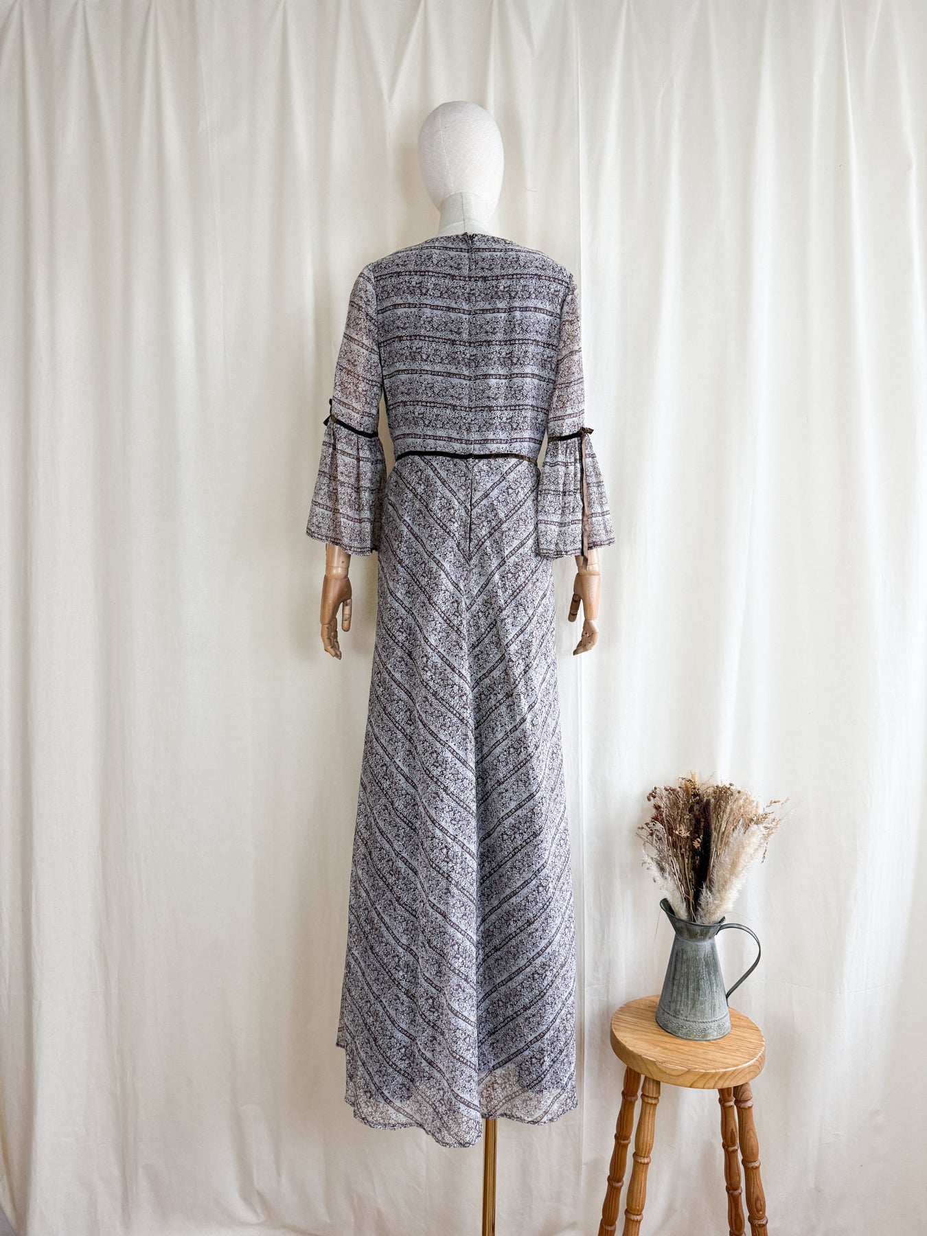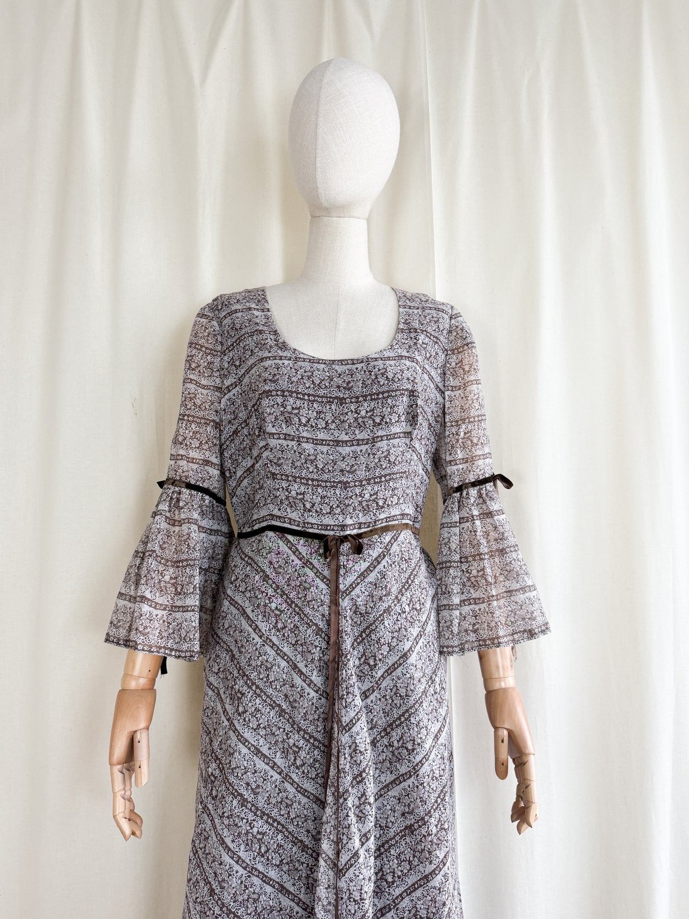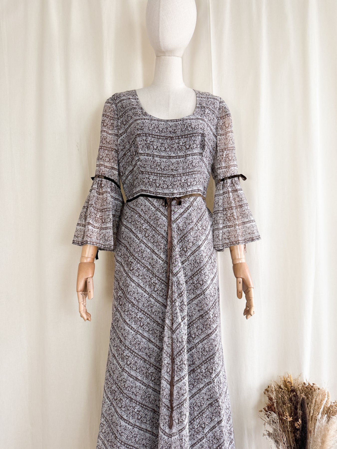 This romantic 1970s bohemian maxi dress features lightweight, soft cotton in a warm brown shade detailed with an intricate paisley-style floral print. Her ethereal silhouette is enhanced by flared flute sleeves and refined brown velvet ribbon trims, evoking a timeless historical elegance. She is just truly so magical and will look incredible when worn in the autumn winds..